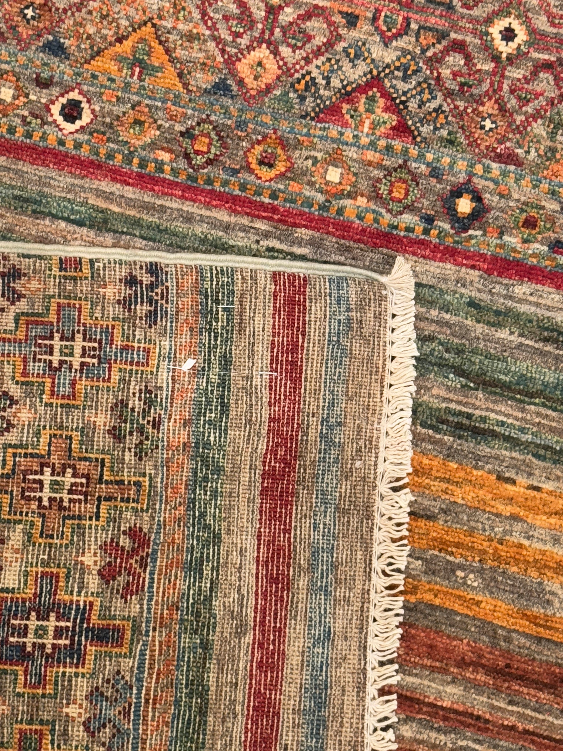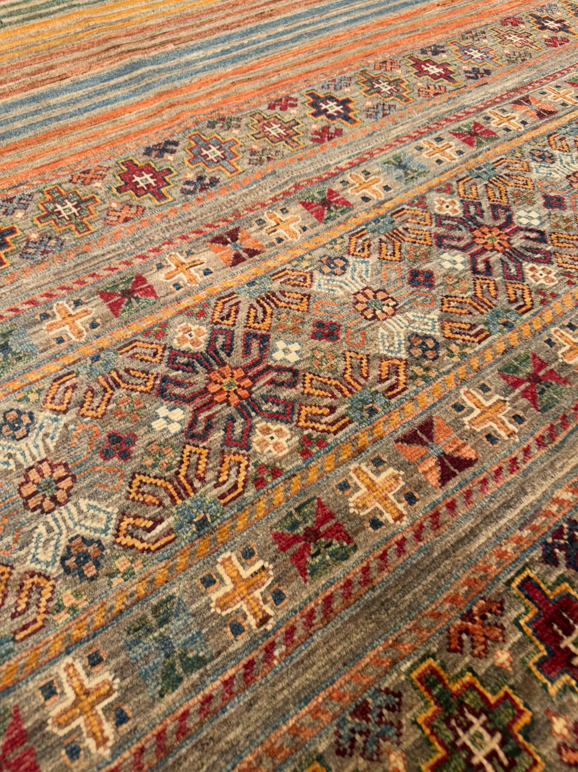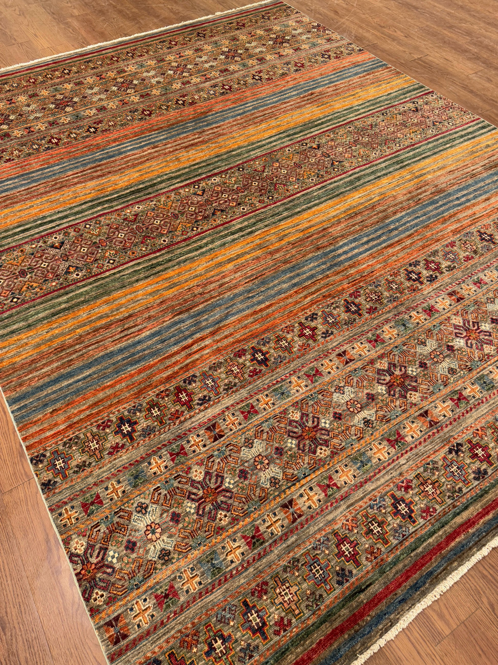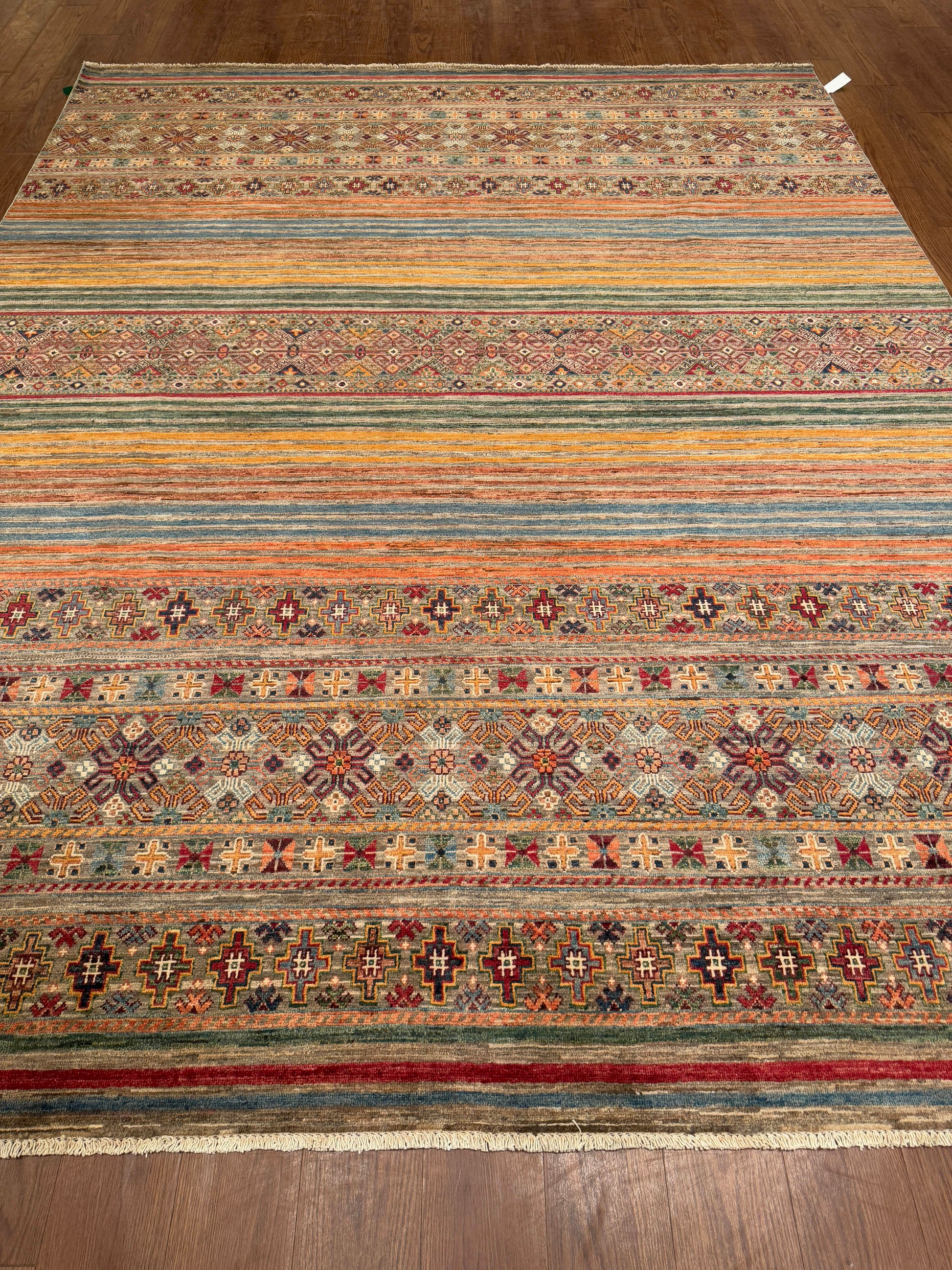 This handmade rug features a captivating blend of horizontal bands filled with geometric motifs and tribal-inspired patterns. The earthy palette of terracotta, olive, gold, and soft blue tones creates a warm and inviting aesthetic that radiates character and depth. Its intricate symmetry and textural richness make it a versatile foundation piece for eclectic or bohemian interiors.