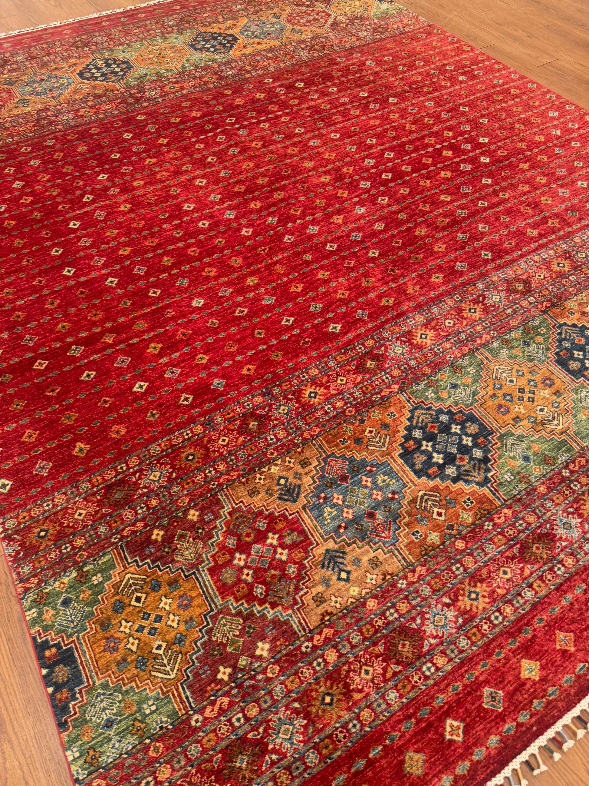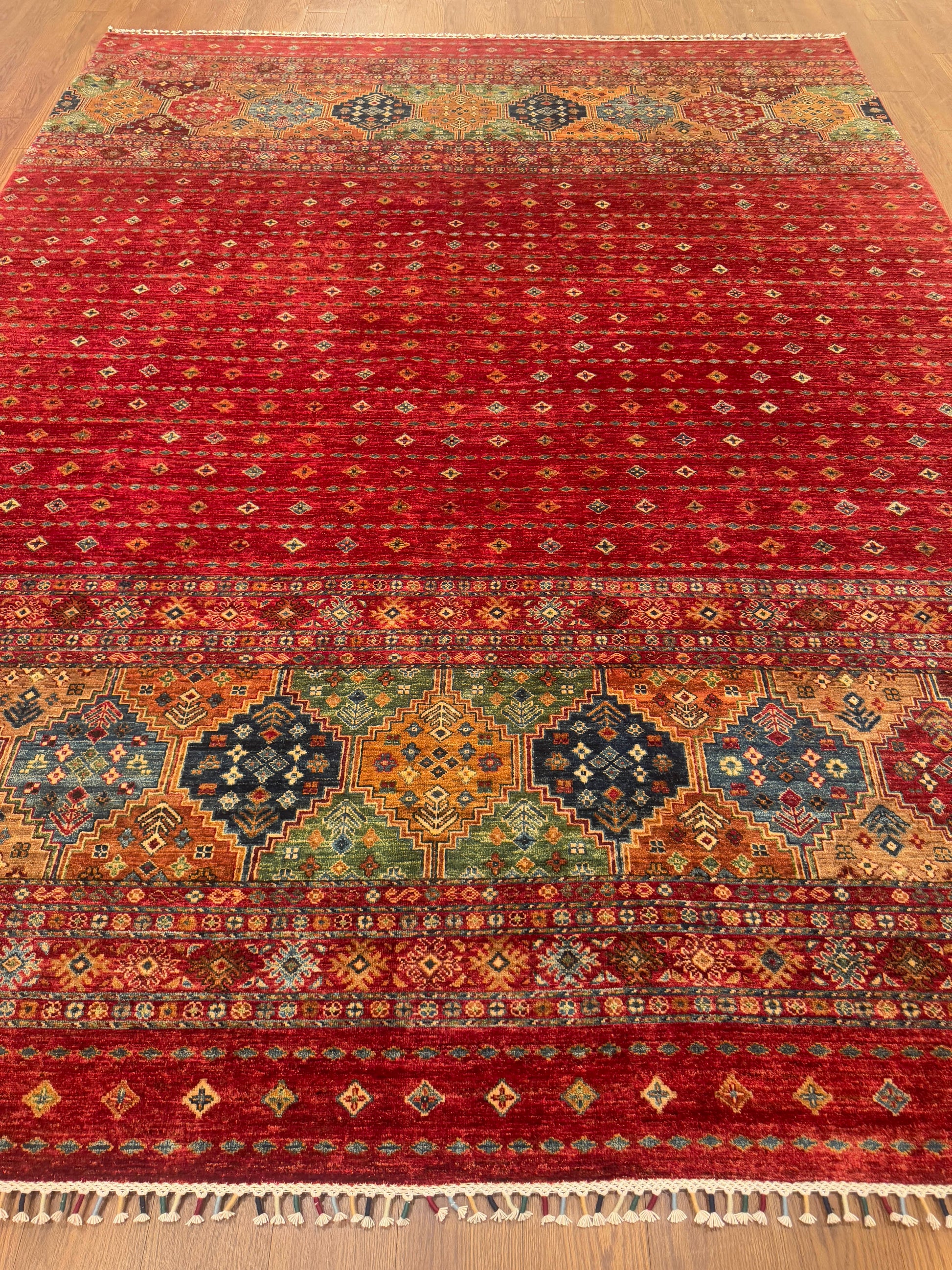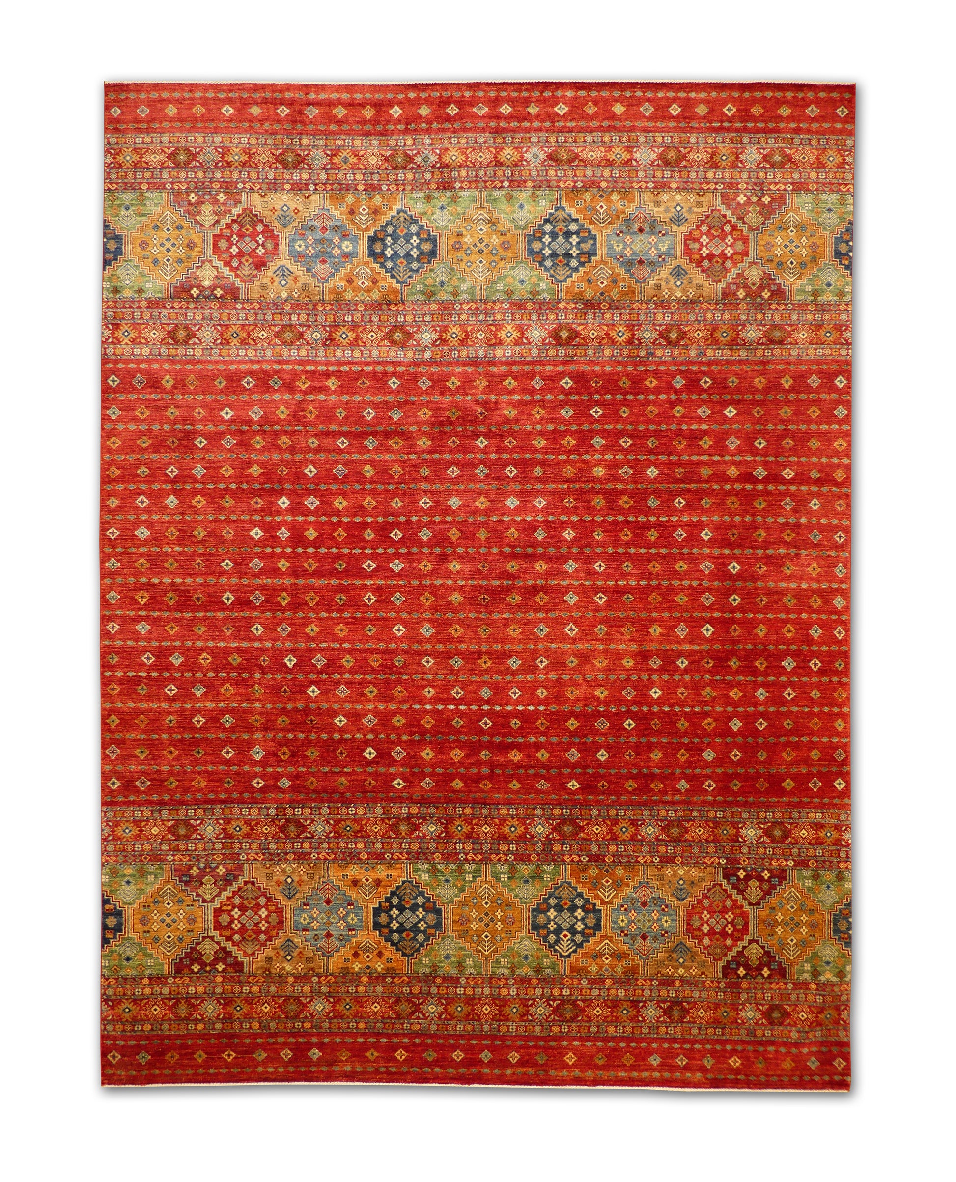 This handmade rug features a stunning fusion of vibrant colors and intricate geometric detailing. The field displays a cascading gradient of small diamond motifs over a bold red base, complemented by richly patterned medallions in shades of gold, green, and blue. Meticulously crafted from fine wool, this piece balances tradition and modern flair, creating an inviting focal point for any space.