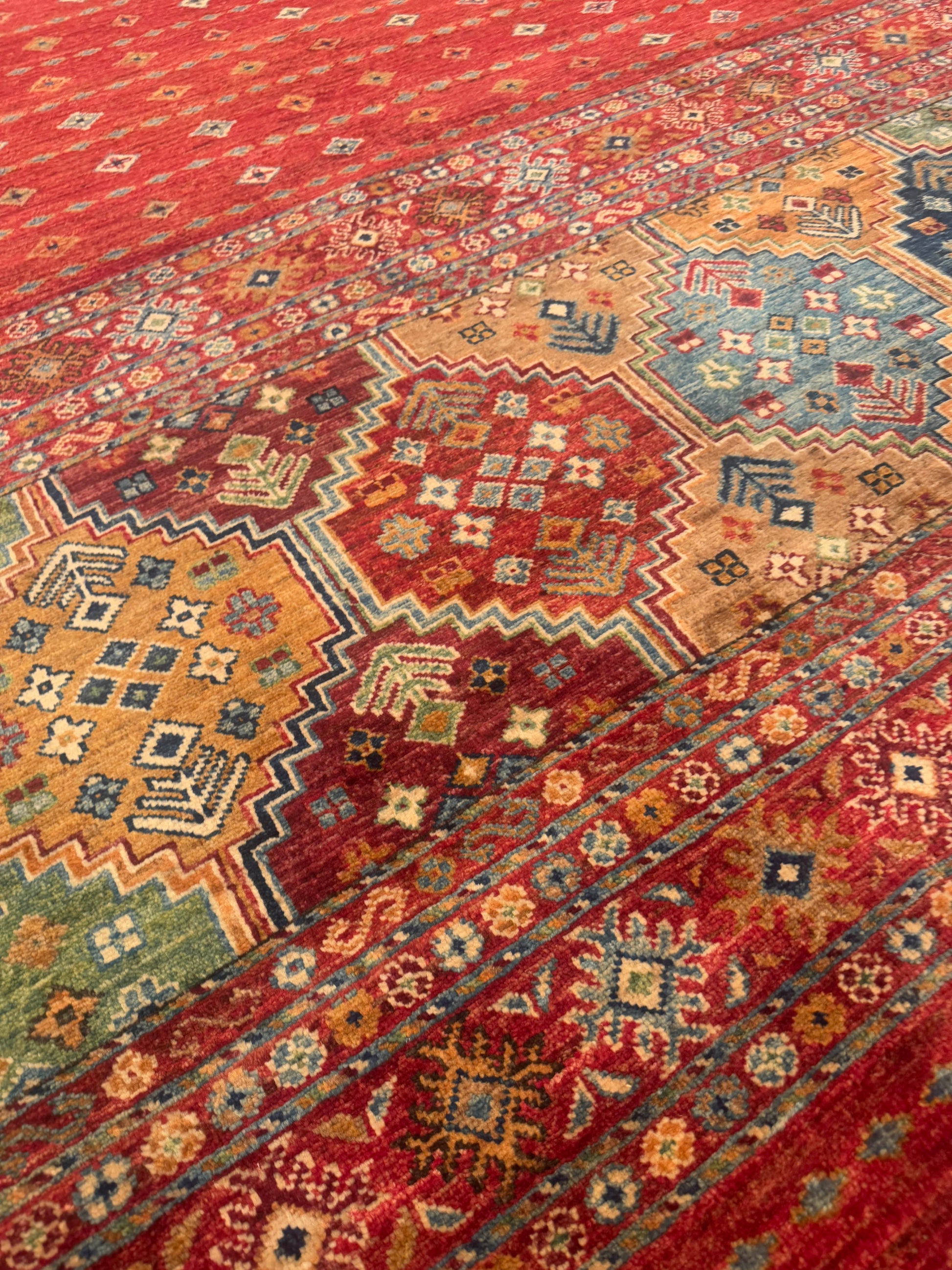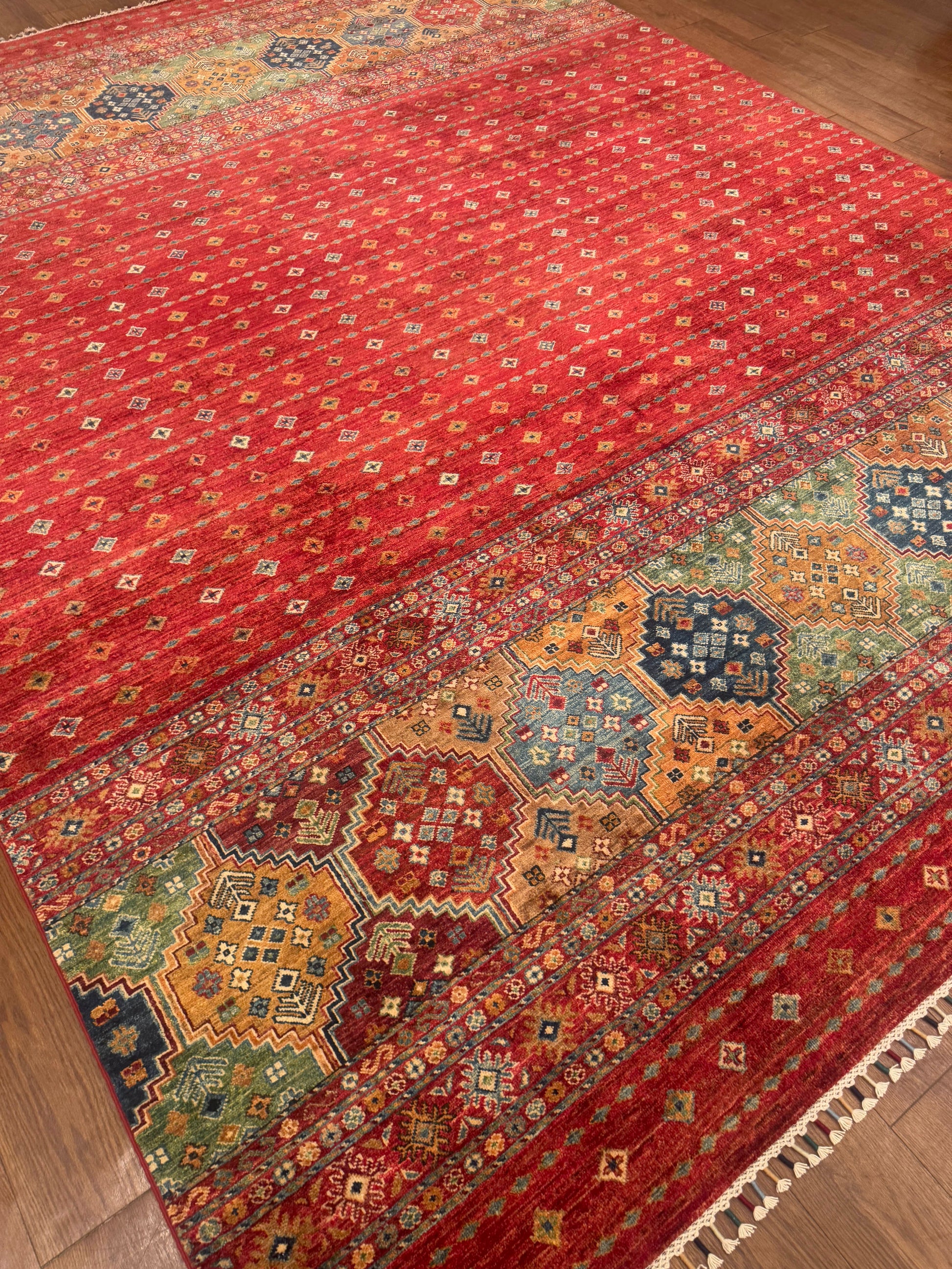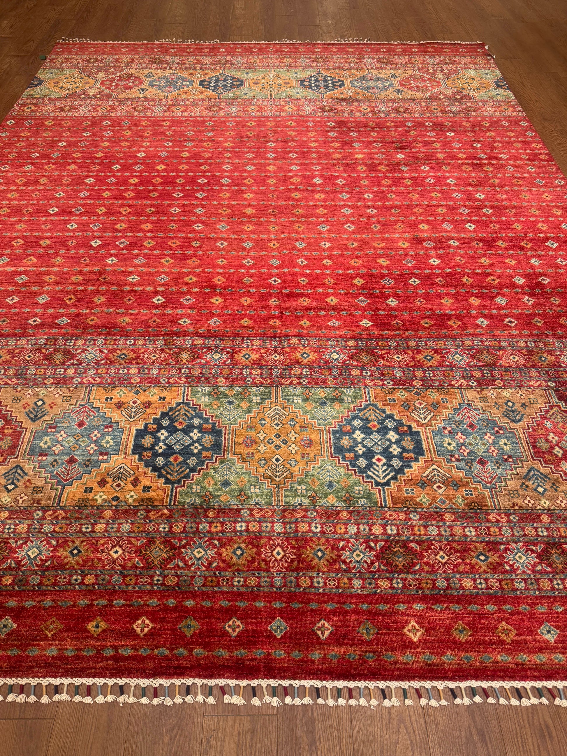This handmade rug features a stunning fusion of vibrant colors and intricate geometric detailing. The field displays a cascading gradient of small diamond motifs over a bold red base, complemented by richly patterned medallions in shades of gold, green, and blue. Meticulously crafted from fine wool, this piece balances tradition and modern flair, creating an inviting focal point for any space.