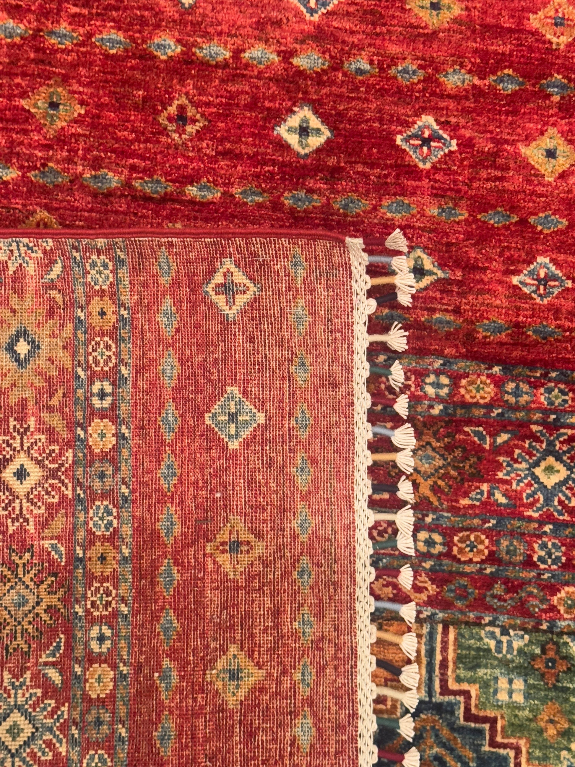 - Design: Repeating diamond motifs with geometric medallion bands