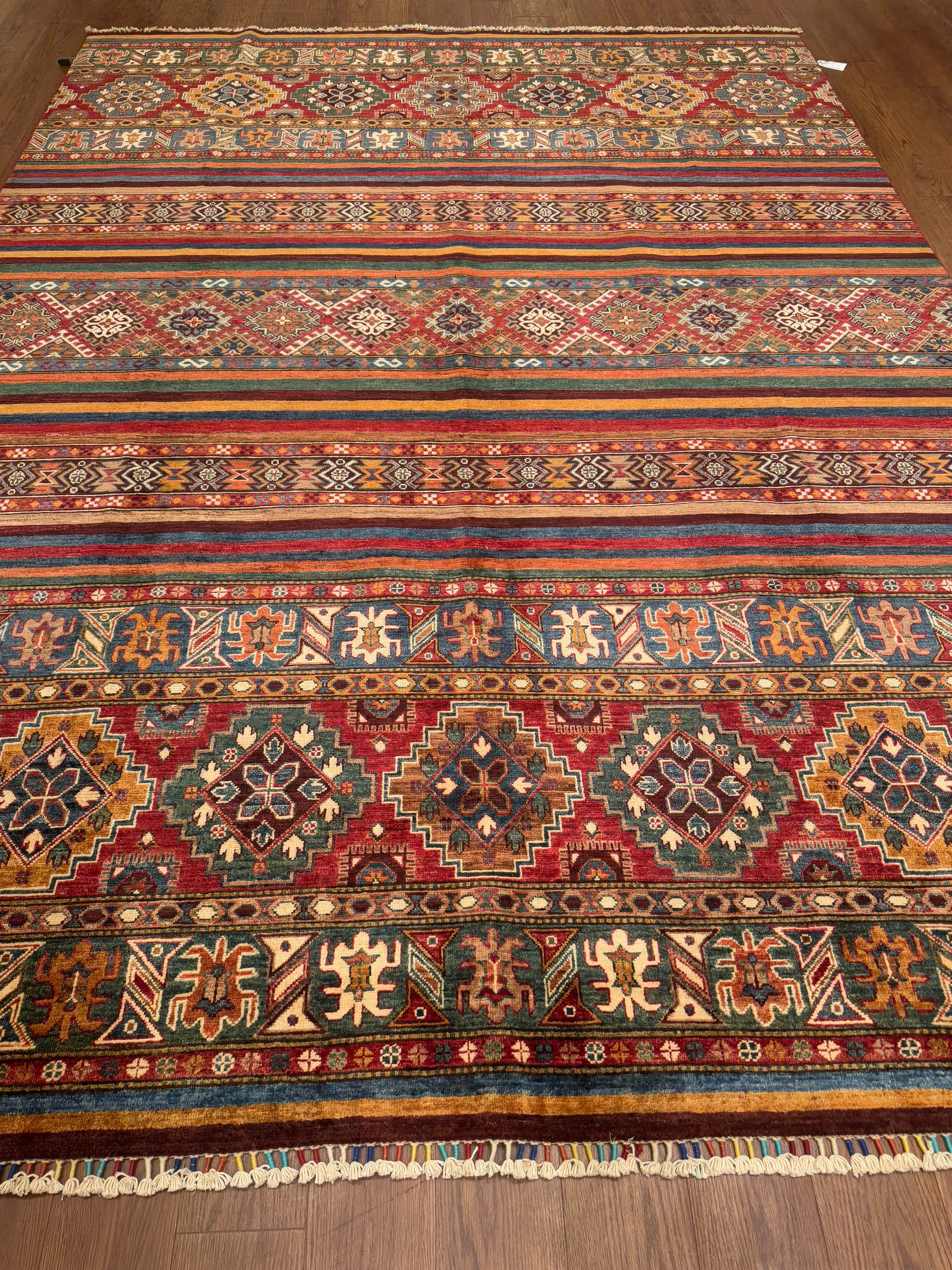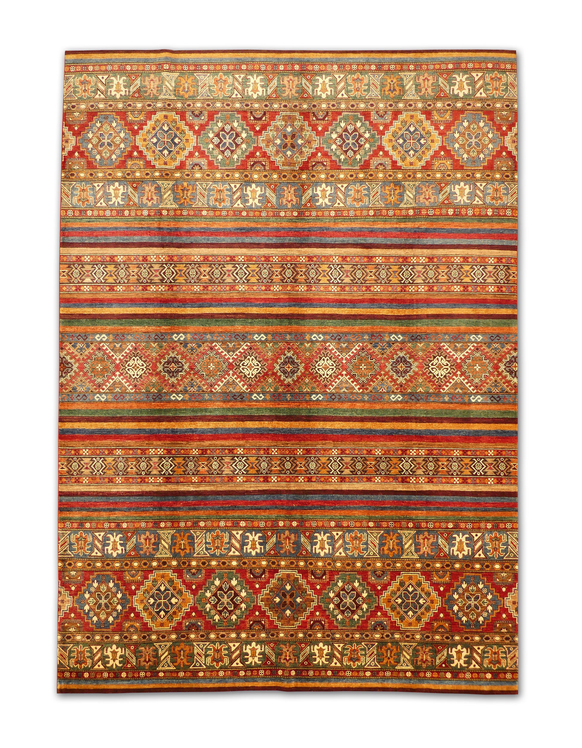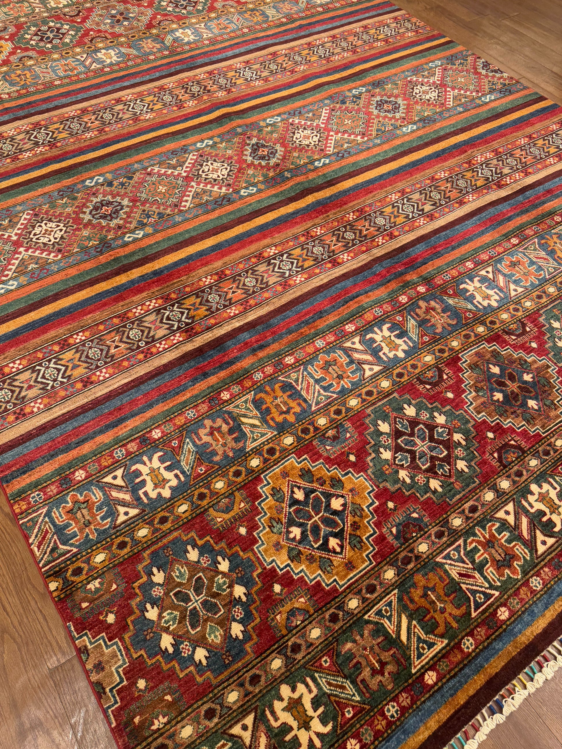 This handmade rug features a striking tribal stripe design composed of intricate geometric medallions and traditional motifs. The warm palette of rust, olive green, mustard, ivory, and deep indigo creates a dynamic rhythm across the horizontal bands, giving the rug a rich sense of movement and depth. Perfect for adding color and cultural flair, it blends seamlessly in bohemian or rustic-modern spaces.