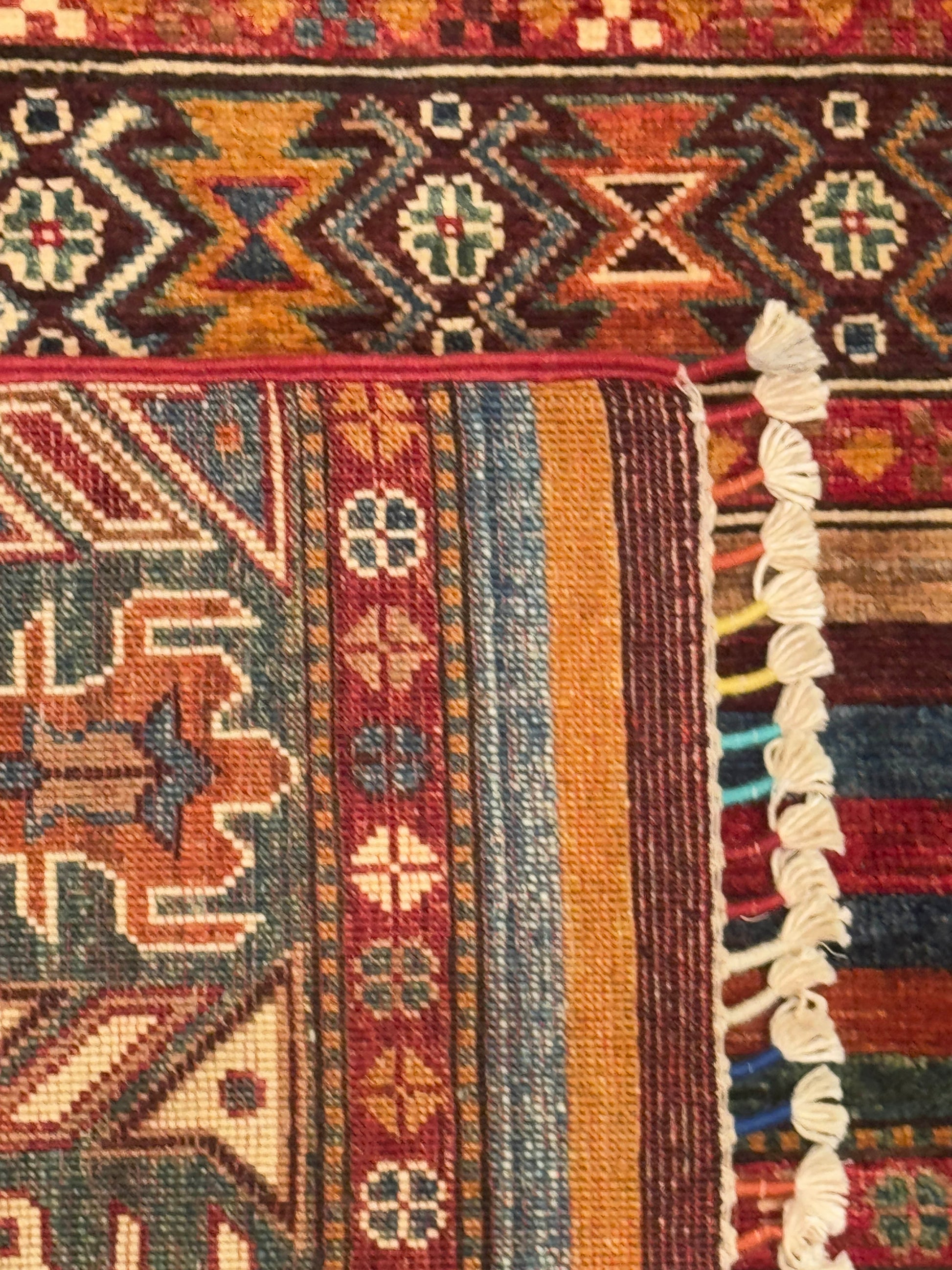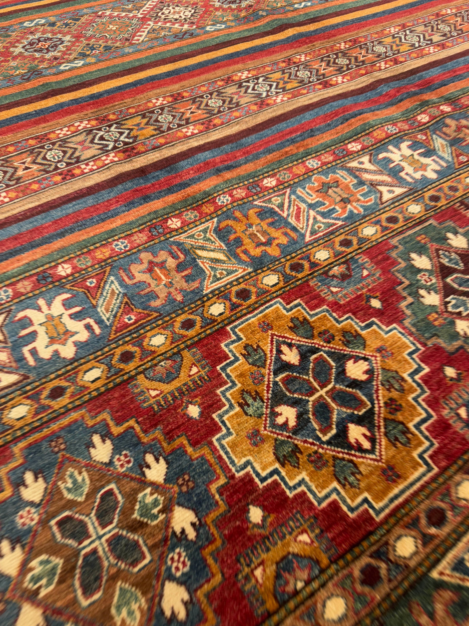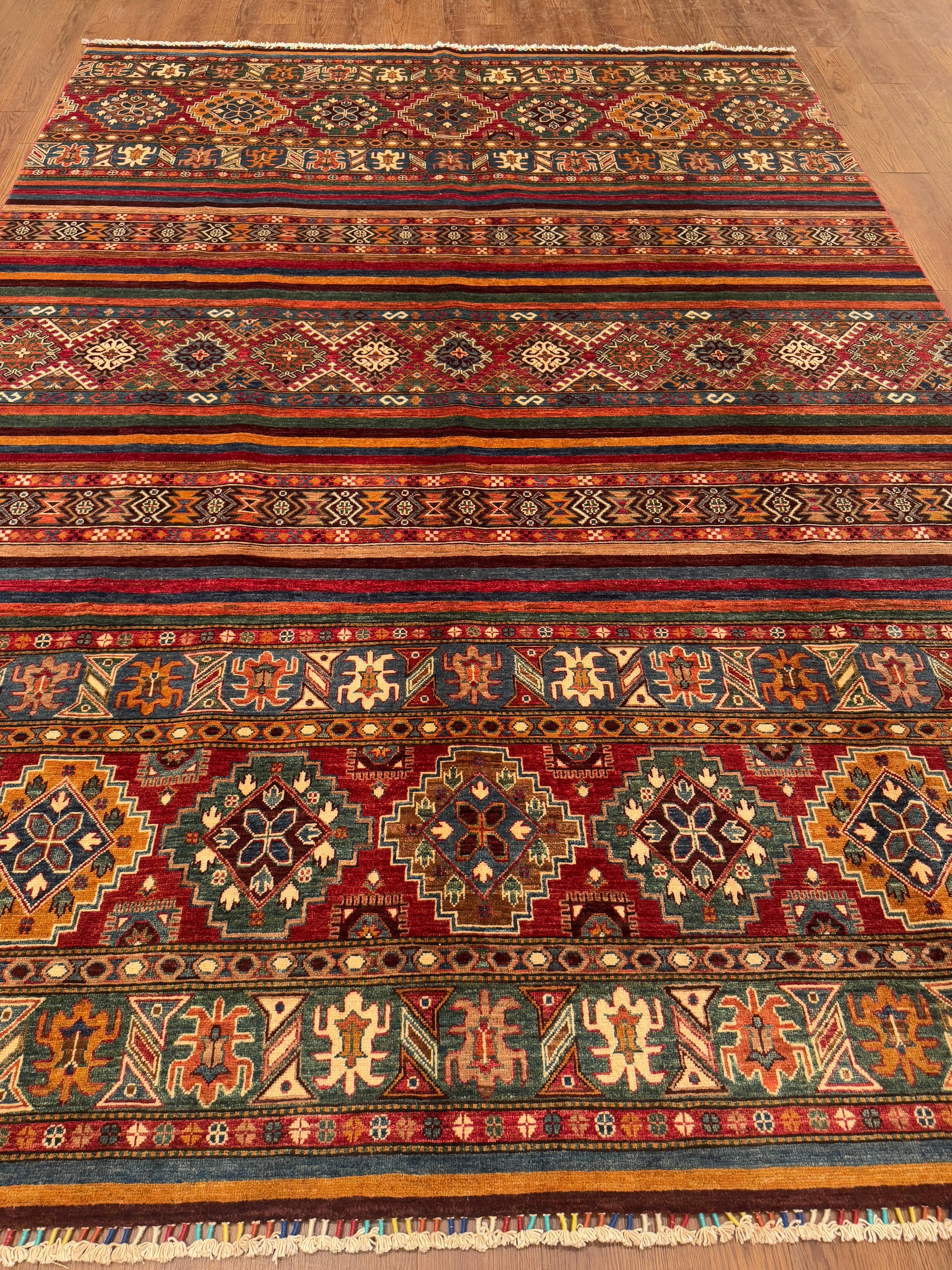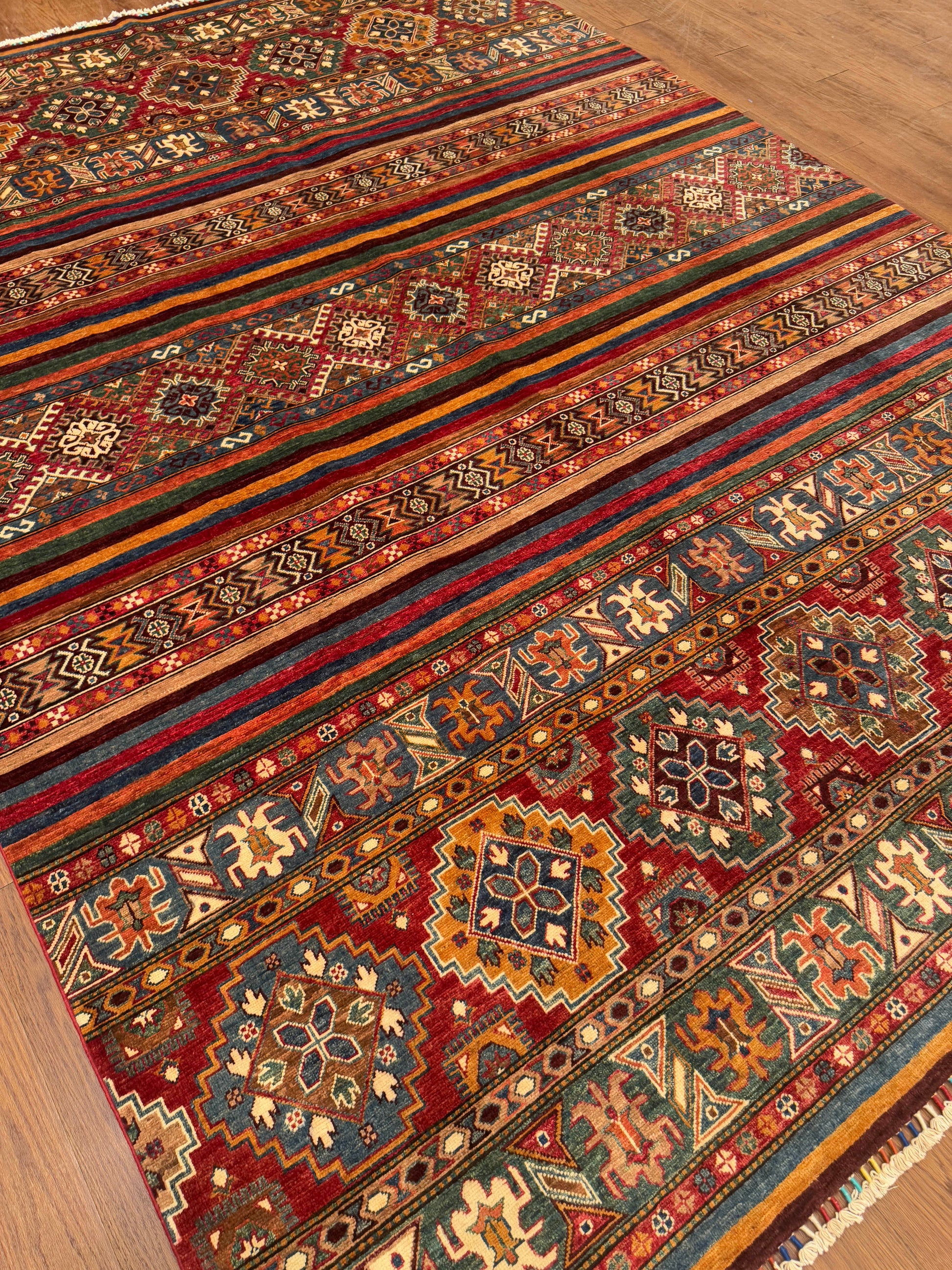 This handmade rug features a striking tribal stripe design composed of intricate geometric medallions and traditional motifs. The warm palette of rust, olive green, mustard, ivory, and deep indigo creates a dynamic rhythm across the horizontal bands, giving the rug a rich sense of movement and depth. Perfect for adding color and cultural flair, it blends seamlessly in bohemian or rustic-modern spaces.