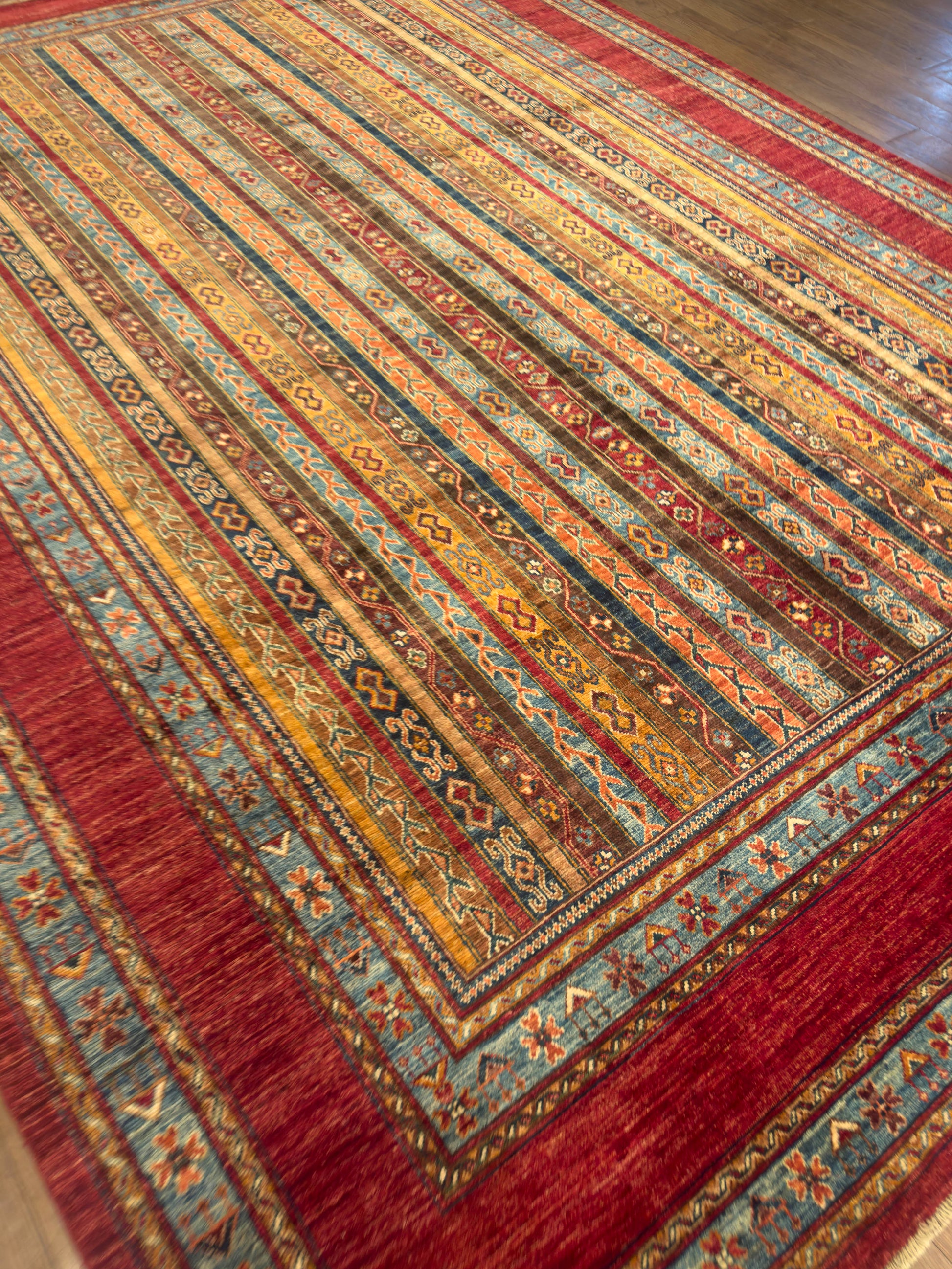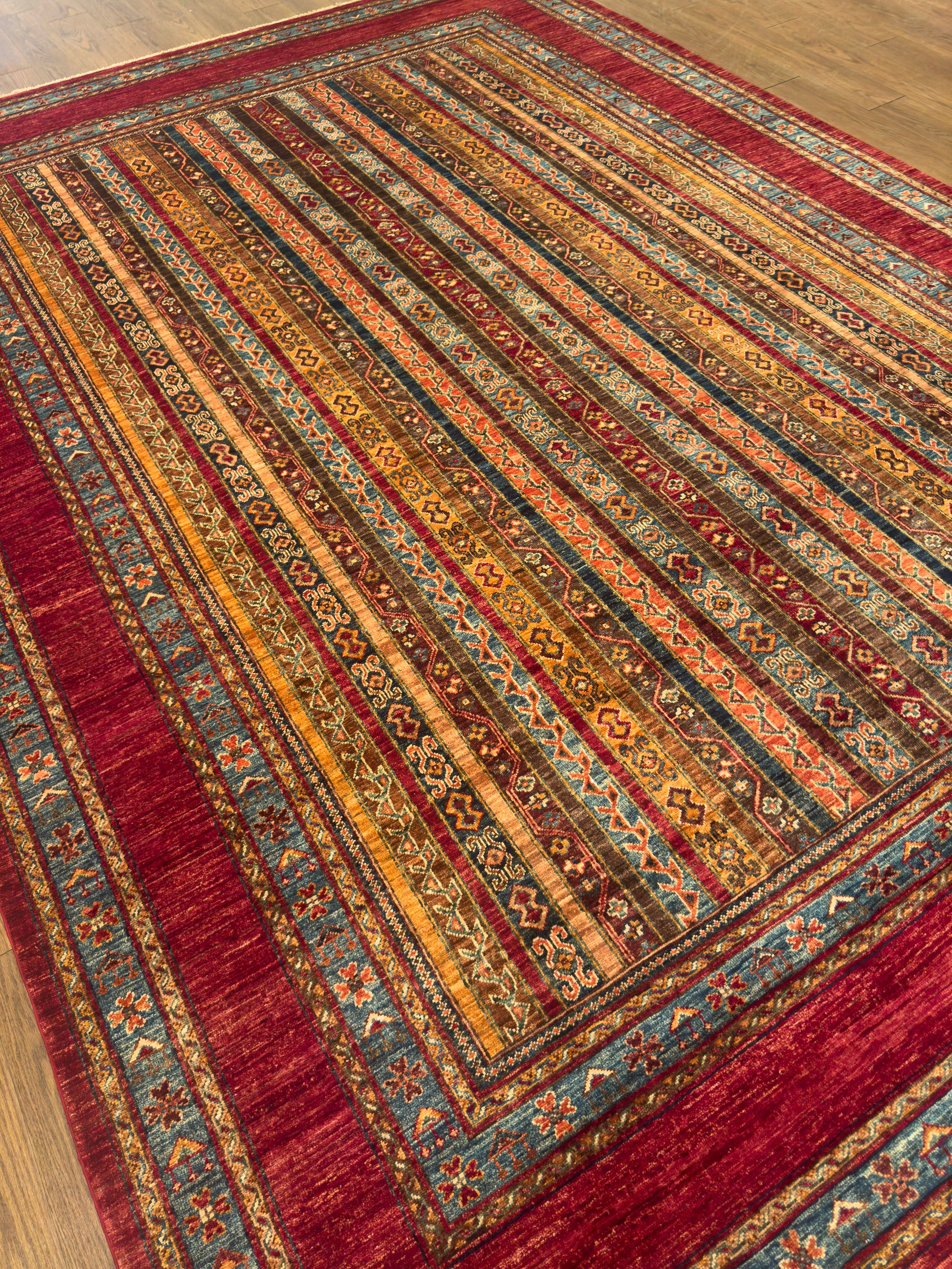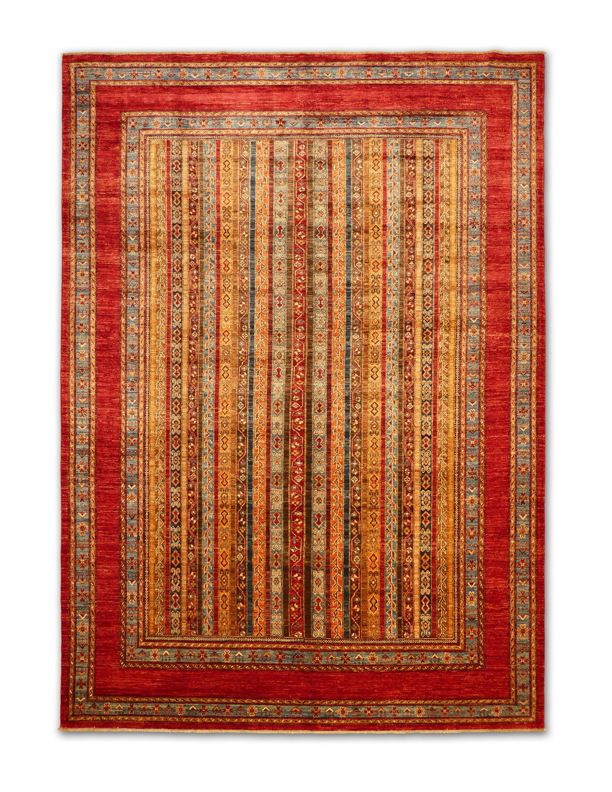 This handmade rug features a striking vertical stripe composition woven in rich tones of red, gold, teal, and earthy brown. Each stripe carries intricate tribal motifs, creating rhythm and harmony across the design. The warm palette and linear balance give this rug a timeless versatility, complementing both modern and traditional interiors beautifully.