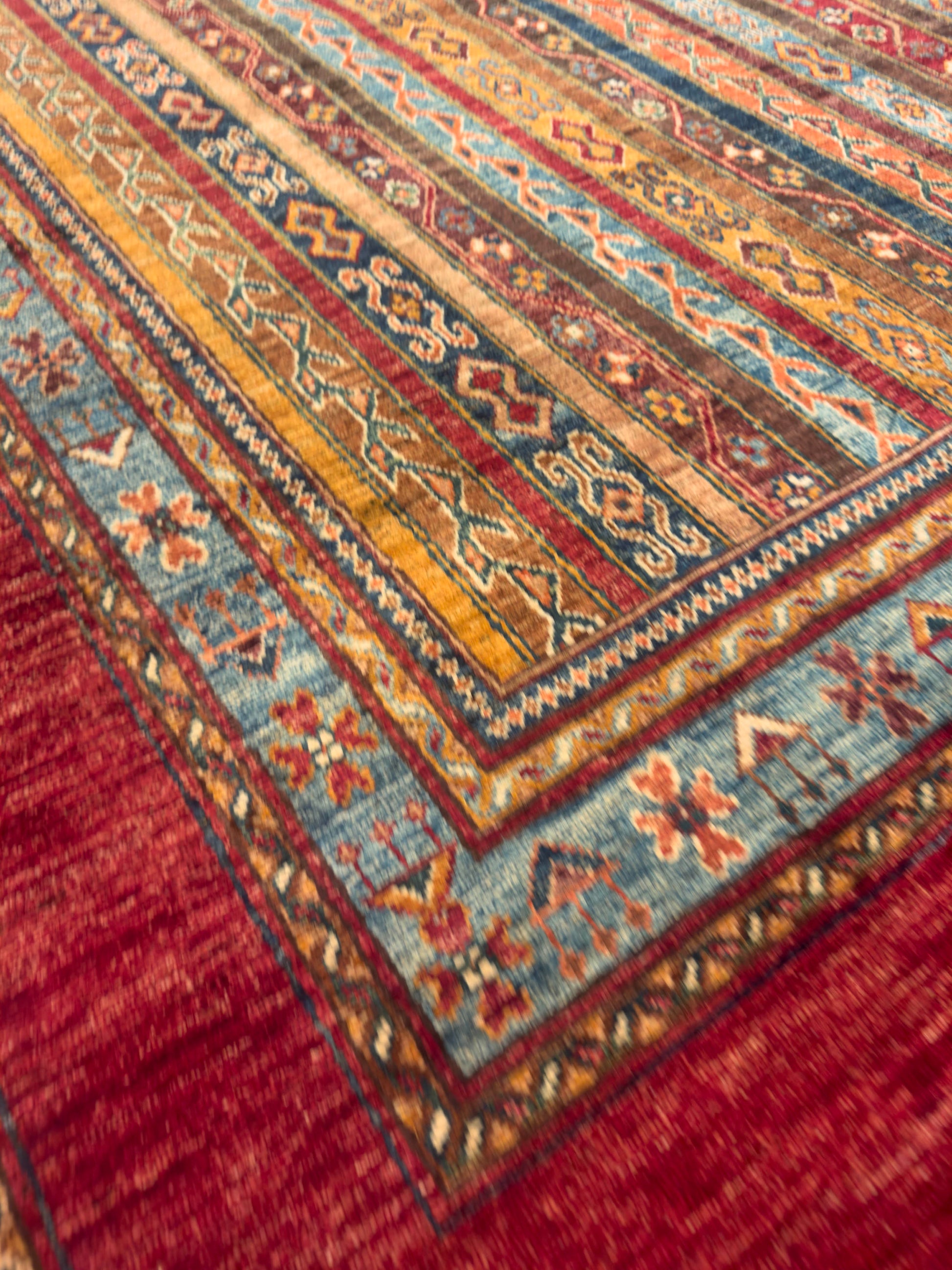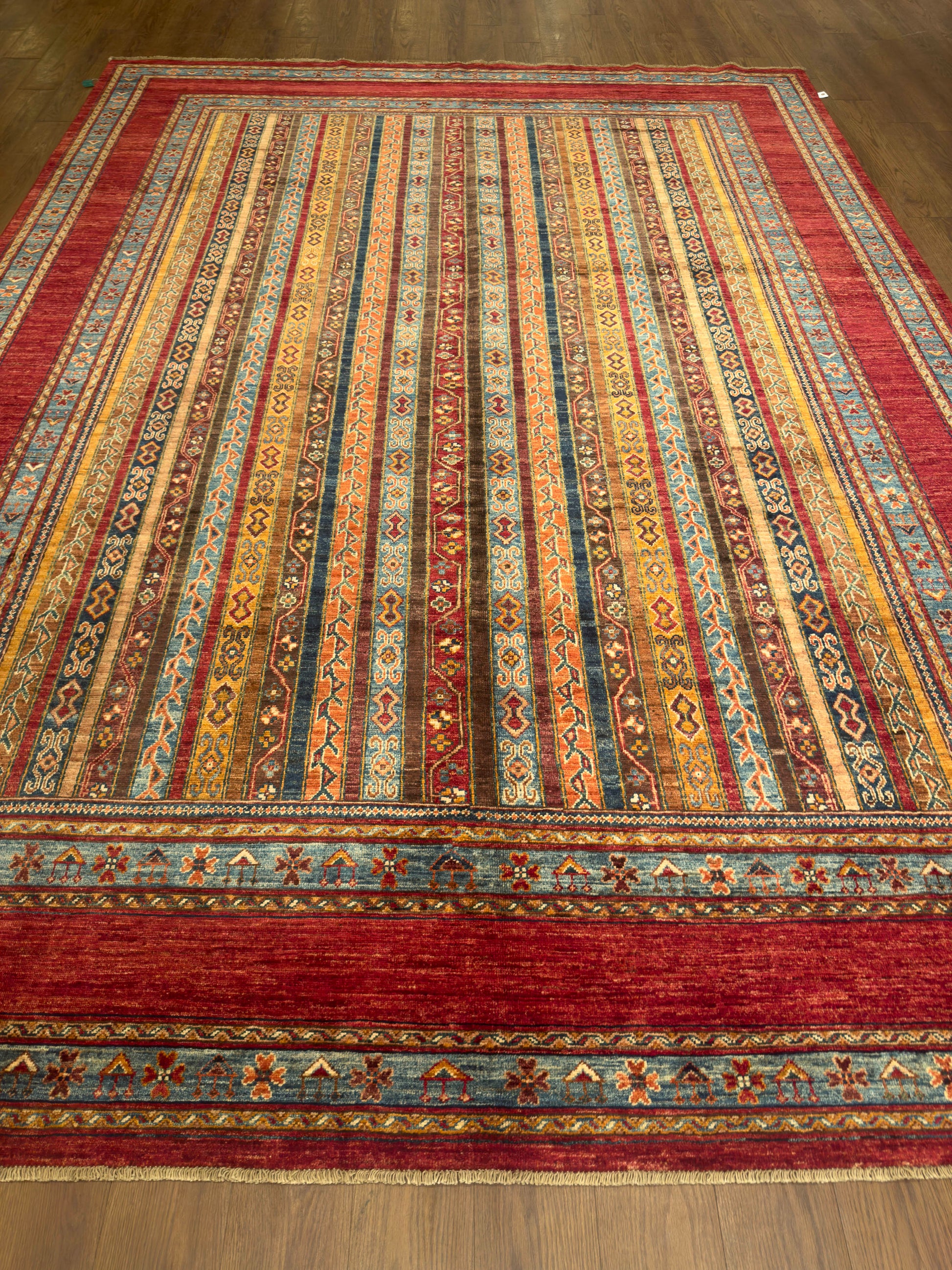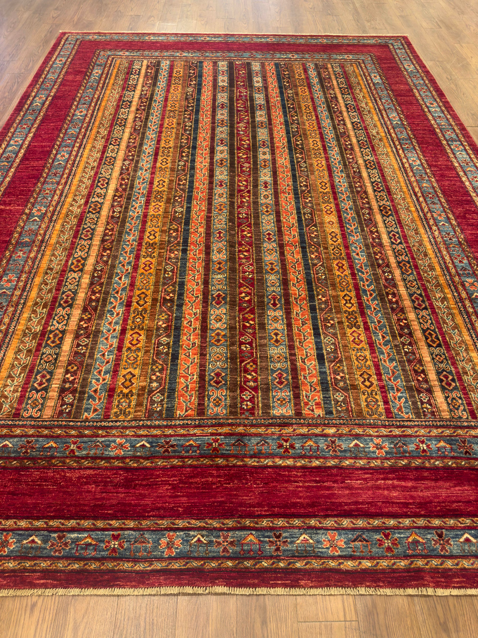 This handmade rug features a striking vertical stripe composition woven in rich tones of red, gold, teal, and earthy brown. Each stripe carries intricate tribal motifs, creating rhythm and harmony across the design. The warm palette and linear balance give this rug a timeless versatility, complementing both modern and traditional interiors beautifully.