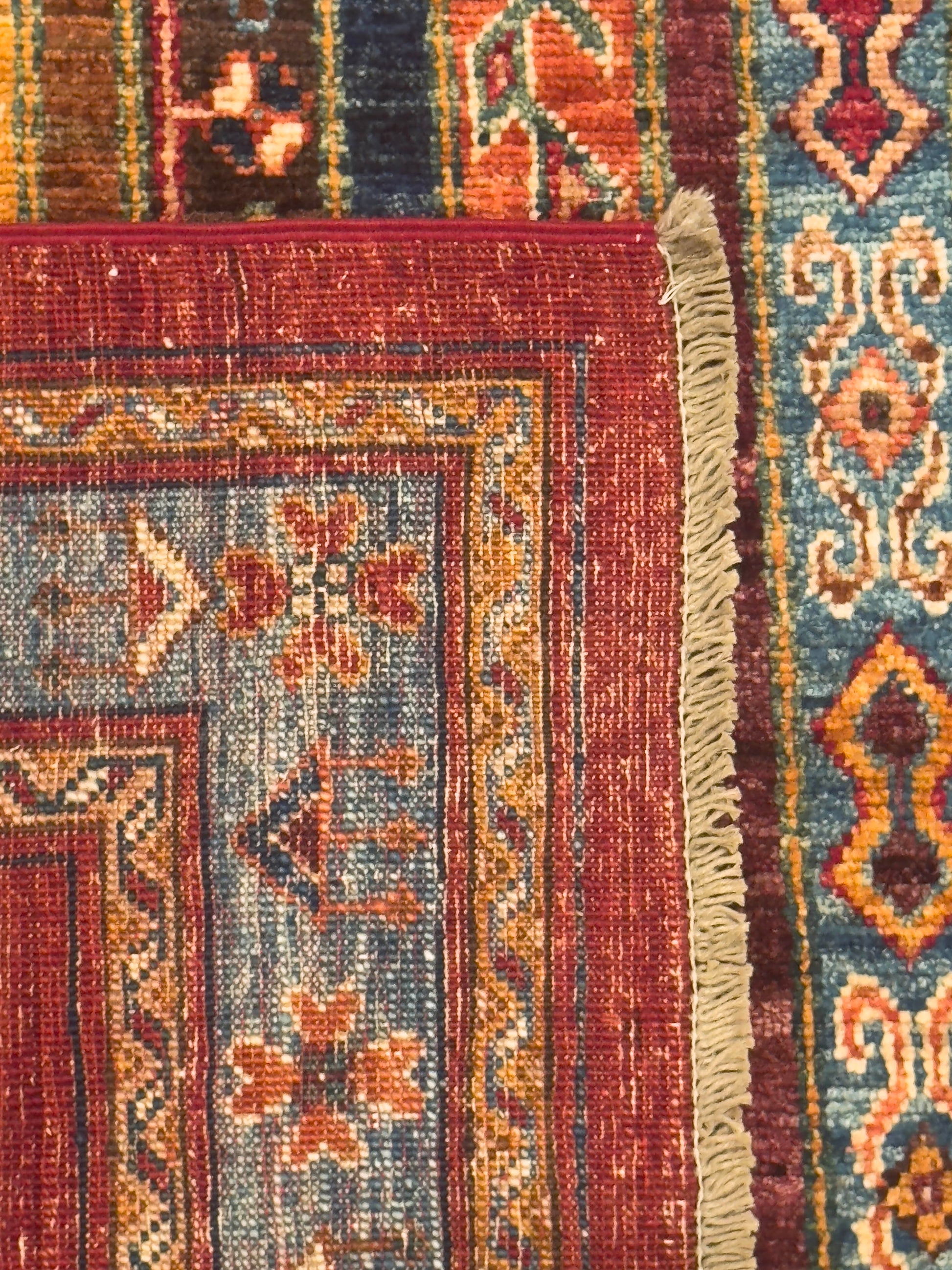 - Color: Red, gold, teal, brown, and ivory