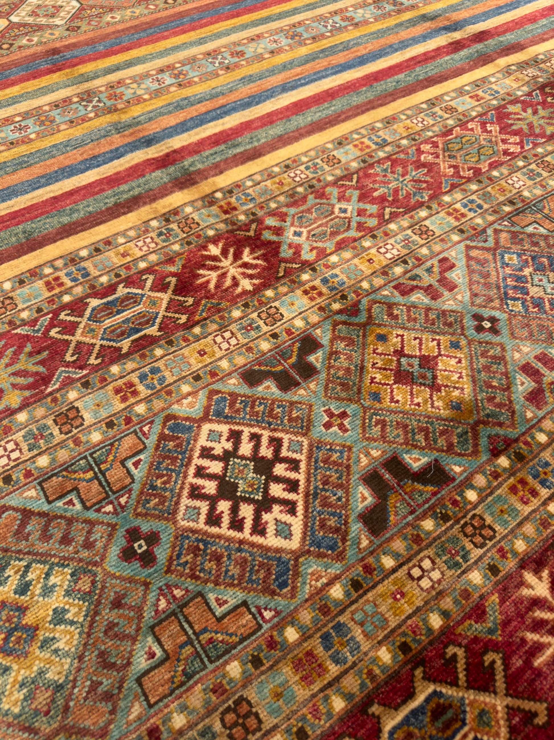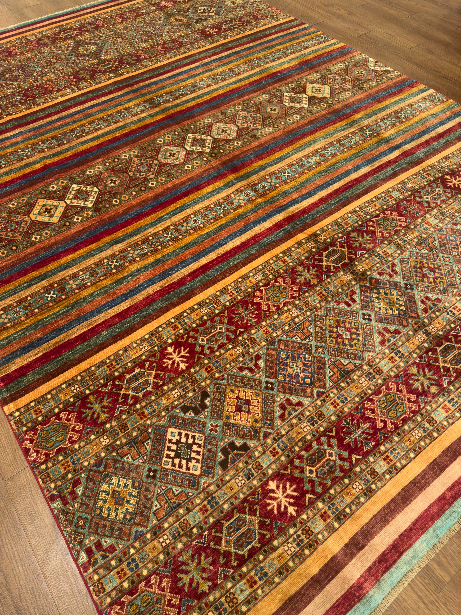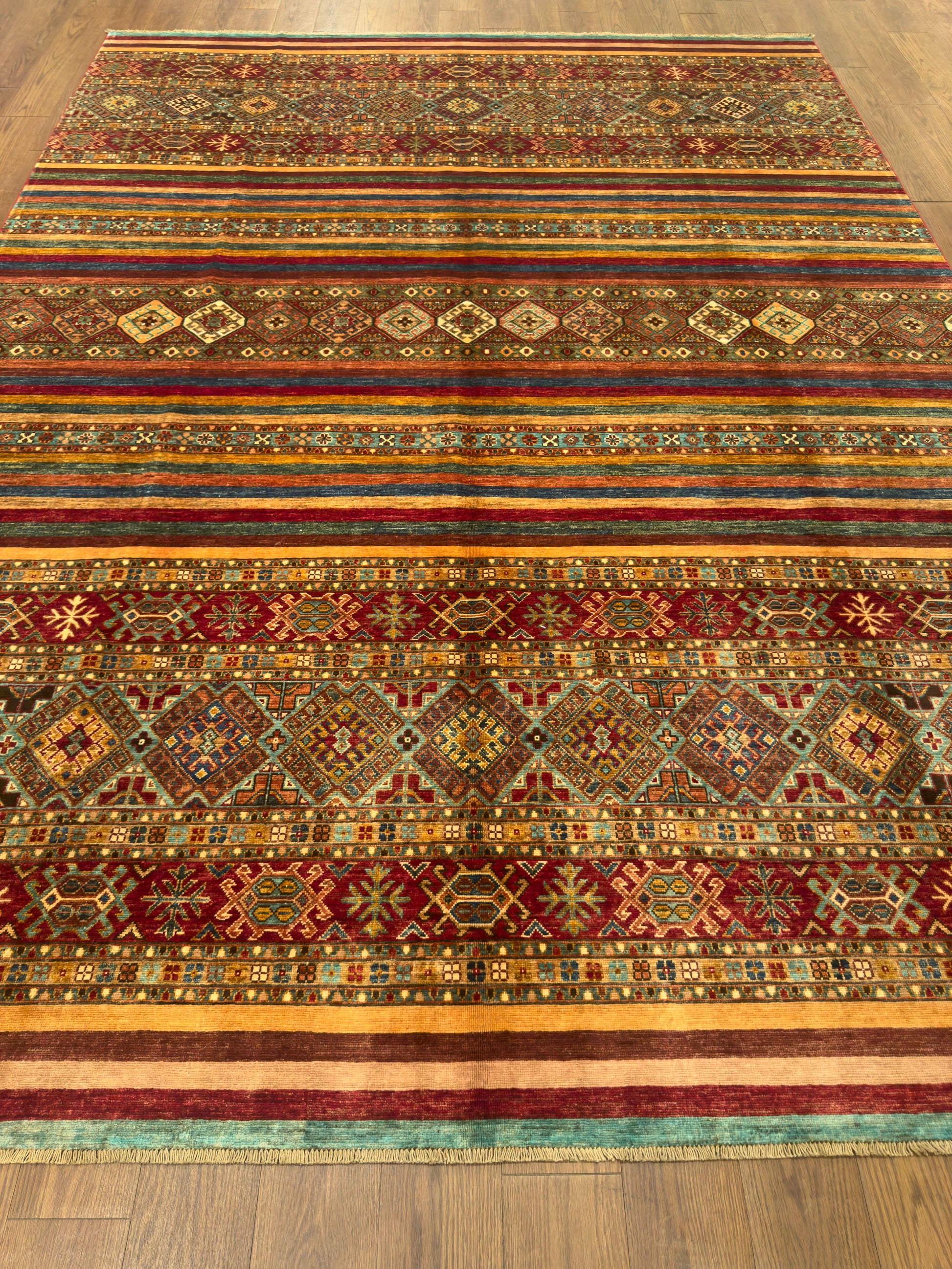 This handmade rug showcases a captivating array of horizontal bands filled with tribal diamond motifs and intricate geometric accents. The warm palette of burgundy, teal, gold, and ivory creates an inviting harmony, while the detailed symmetry reflects expert craftsmanship. Its rich texture and earthy tones make it a perfect centerpiece for a cozy and artistic interior.