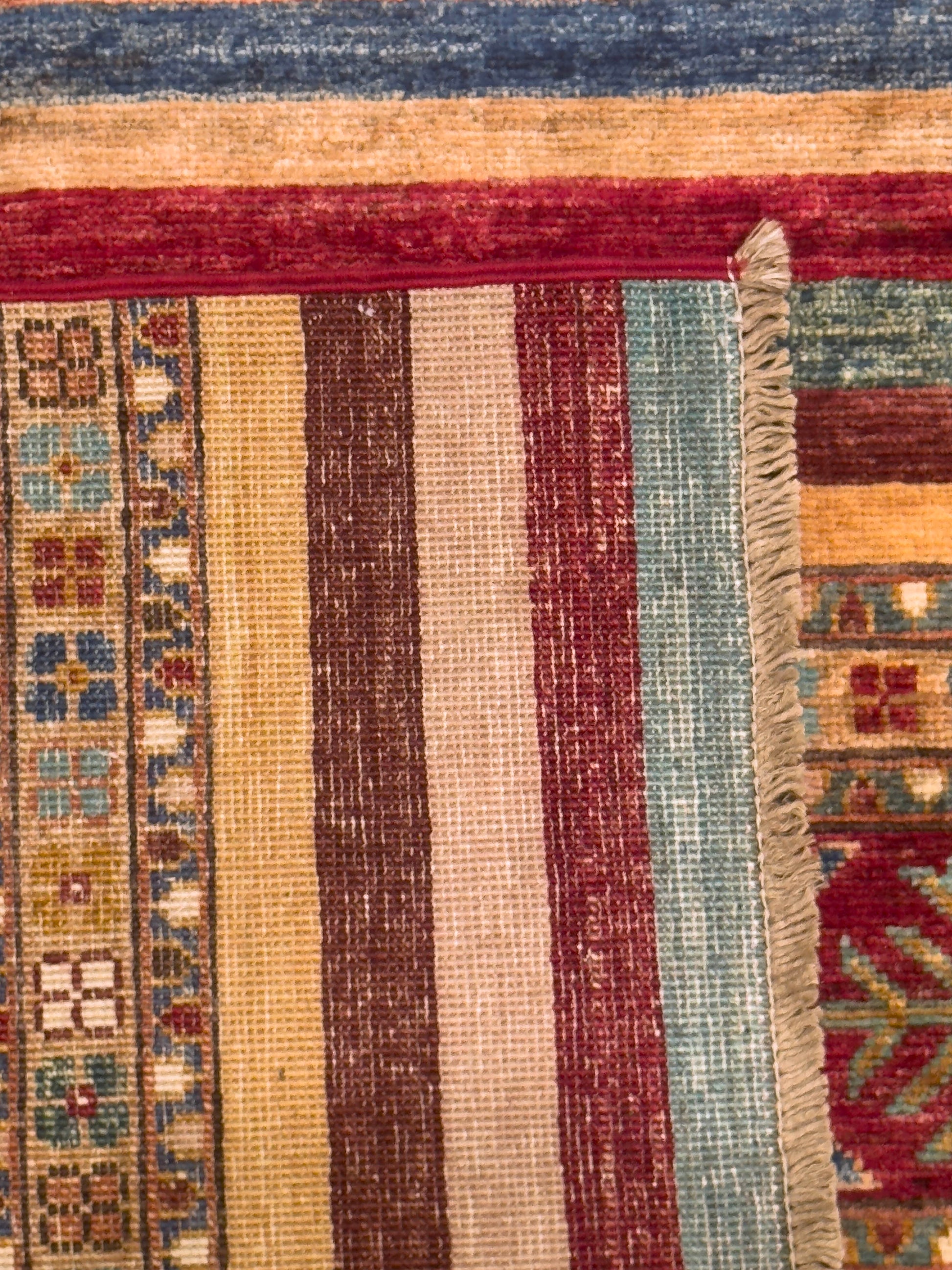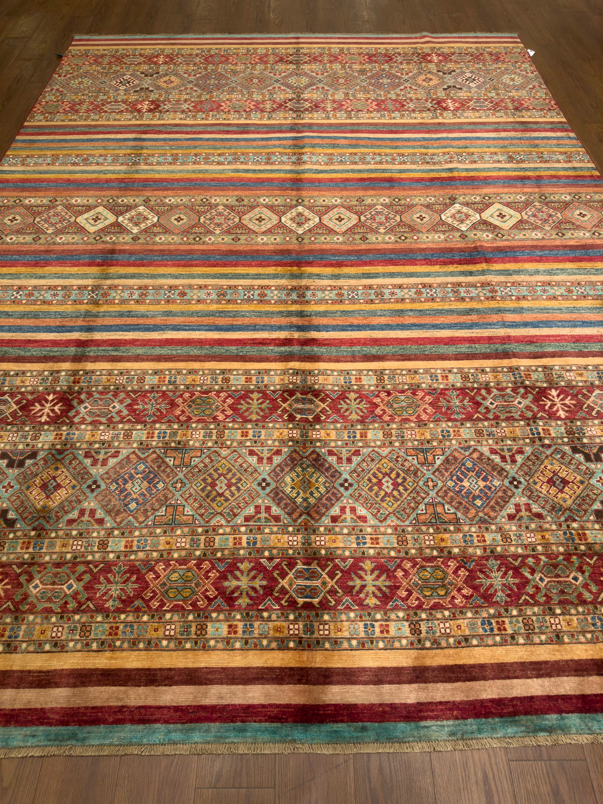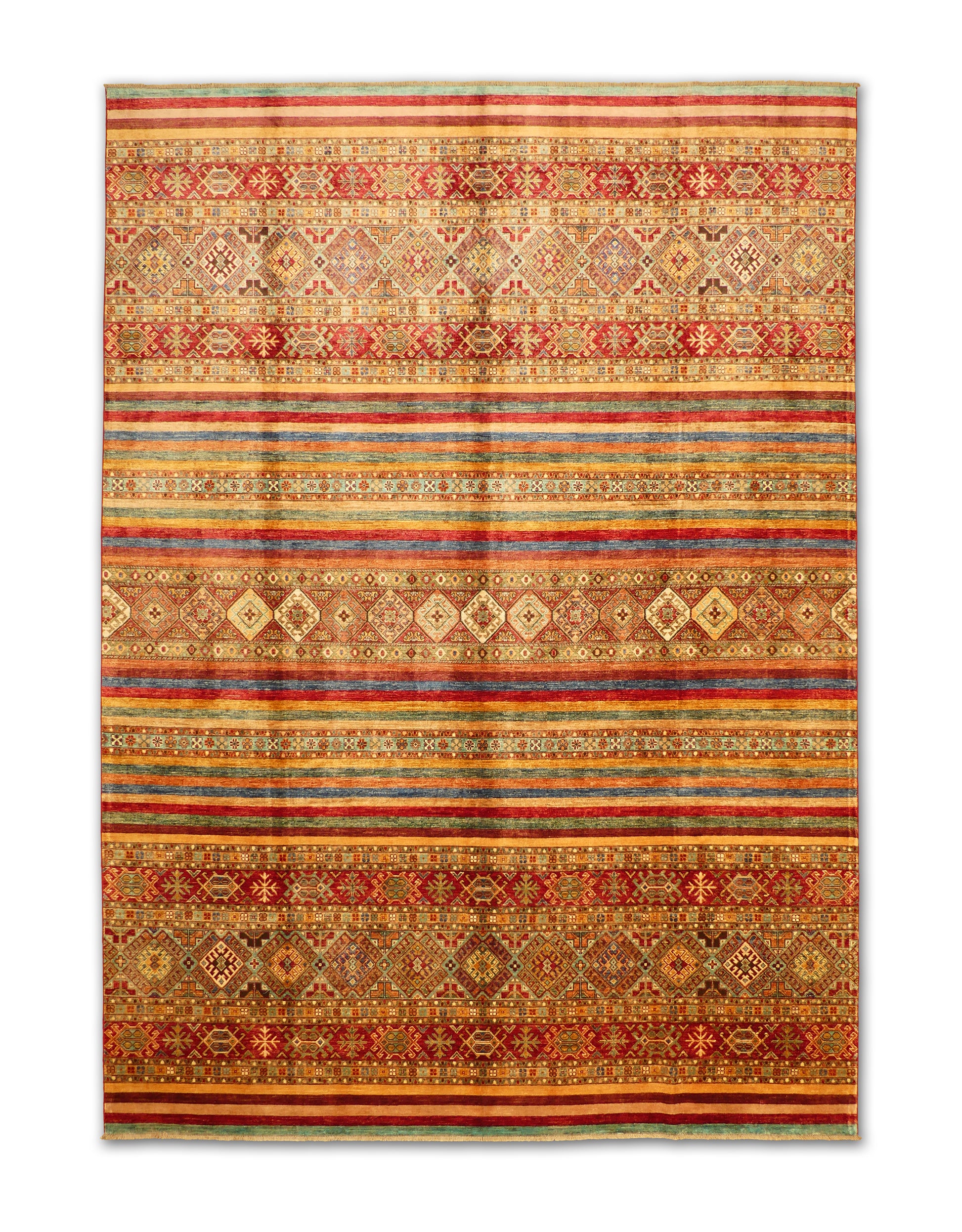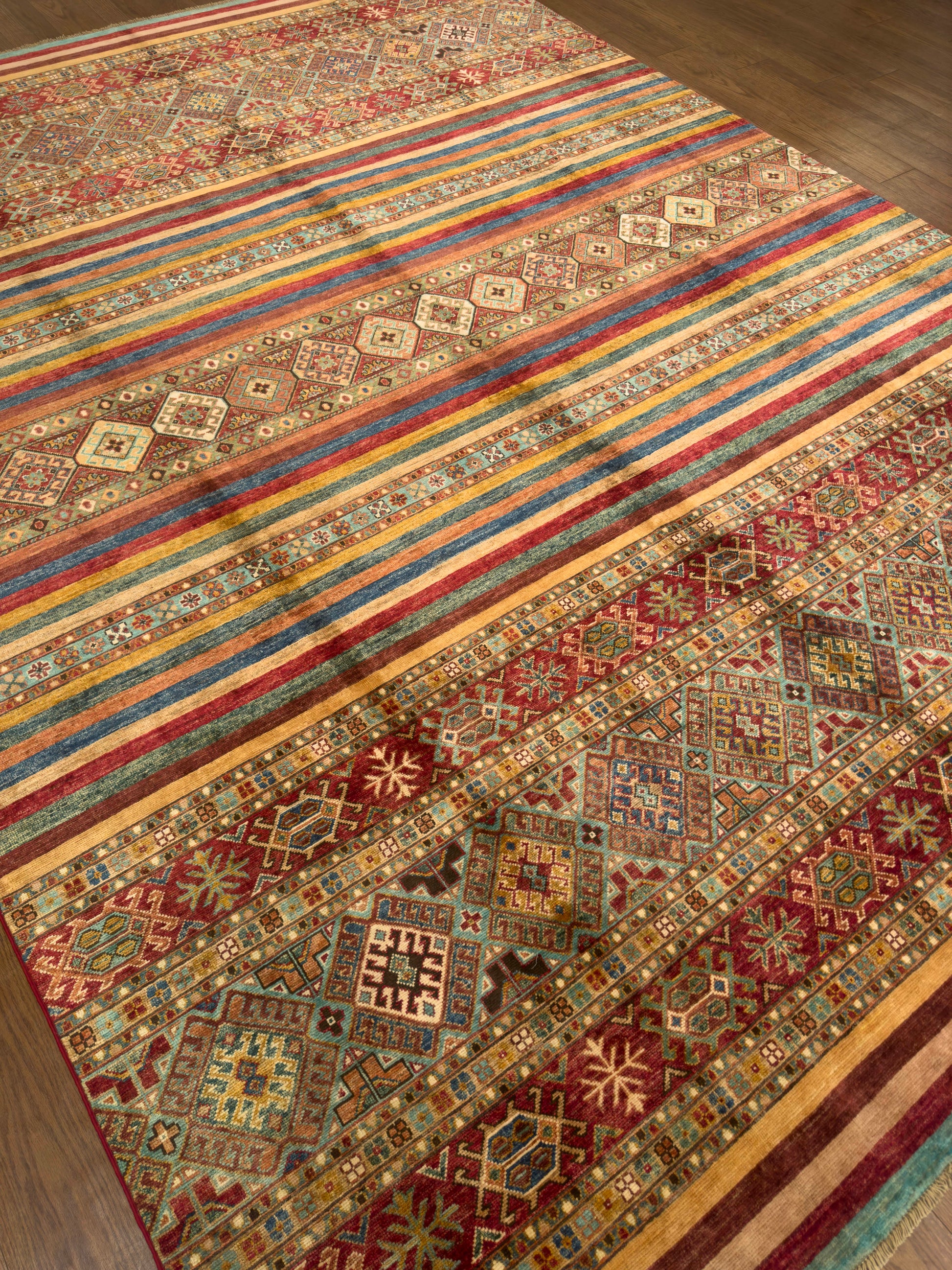 This handmade rug showcases a captivating array of horizontal bands filled with tribal diamond motifs and intricate geometric accents. The warm palette of burgundy, teal, gold, and ivory creates an inviting harmony, while the detailed symmetry reflects expert craftsmanship. Its rich texture and earthy tones make it a perfect centerpiece for a cozy and artistic interior.