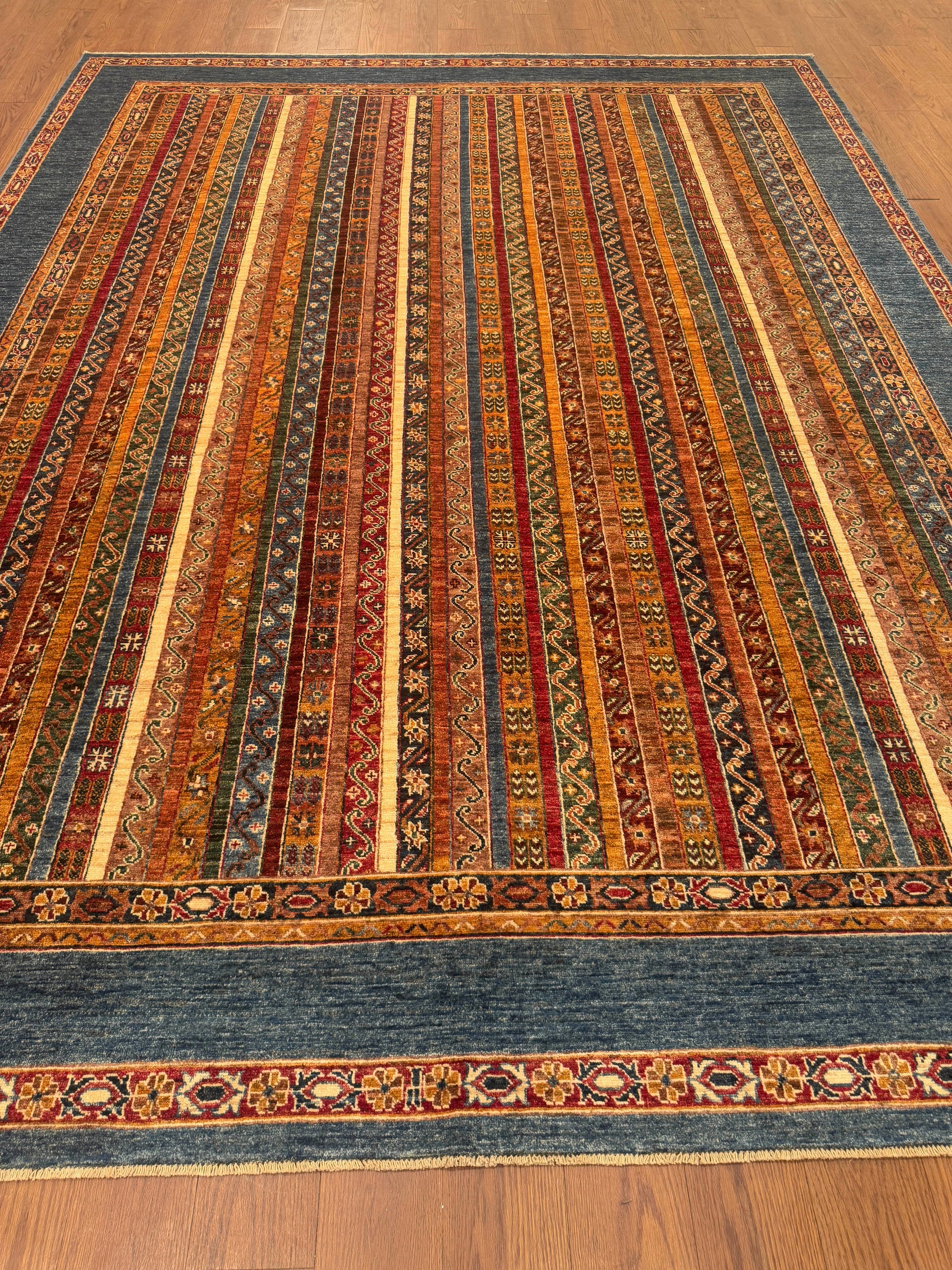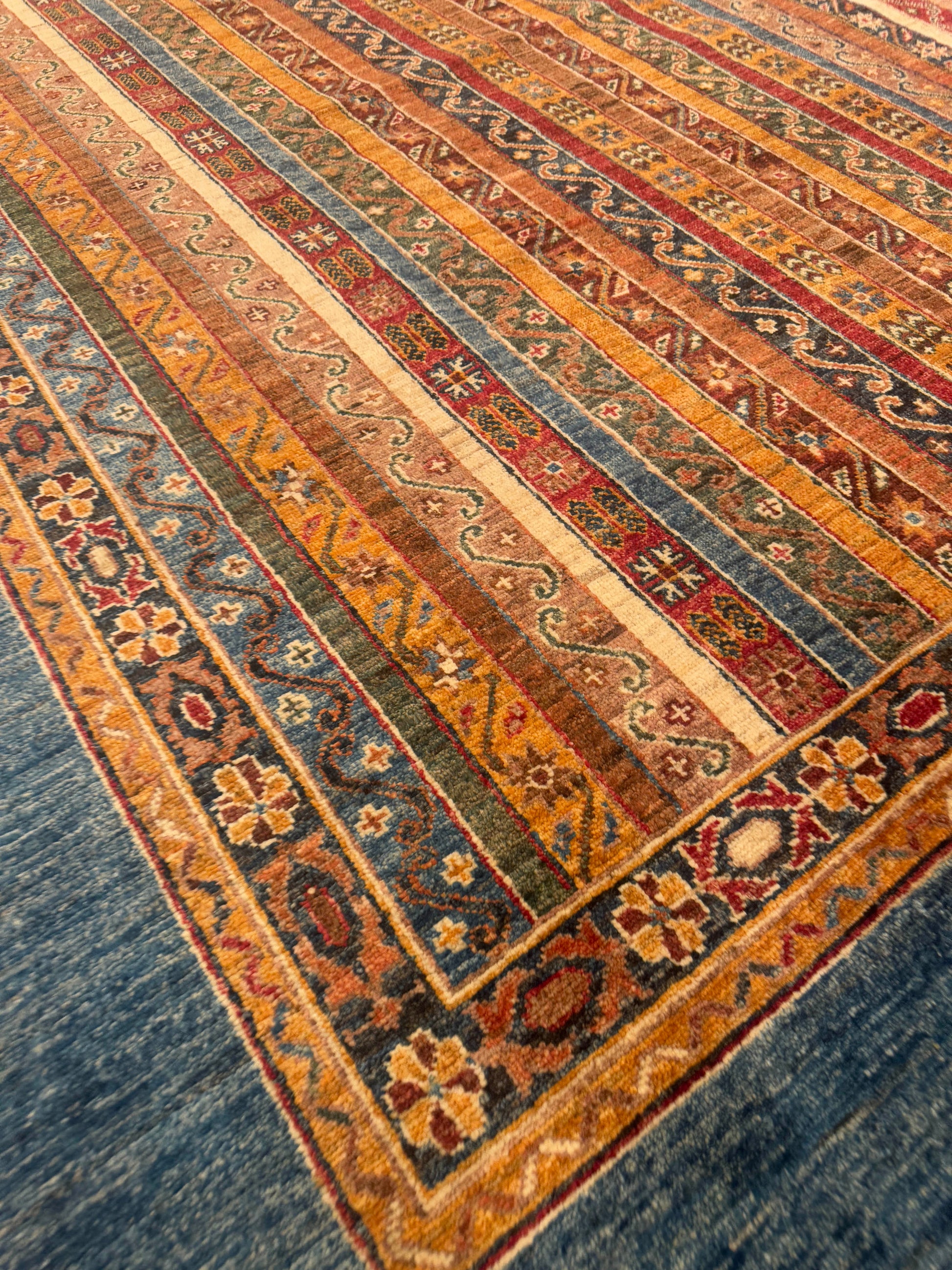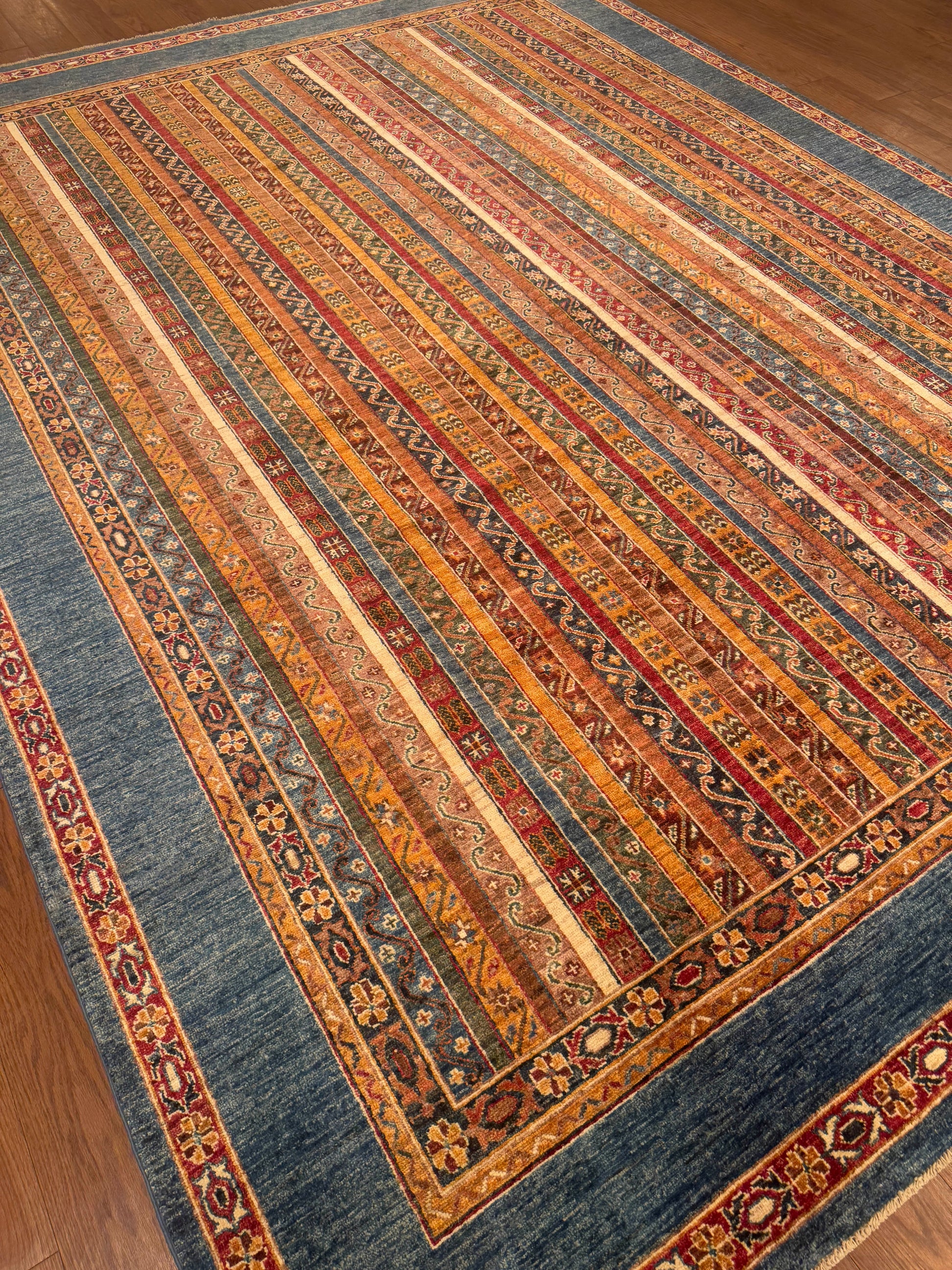 This handmade rug features a vibrant striped design with alternating bands of intricate tribal motifs. The balanced mix of terracotta, gold, teal, and ivory tones set against a soft blue border gives the piece warmth and structure. Its rhythmic linear layout and rich detailing make it a perfect choice for brightening open spaces while adding timeless character.