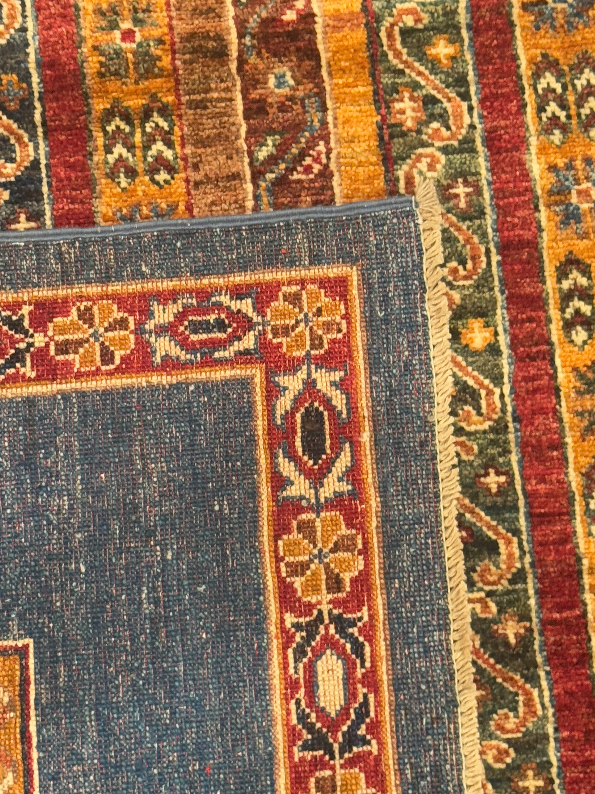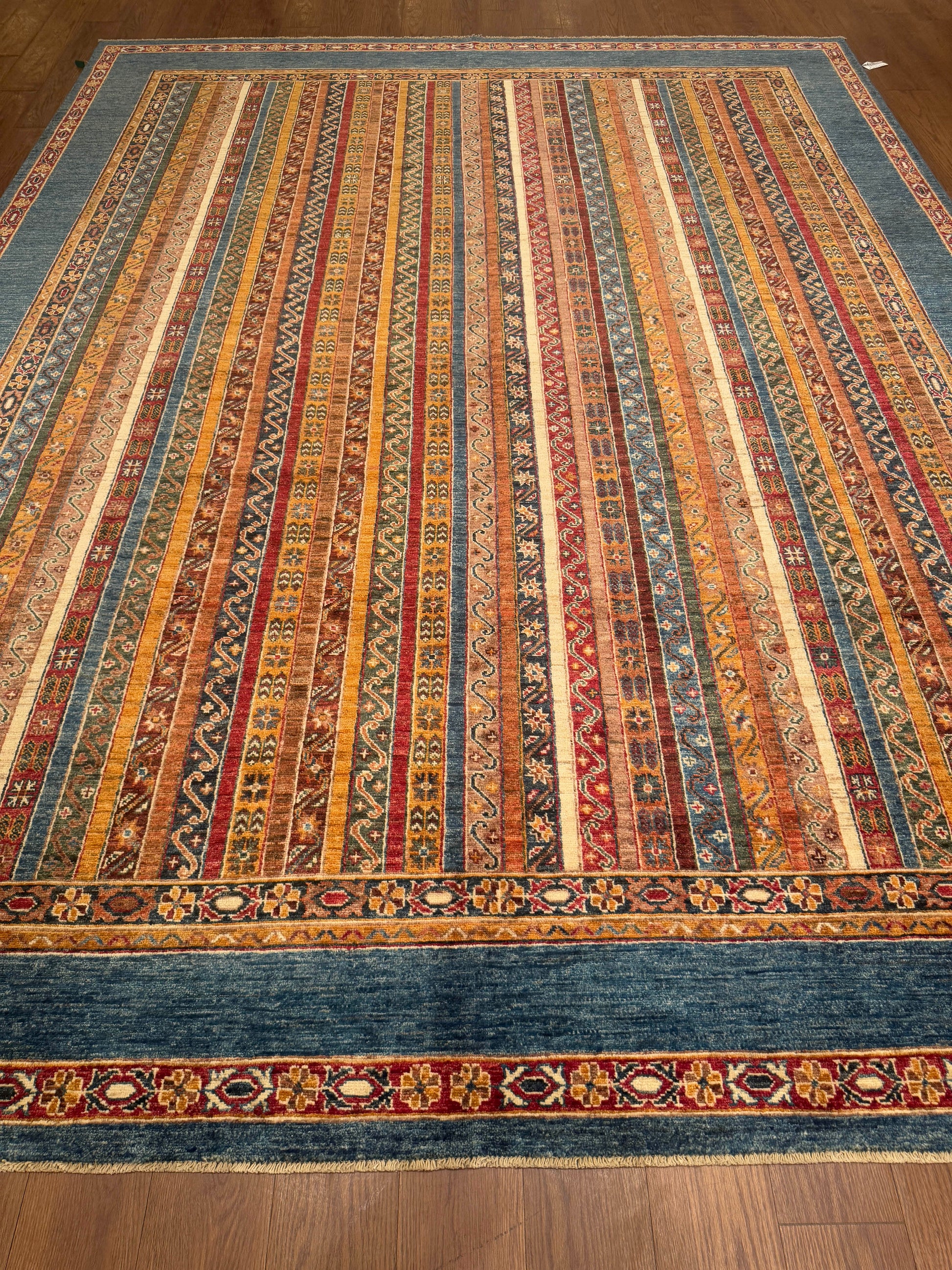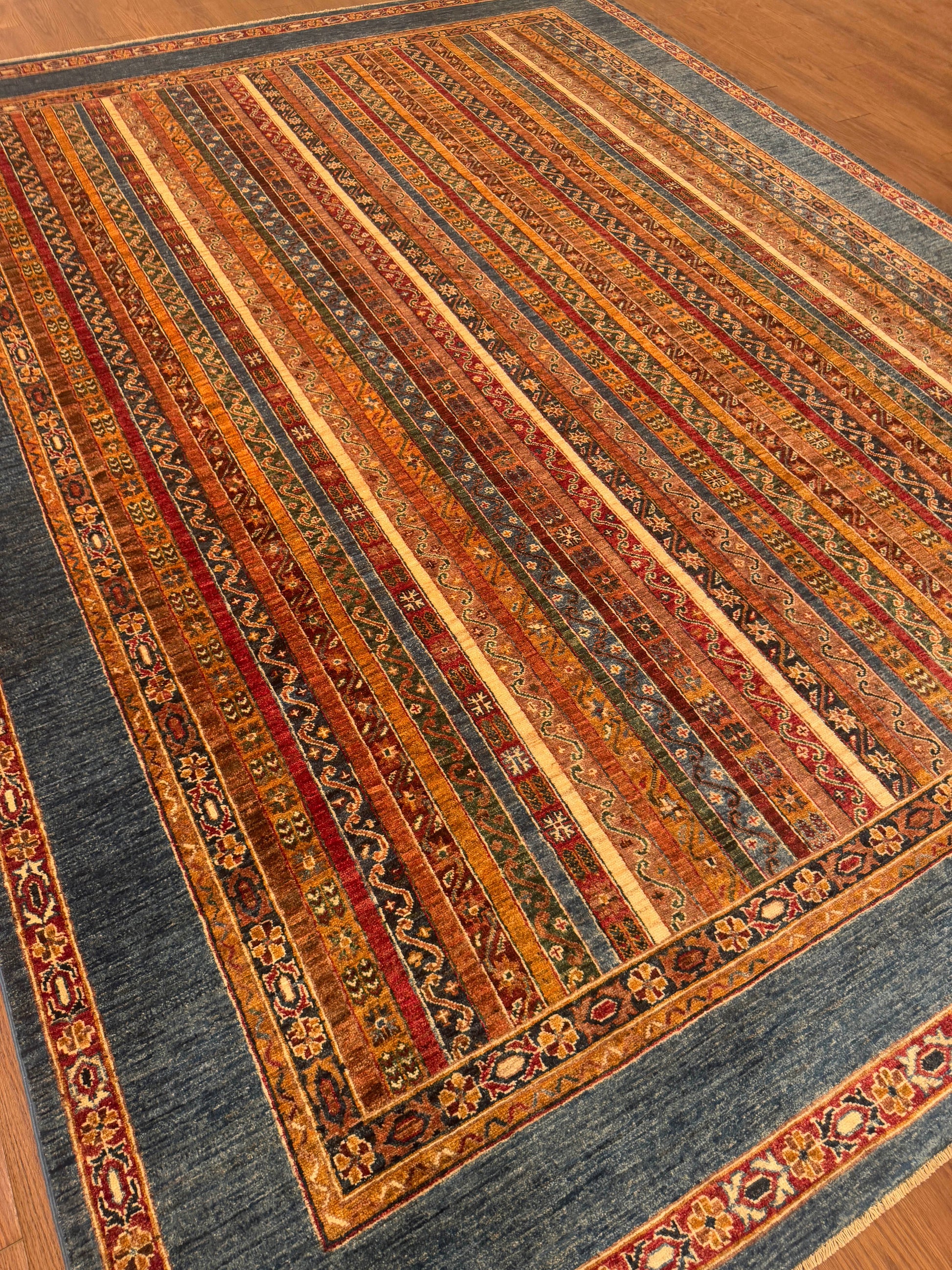 This handmade rug features a vibrant striped design with alternating bands of intricate tribal motifs. The balanced mix of terracotta, gold, teal, and ivory tones set against a soft blue border gives the piece warmth and structure. Its rhythmic linear layout and rich detailing make it a perfect choice for brightening open spaces while adding timeless character.