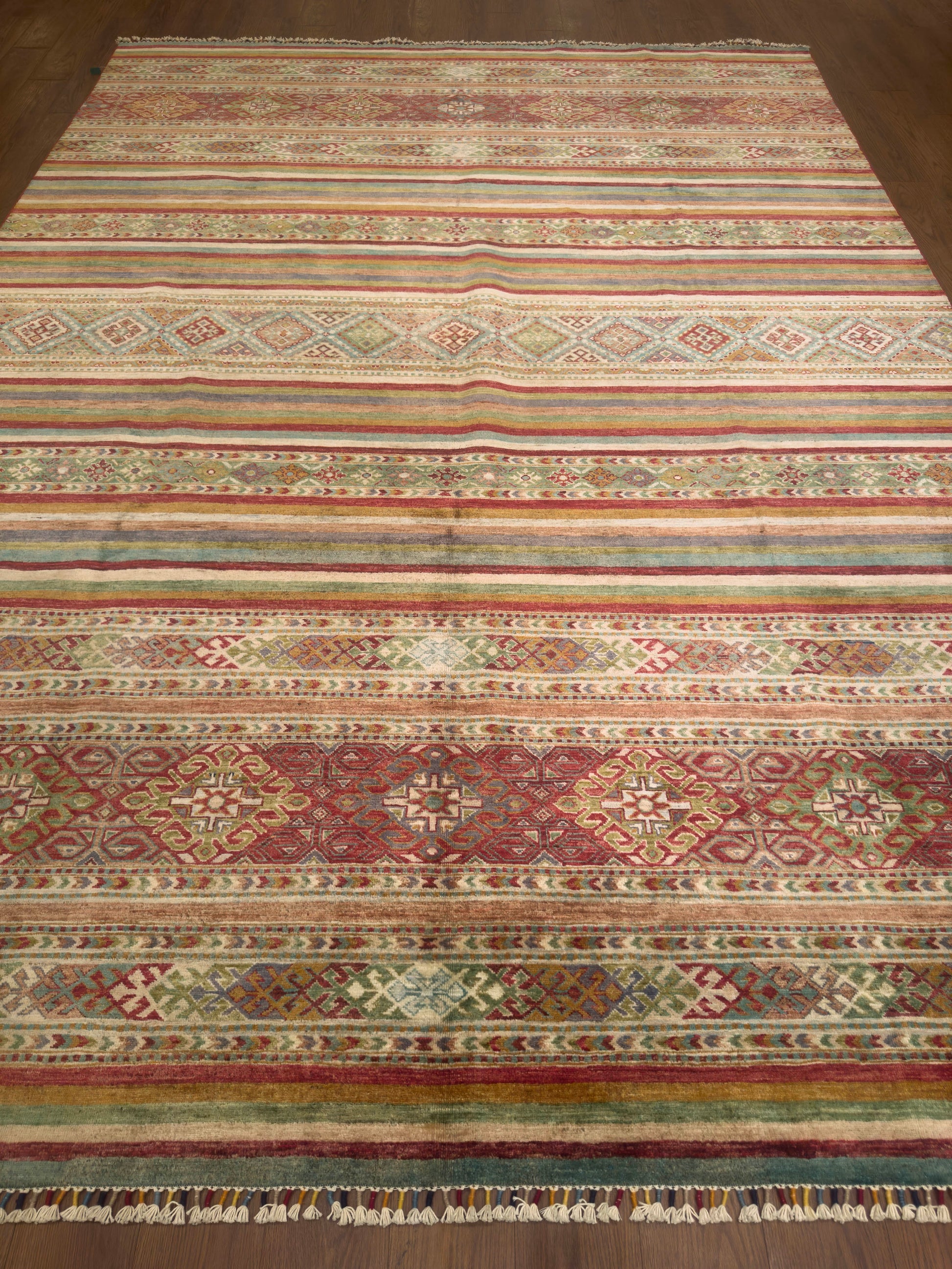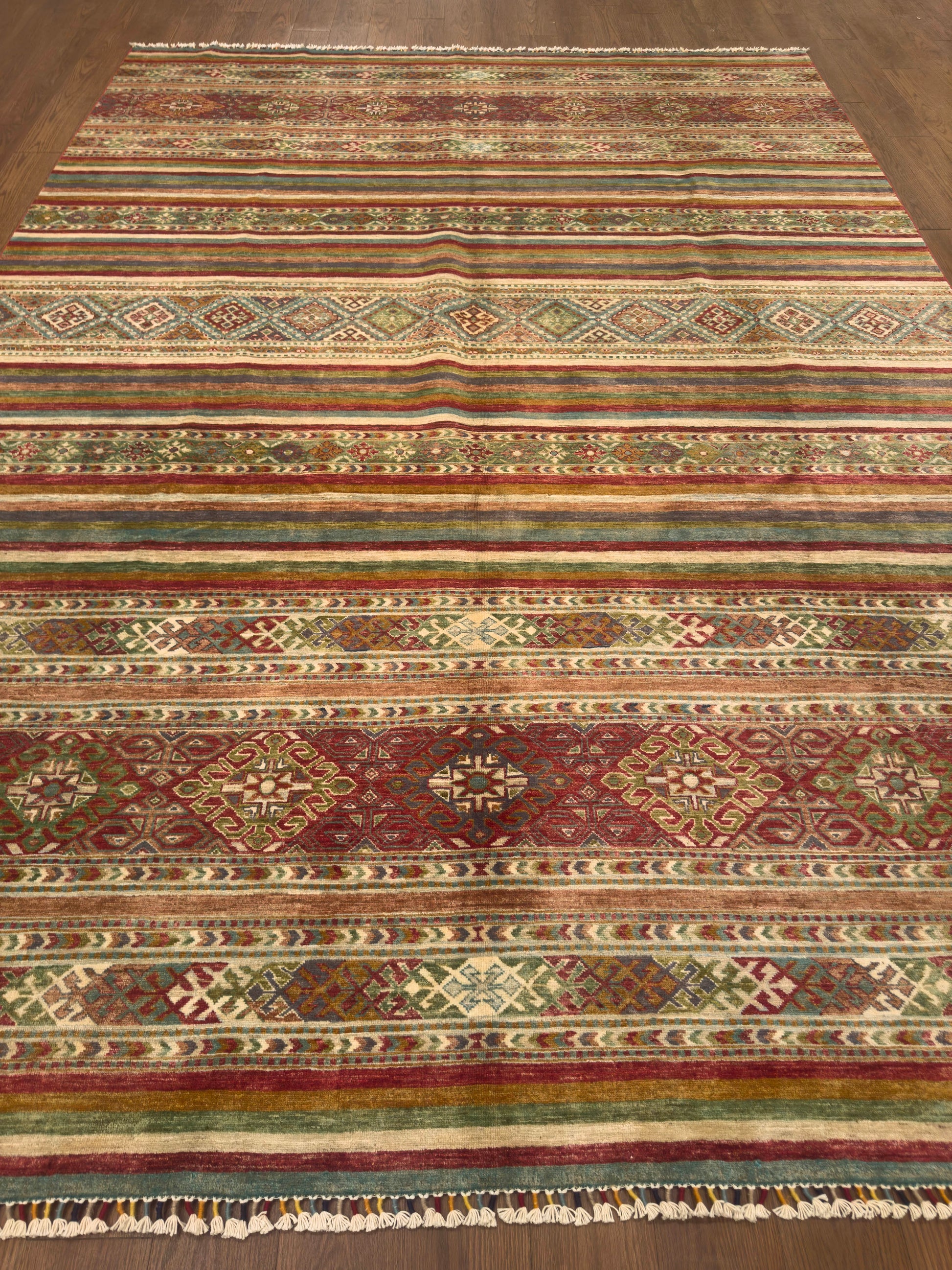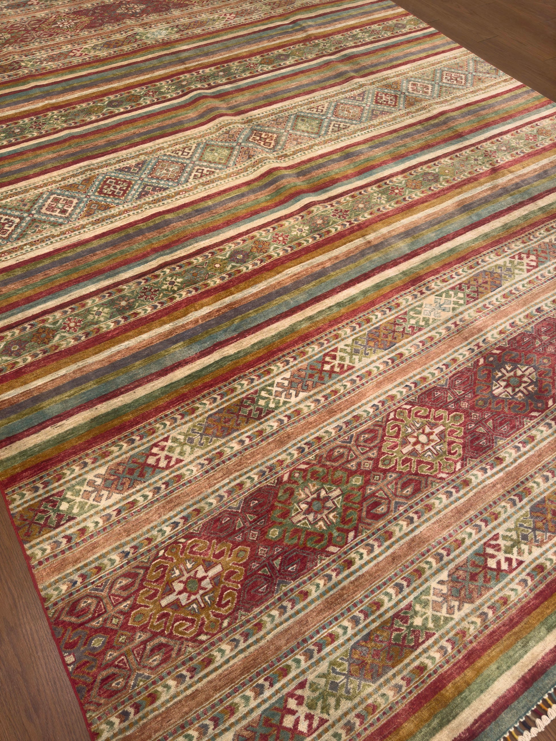 This handmade rug features a soothing array of horizontal tribal bands woven in soft, earthy tones of sage, ivory, brick red, and muted gold. The geometric diamond motifs and rhythmic stripe pattern create a balanced, organic feel that blends traditional craftsmanship with modern versatility. Its subtle sheen and natural color palette make it ideal for serene, welcoming interiors.