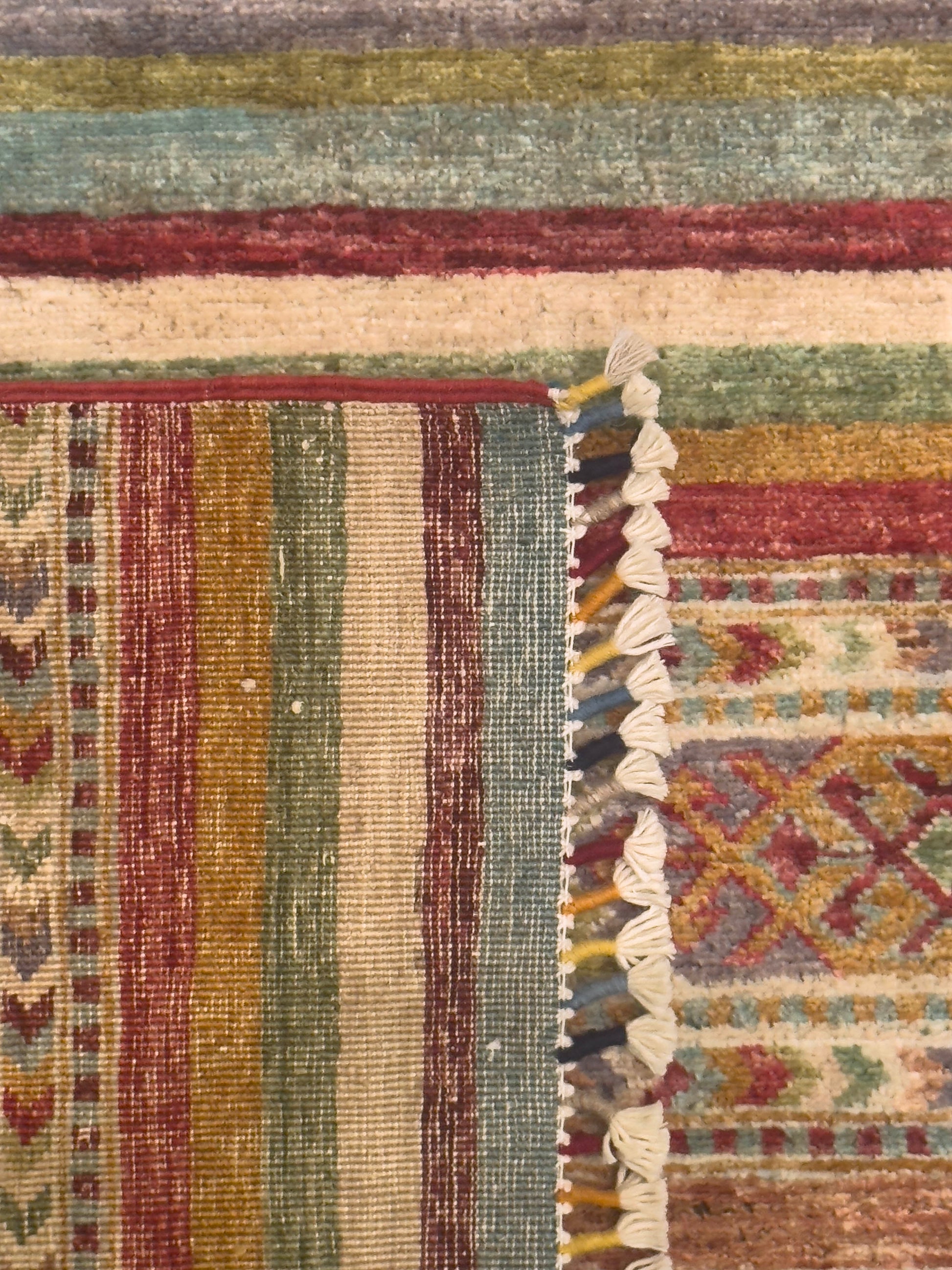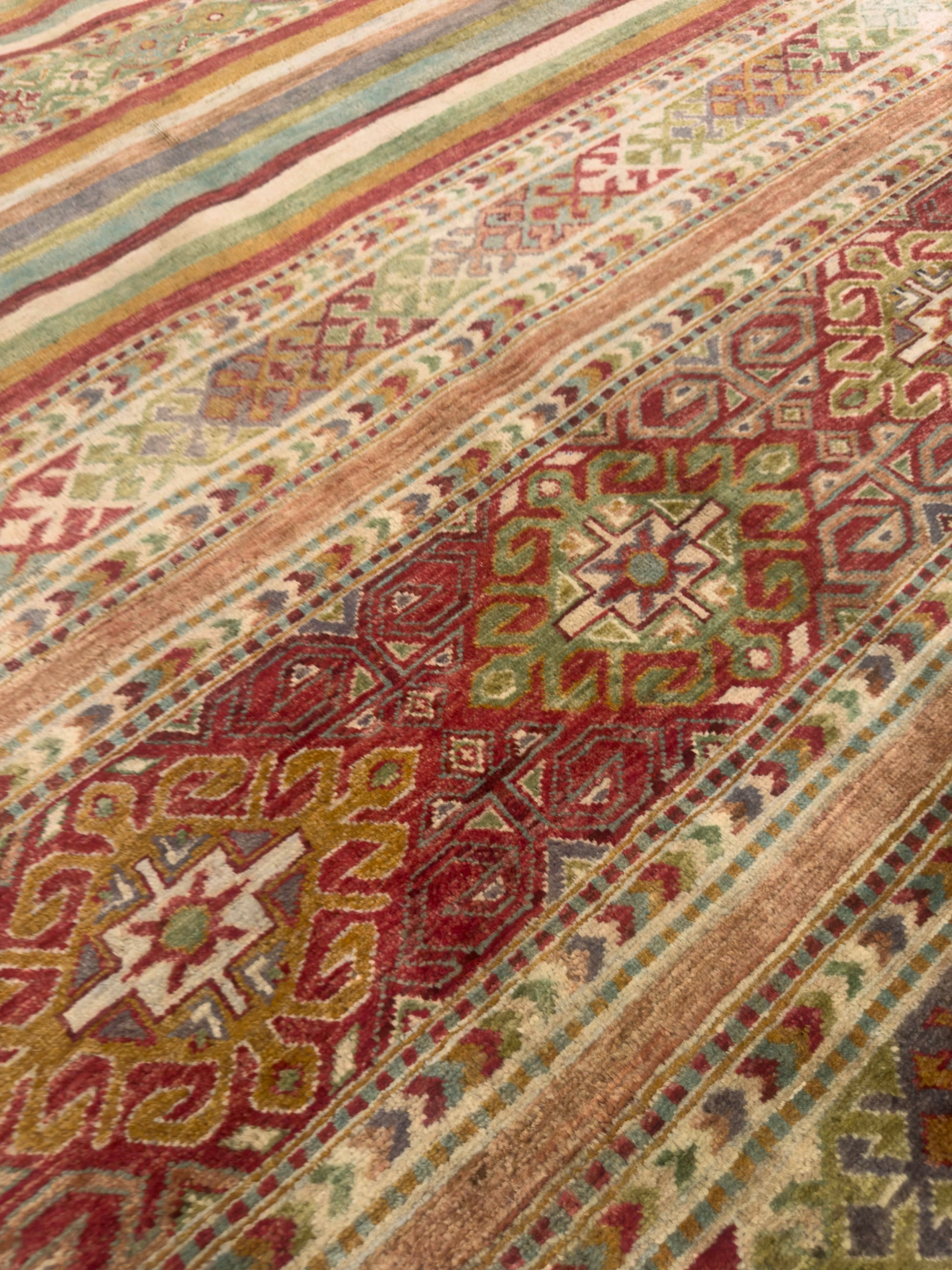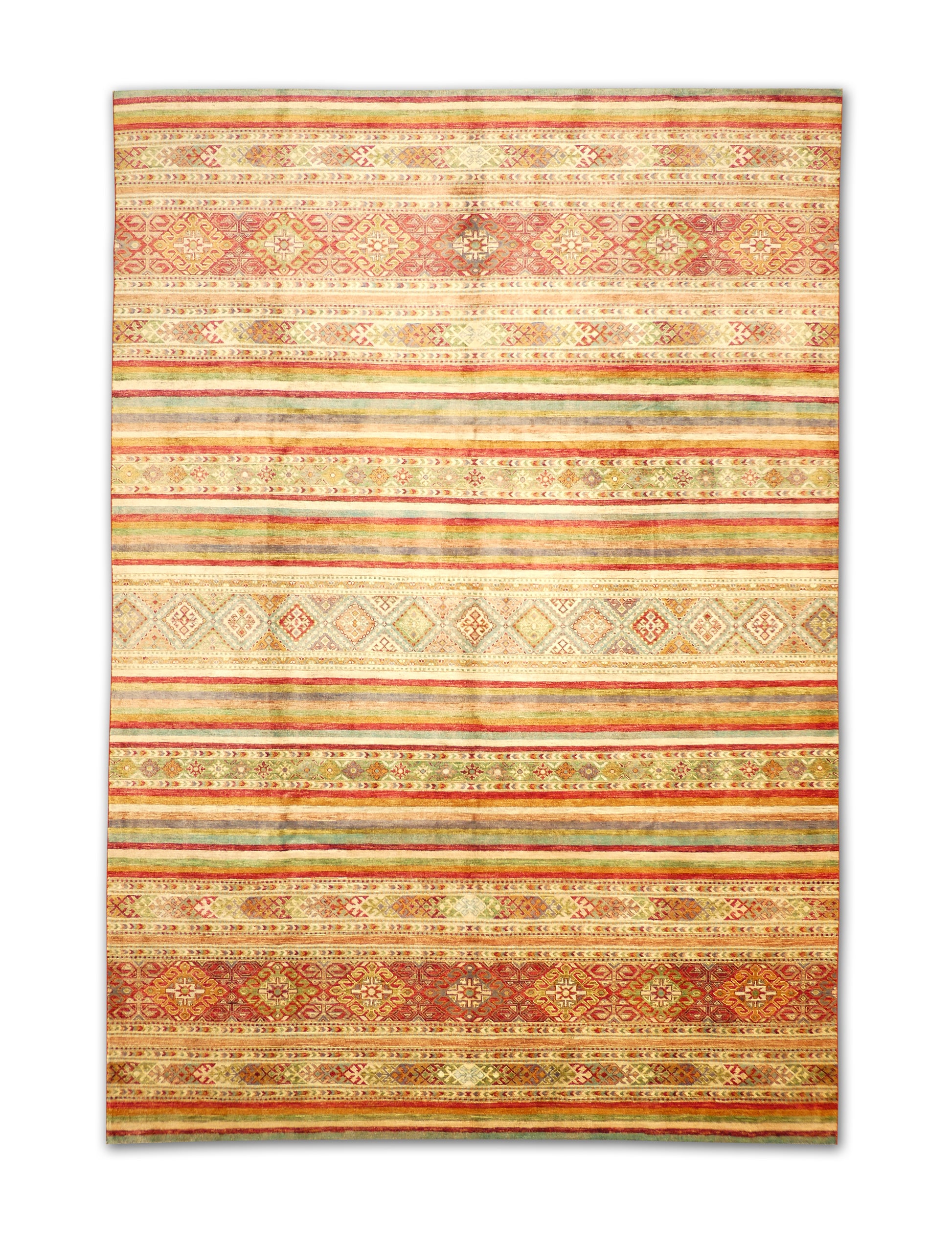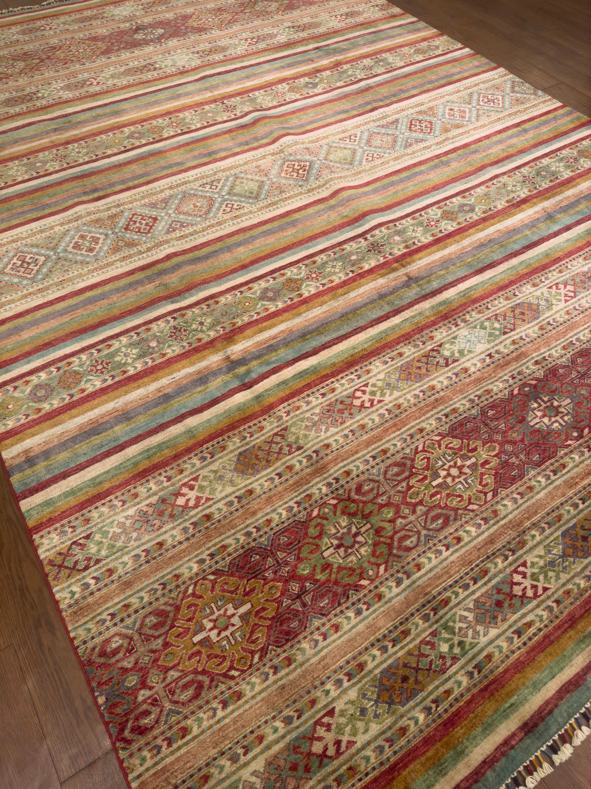 This handmade rug features a soothing array of horizontal tribal bands woven in soft, earthy tones of sage, ivory, brick red, and muted gold. The geometric diamond motifs and rhythmic stripe pattern create a balanced, organic feel that blends traditional craftsmanship with modern versatility. Its subtle sheen and natural color palette make it ideal for serene, welcoming interiors.