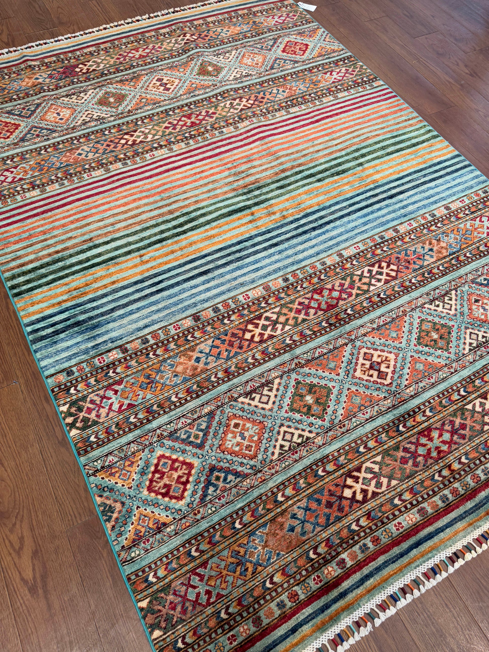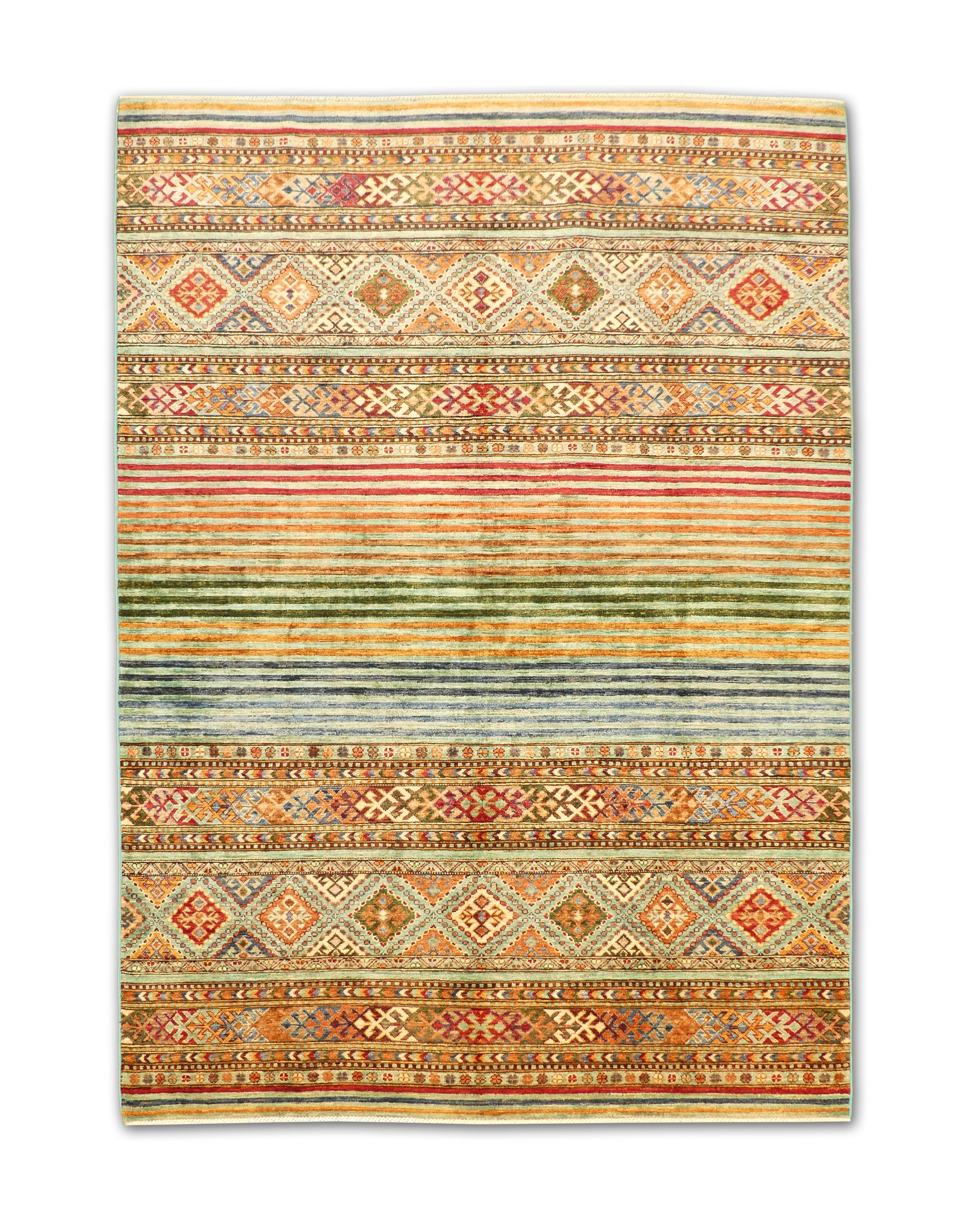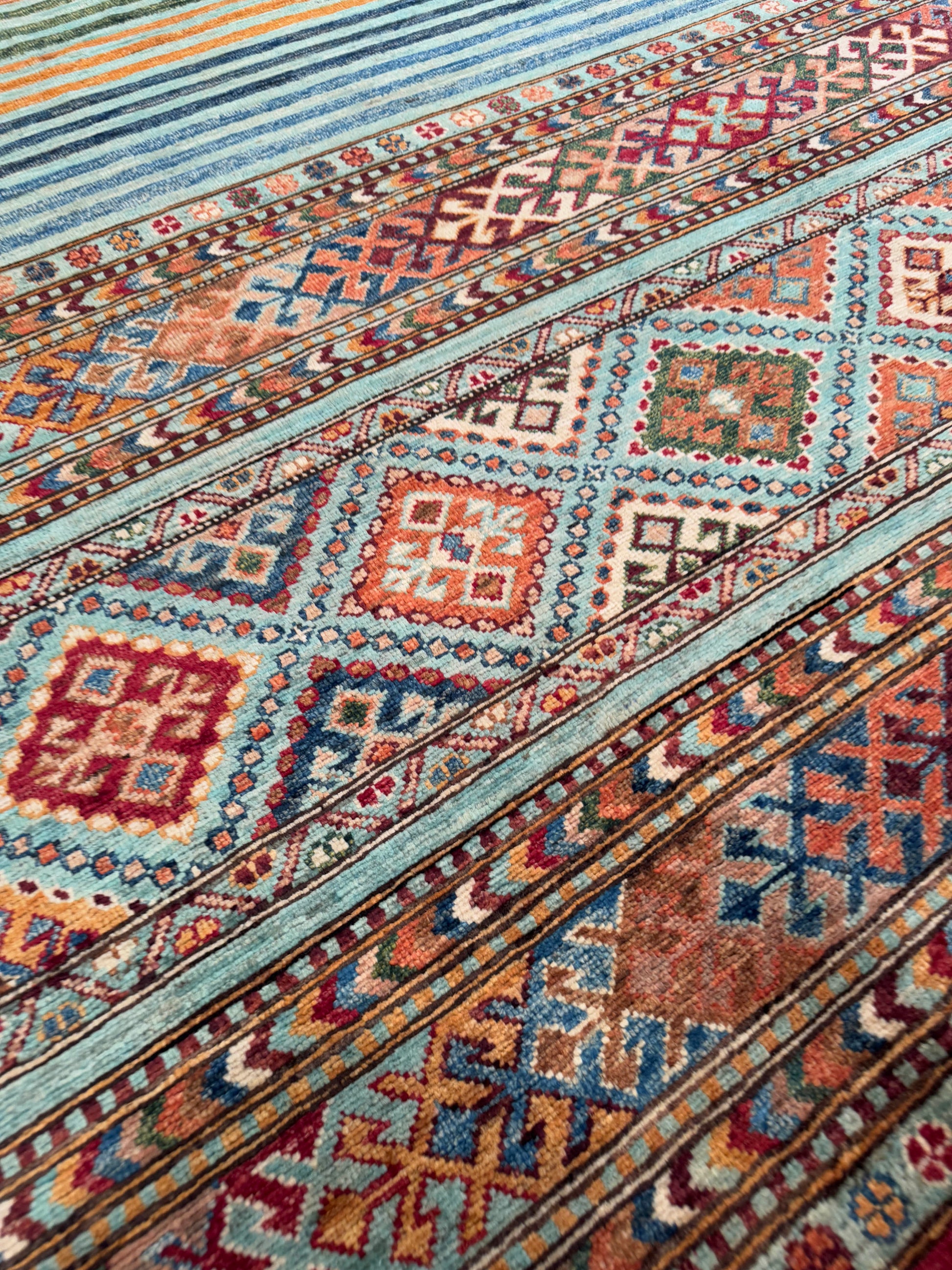 This handwoven rug displays a striking mix of horizontal stripes and intricate diamond motifs, creating a lively yet balanced aesthetic. The alternating patterns of bold stripes and geometric bands add both rhythm and depth to the design. Its vibrant use of blues, greens, oranges, and reds makes it a dynamic centerpiece. This rug seamlessly blends traditional weaving with a contemporary feel, perfect for eclectic or modern interiors.