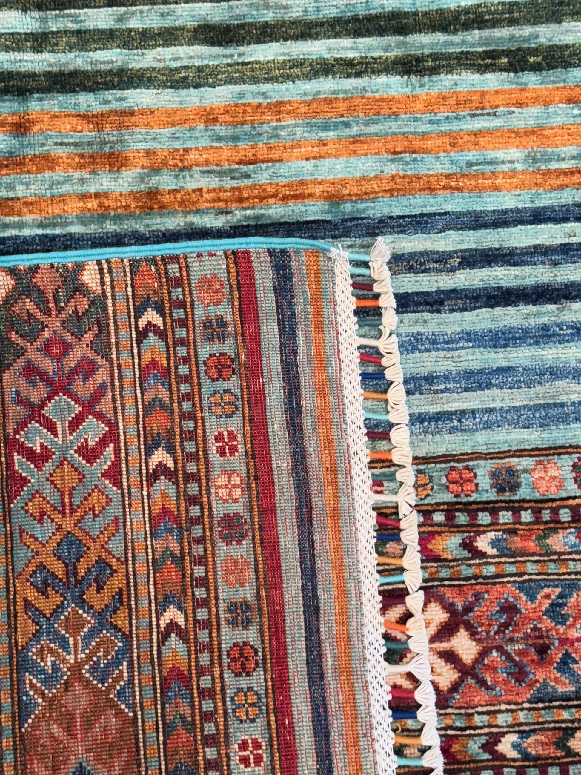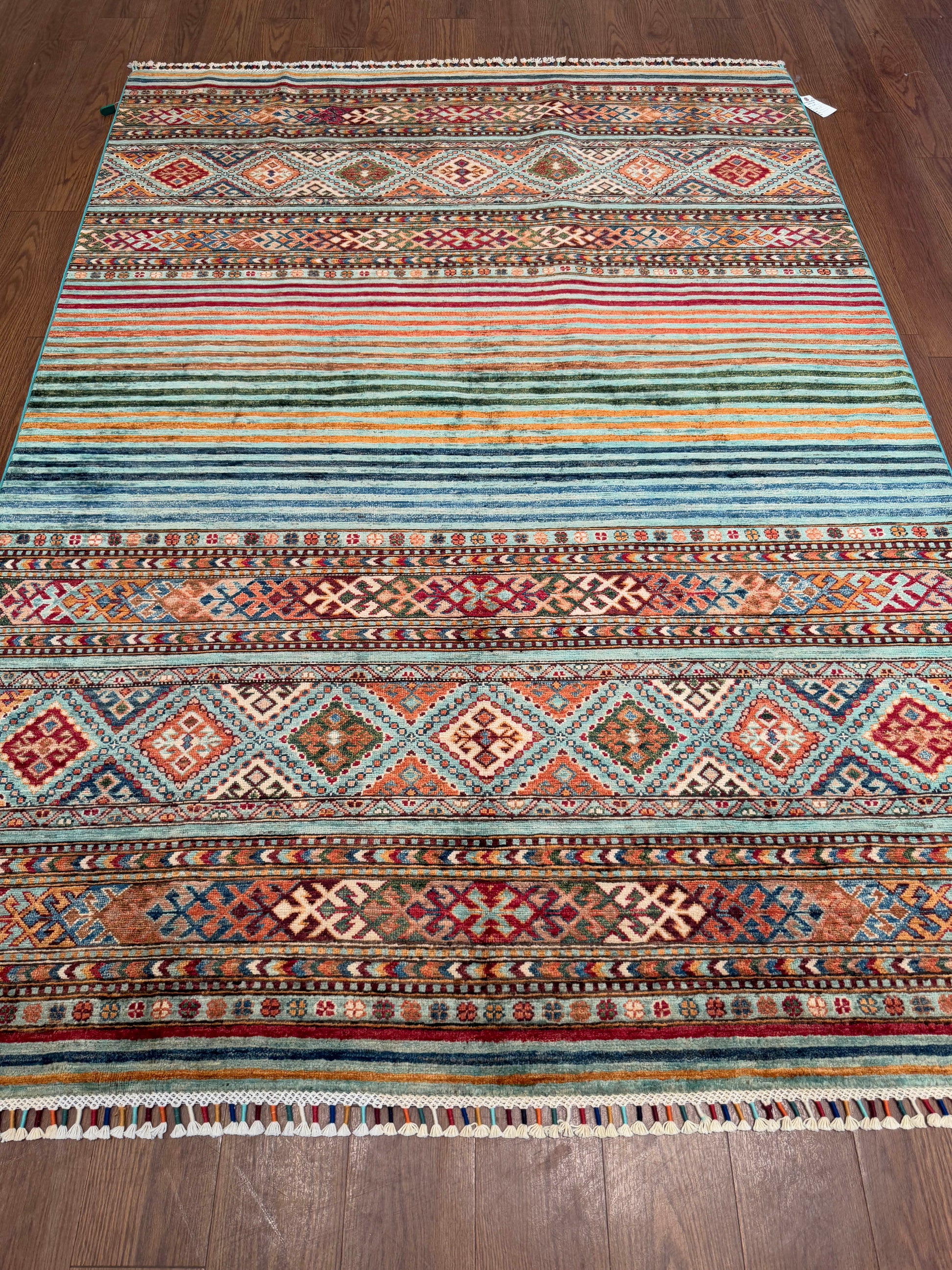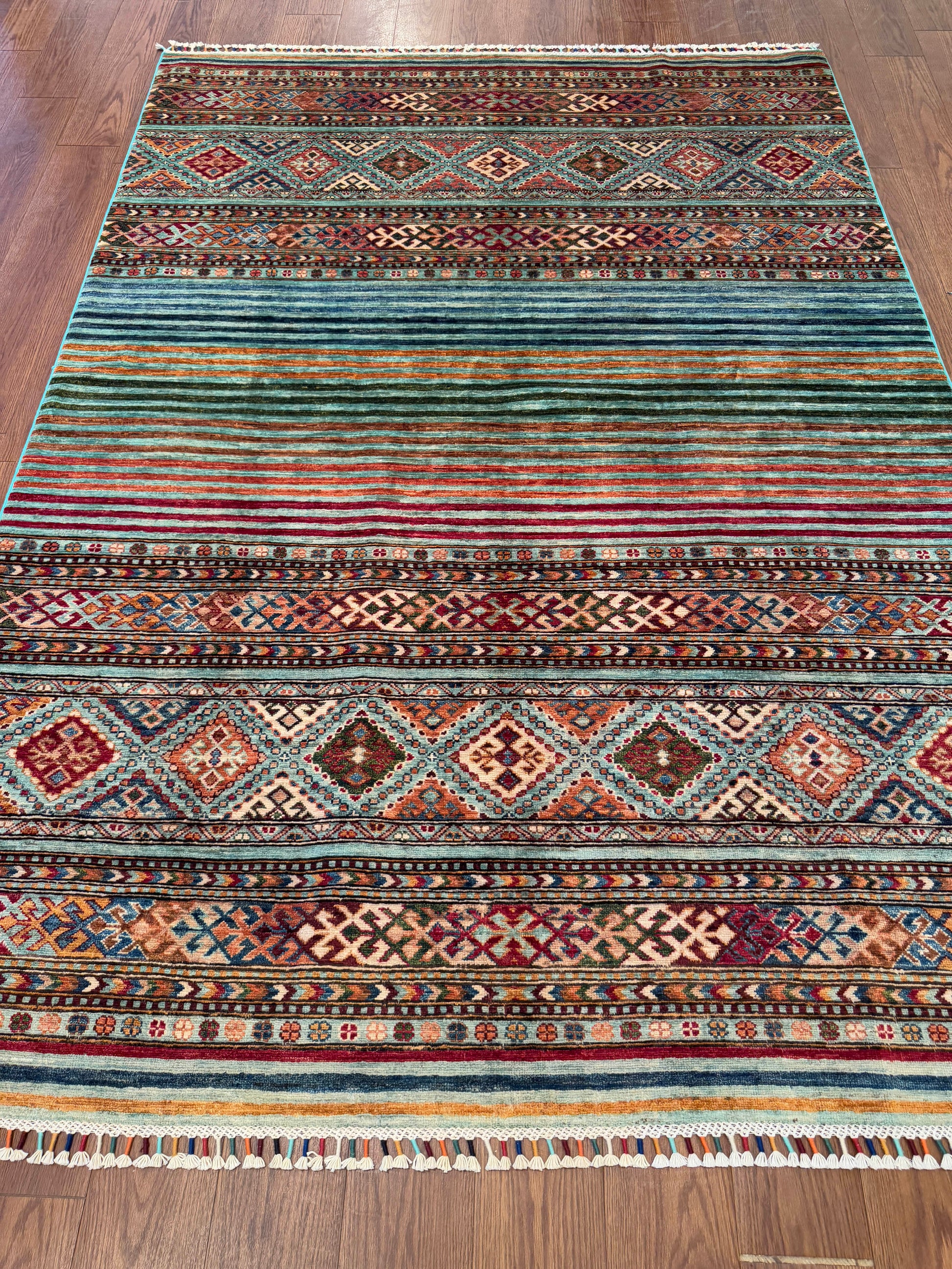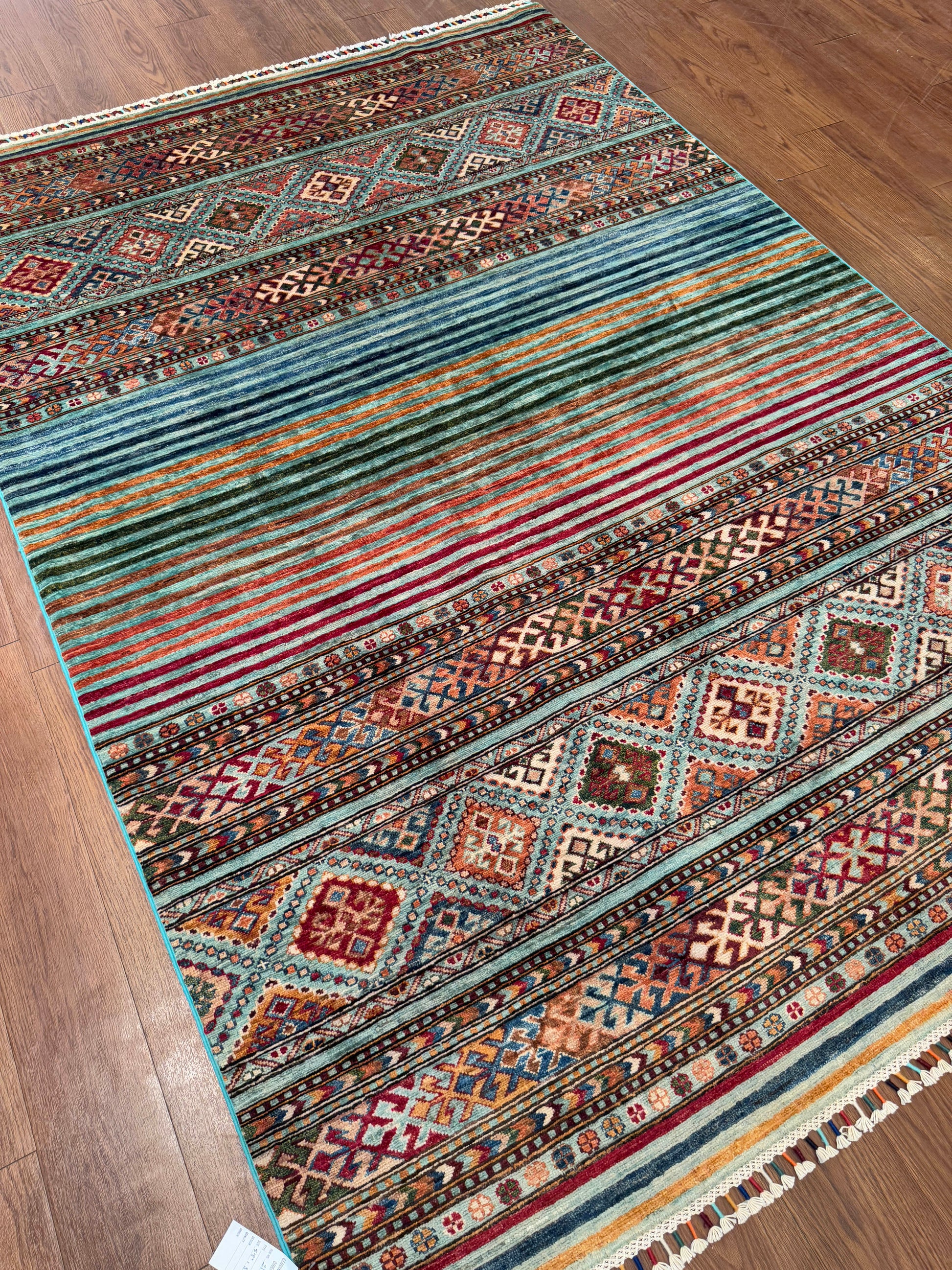 This handwoven rug displays a striking mix of horizontal stripes and intricate diamond motifs, creating a lively yet balanced aesthetic. The alternating patterns of bold stripes and geometric bands add both rhythm and depth to the design. Its vibrant use of blues, greens, oranges, and reds makes it a dynamic centerpiece. This rug seamlessly blends traditional weaving with a contemporary feel, perfect for eclectic or modern interiors.