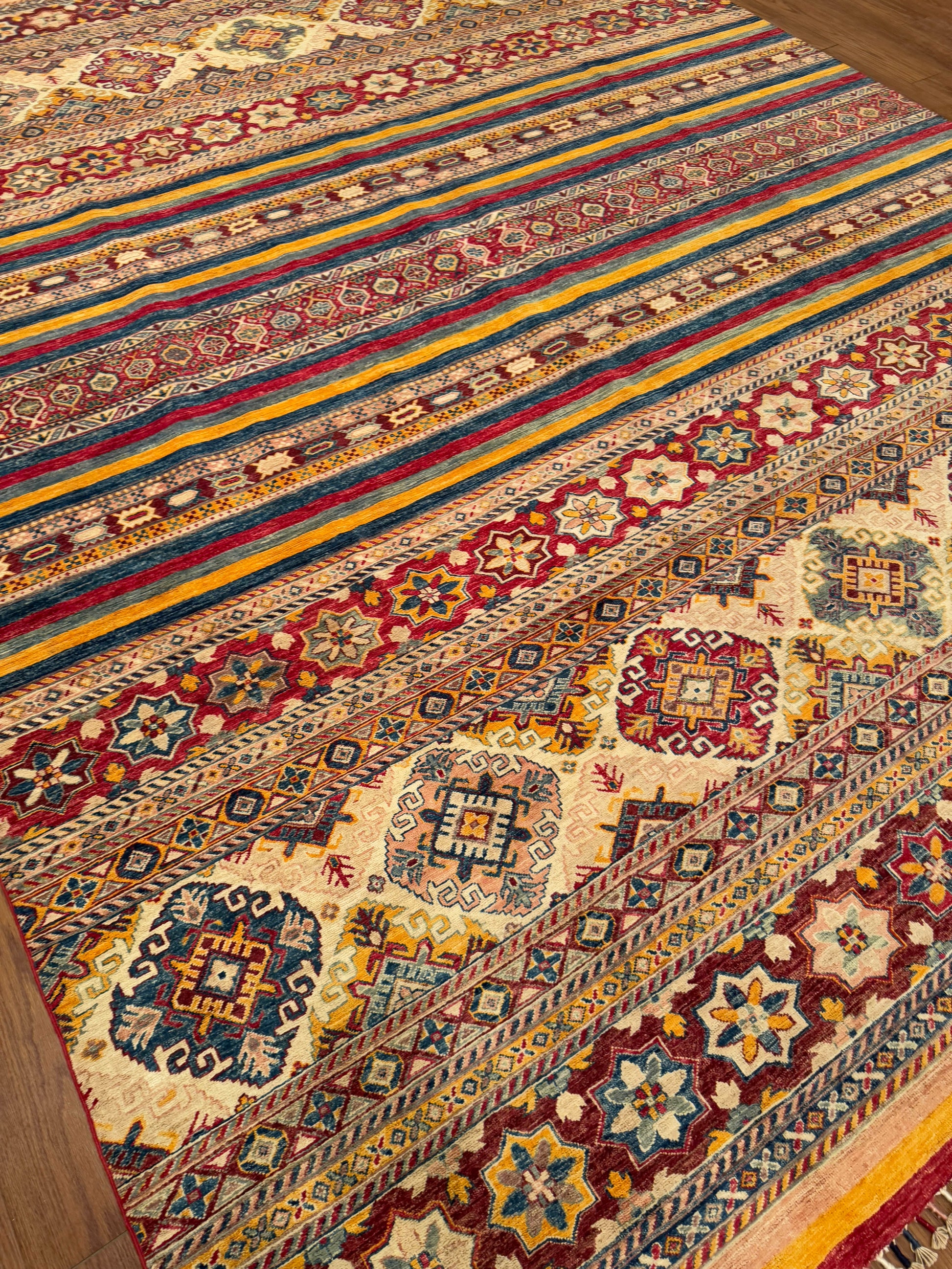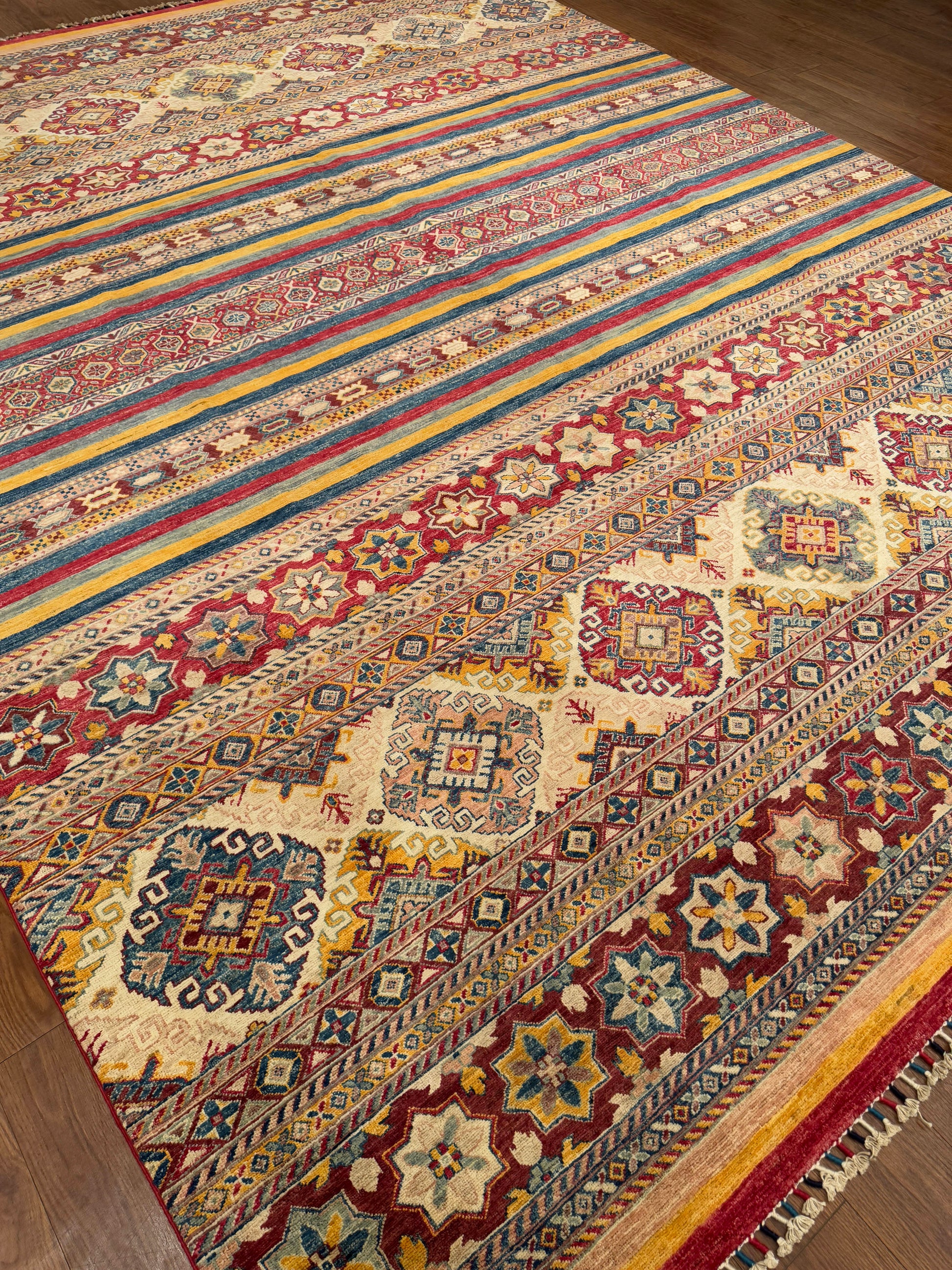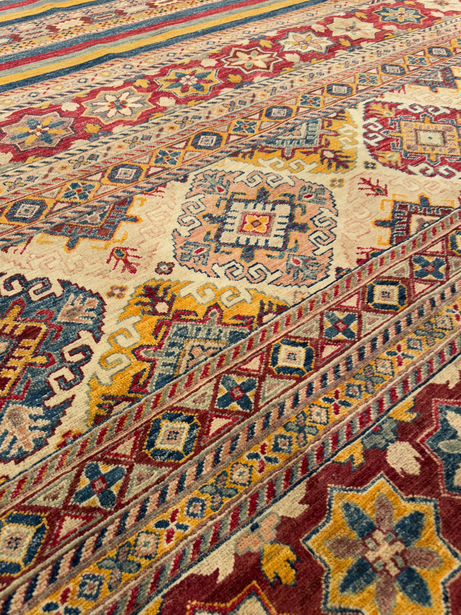 Vibrant and full of cultural charm, this handwoven rug features an exquisite combination of tribal stripes and geometric motifs inspired by traditional Caucasian designs. The rug’s colorful palette rich reds, blues, yellows, and ivory tones—creates a joyful and eclectic visual rhythm. Perfect for adding warmth and personality to any room, it blends artisanal craftsmanship with timeless folk artistry.