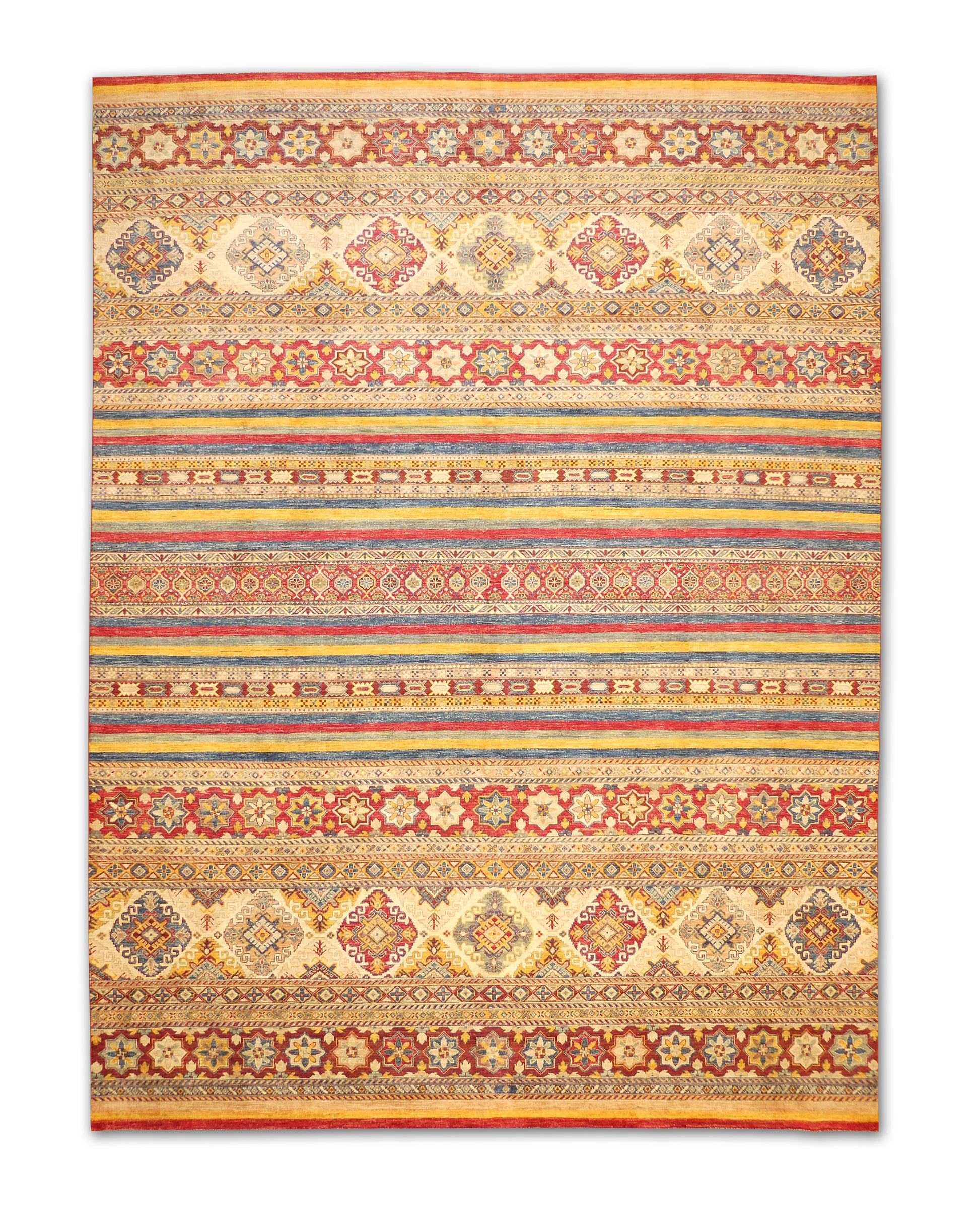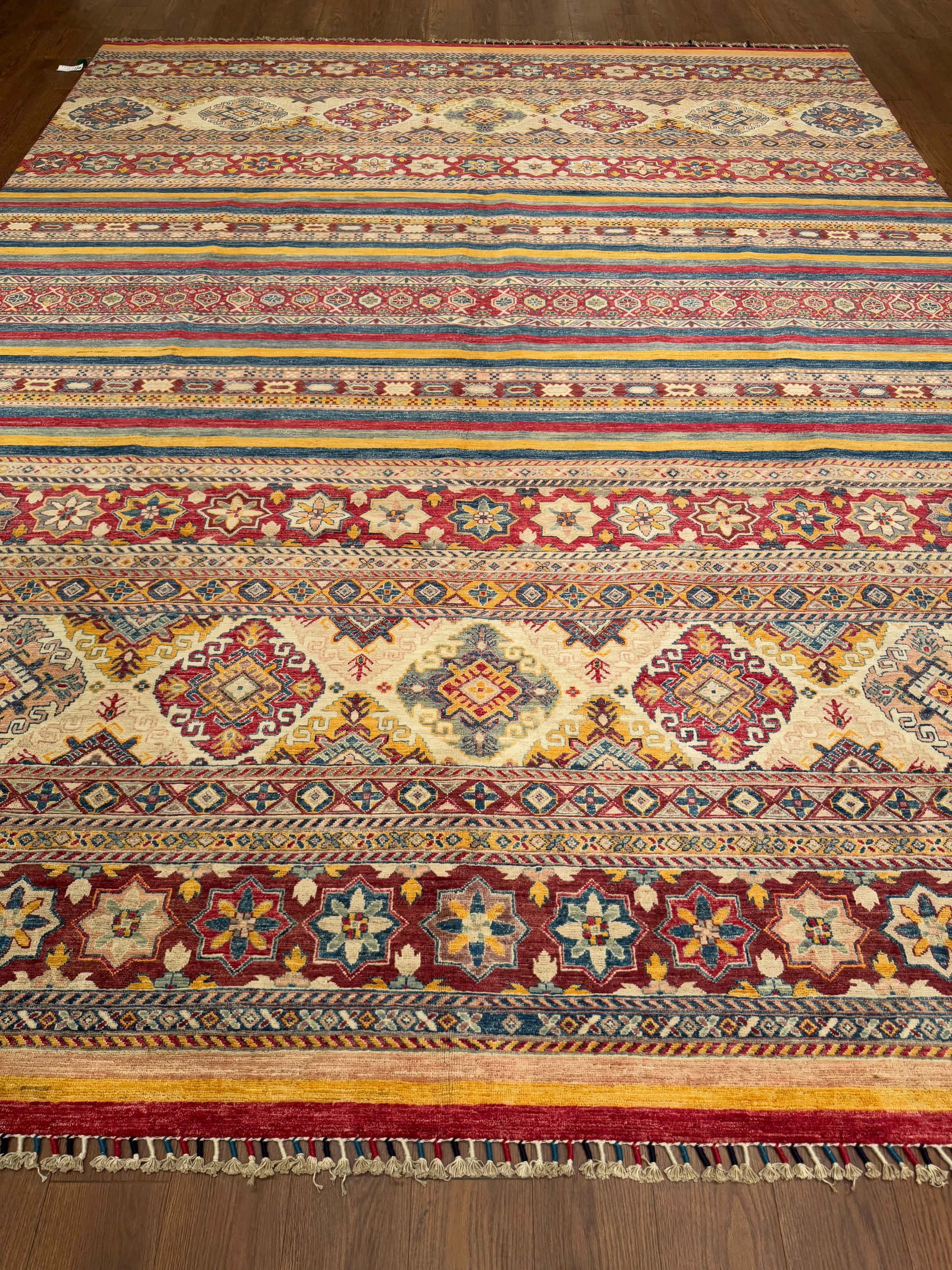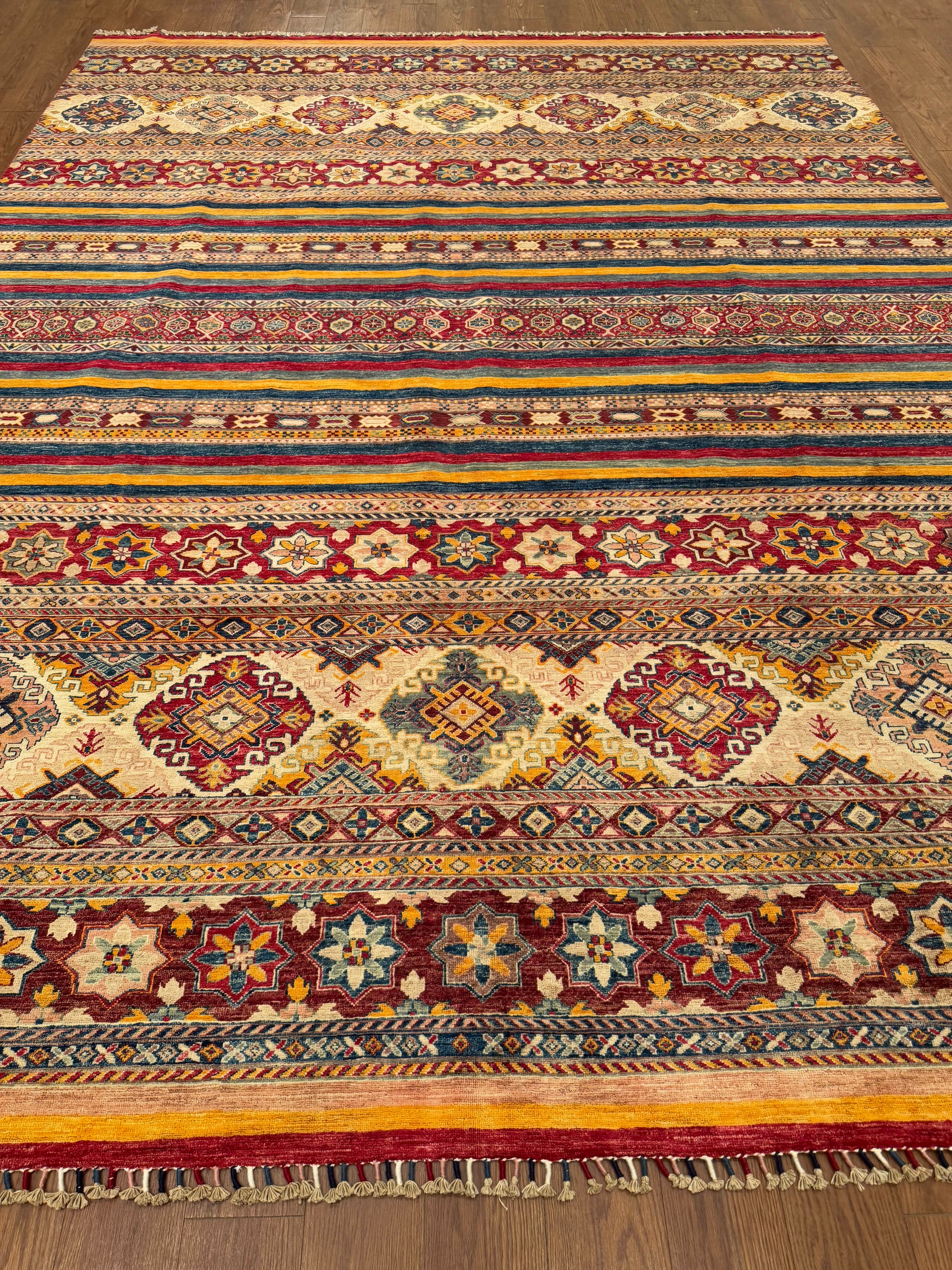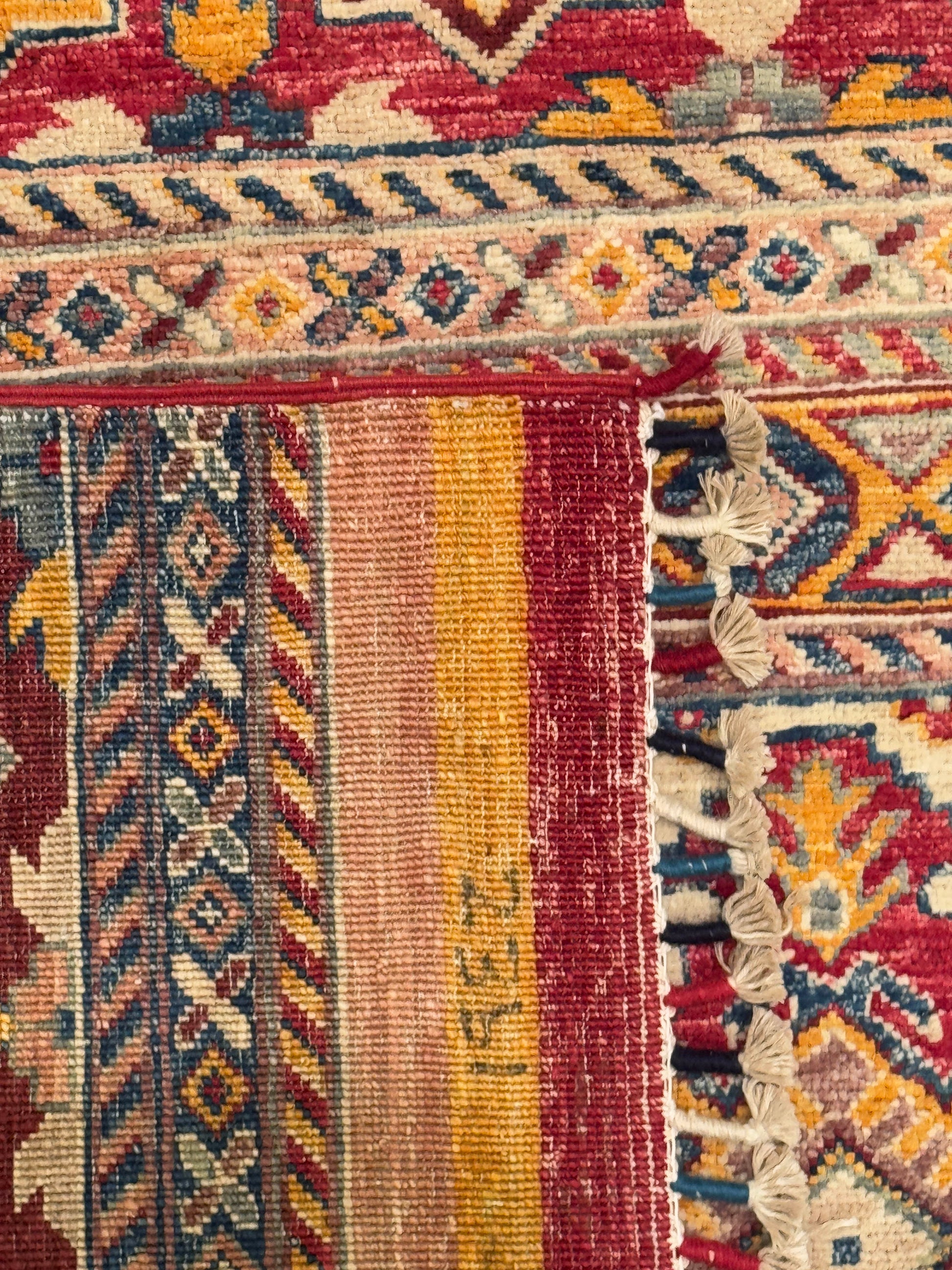 Vibrant and full of cultural charm, this handwoven rug features an exquisite combination of tribal stripes and geometric motifs inspired by traditional Caucasian designs. The rug’s colorful palette rich reds, blues, yellows, and ivory tones—creates a joyful and eclectic visual rhythm. Perfect for adding warmth and personality to any room, it blends artisanal craftsmanship with timeless folk artistry.