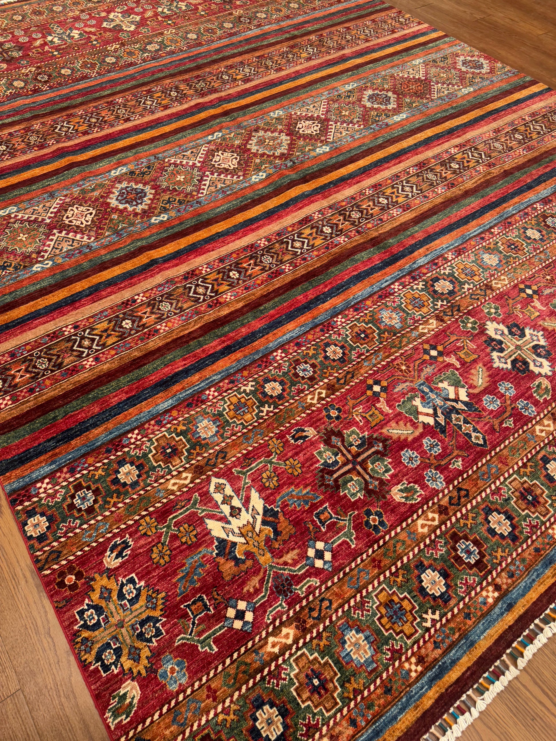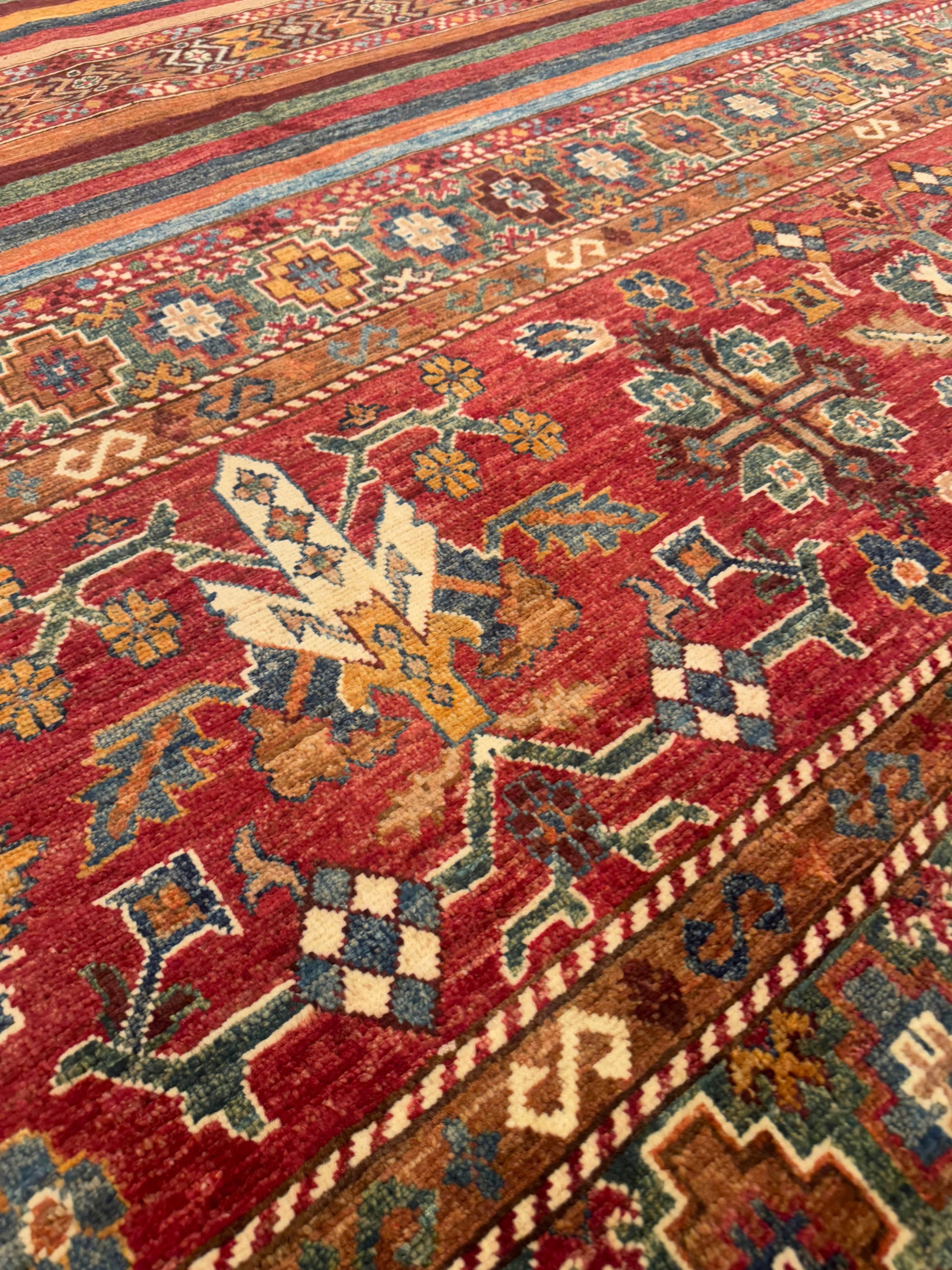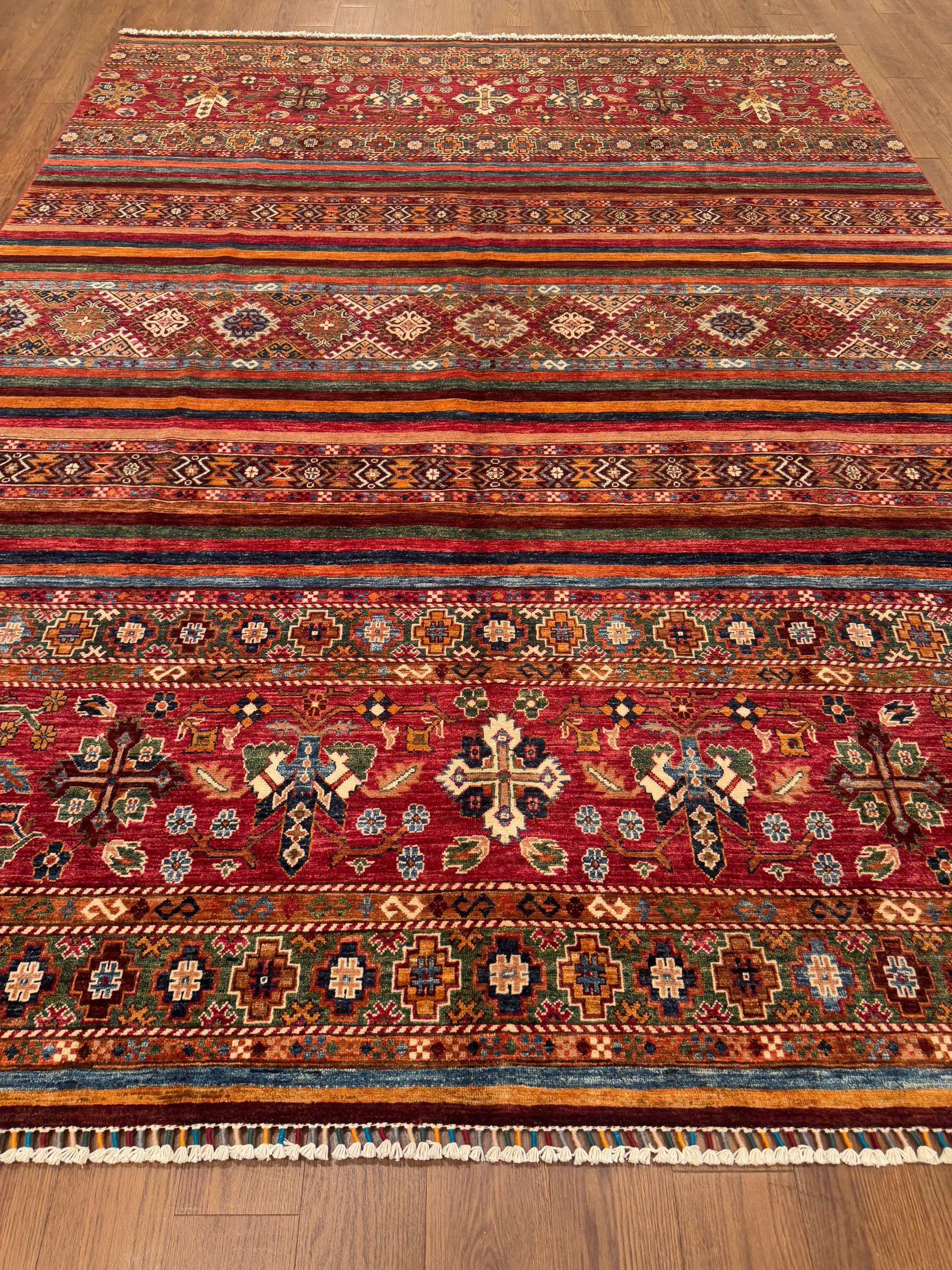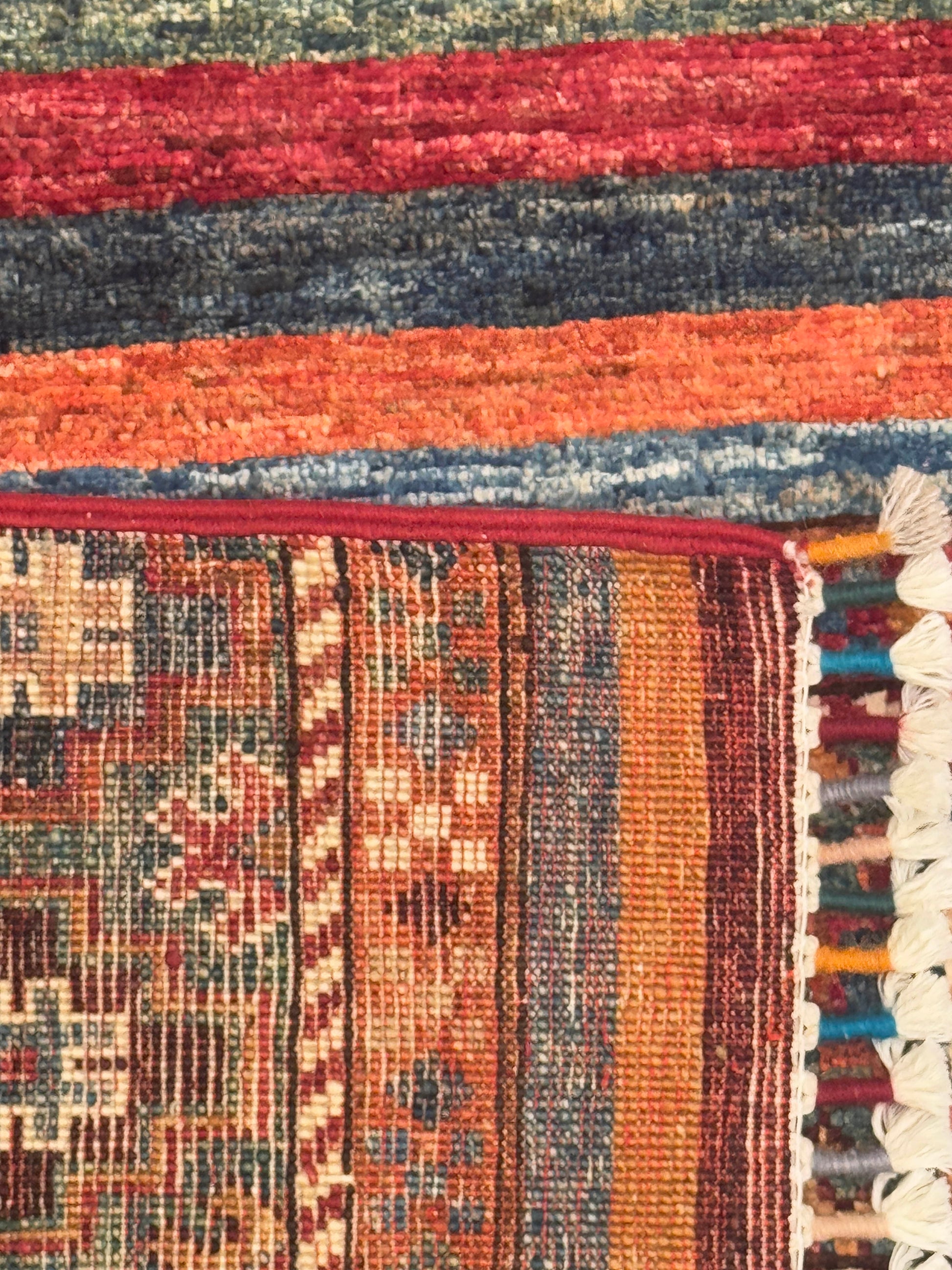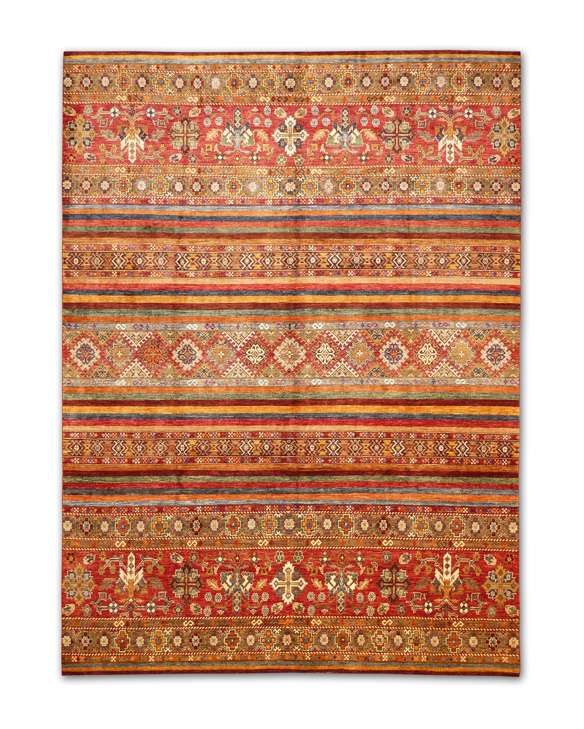 This handmade rug showcases a rich combination of horizontal tribal bands in earthy reds, rusts, and blues, punctuated by intricate diamond and cross motifs. Its layered design brings depth and rhythm, while subtle abrash shading enhances its artisanal character. The bold yet balanced pattern makes it a stunning addition to eclectic and bohemian spaces.