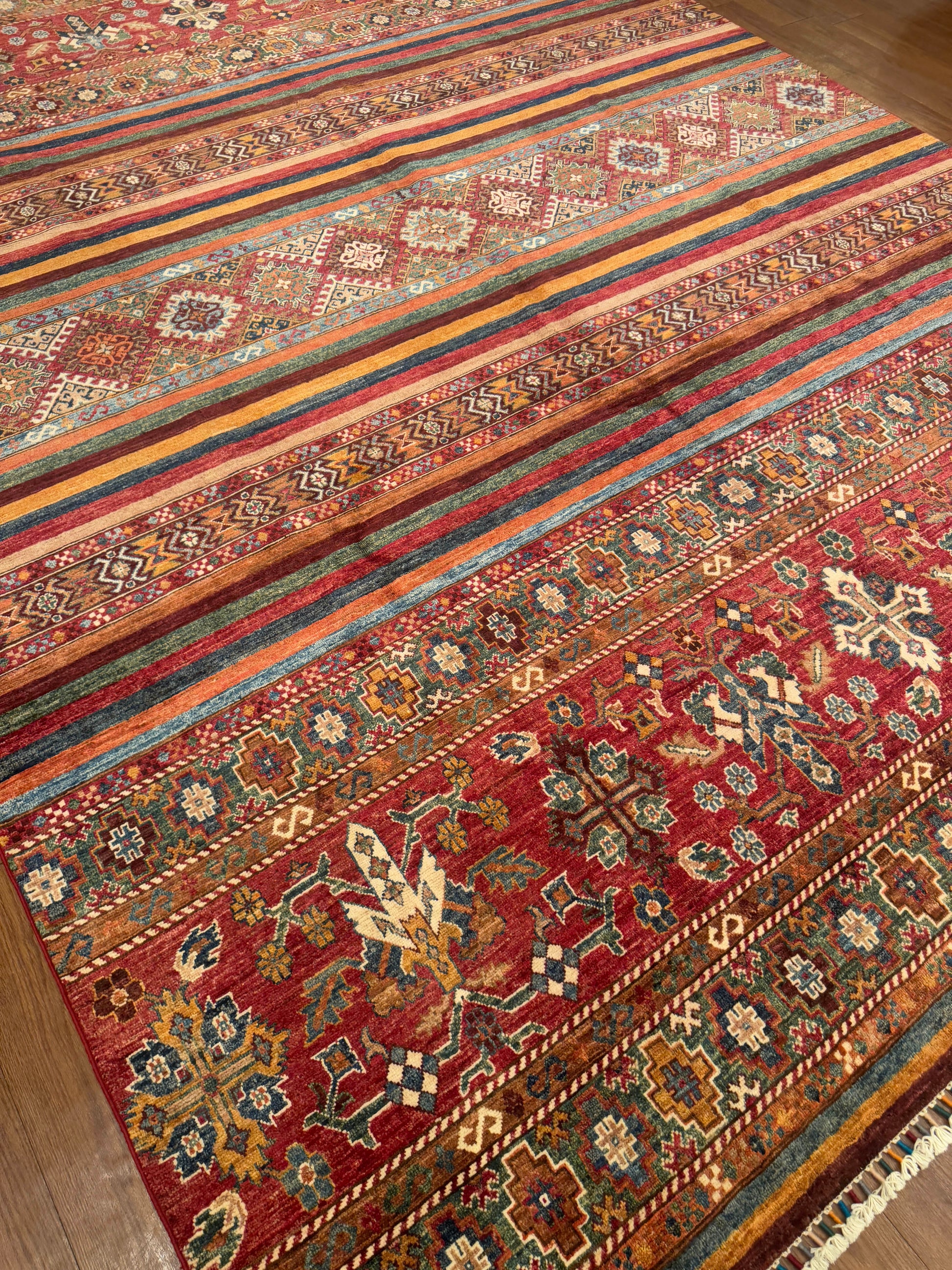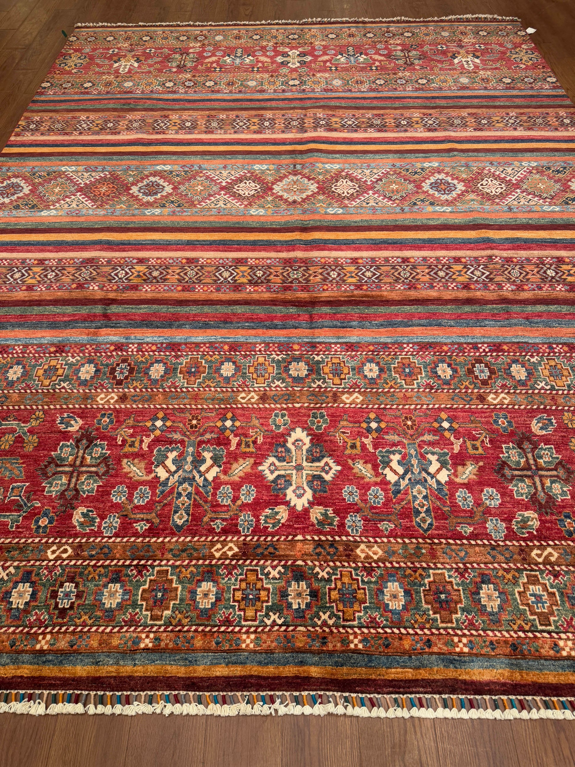 - Design: Horizontal bands with geometric and tribal motifs