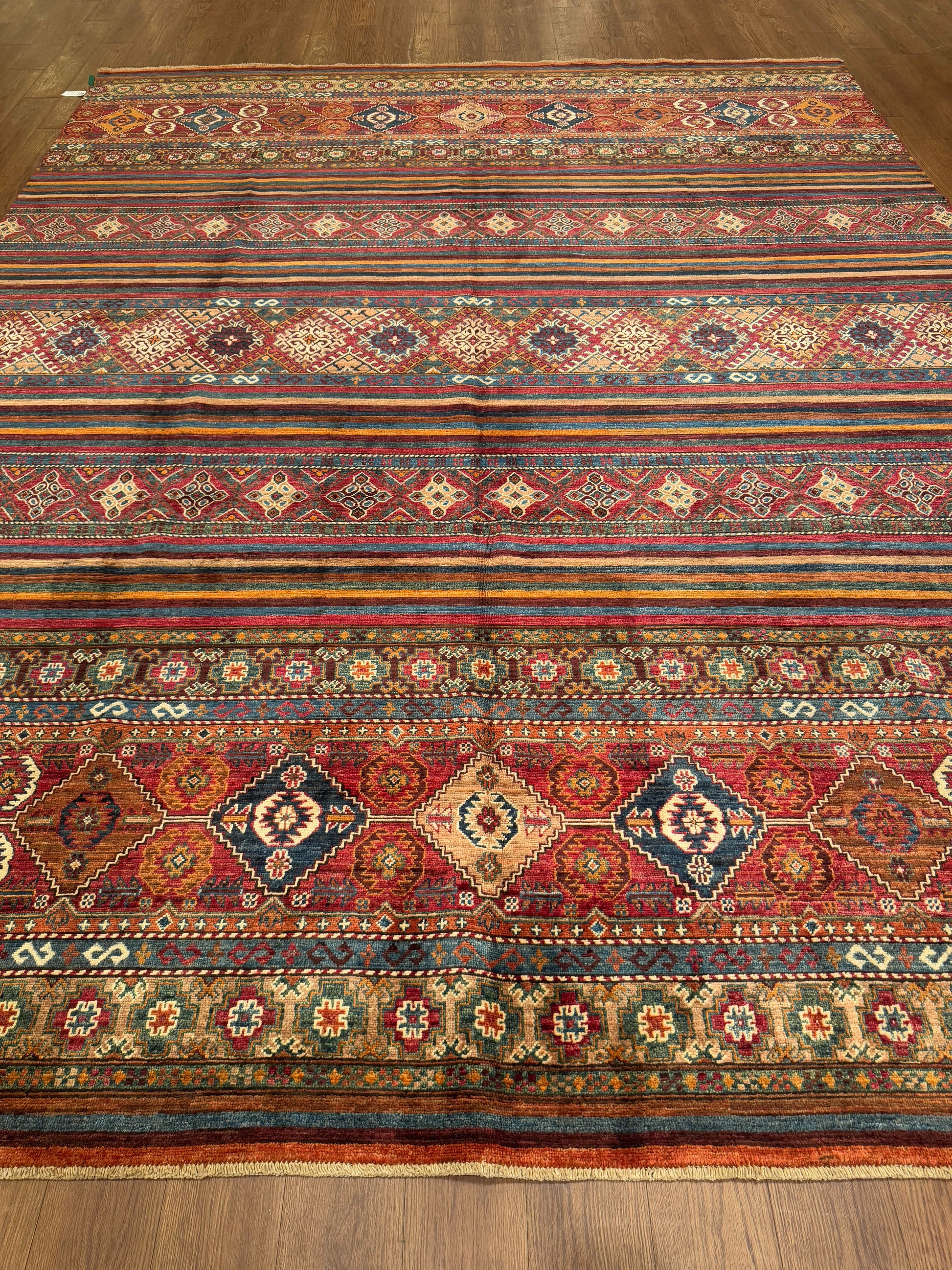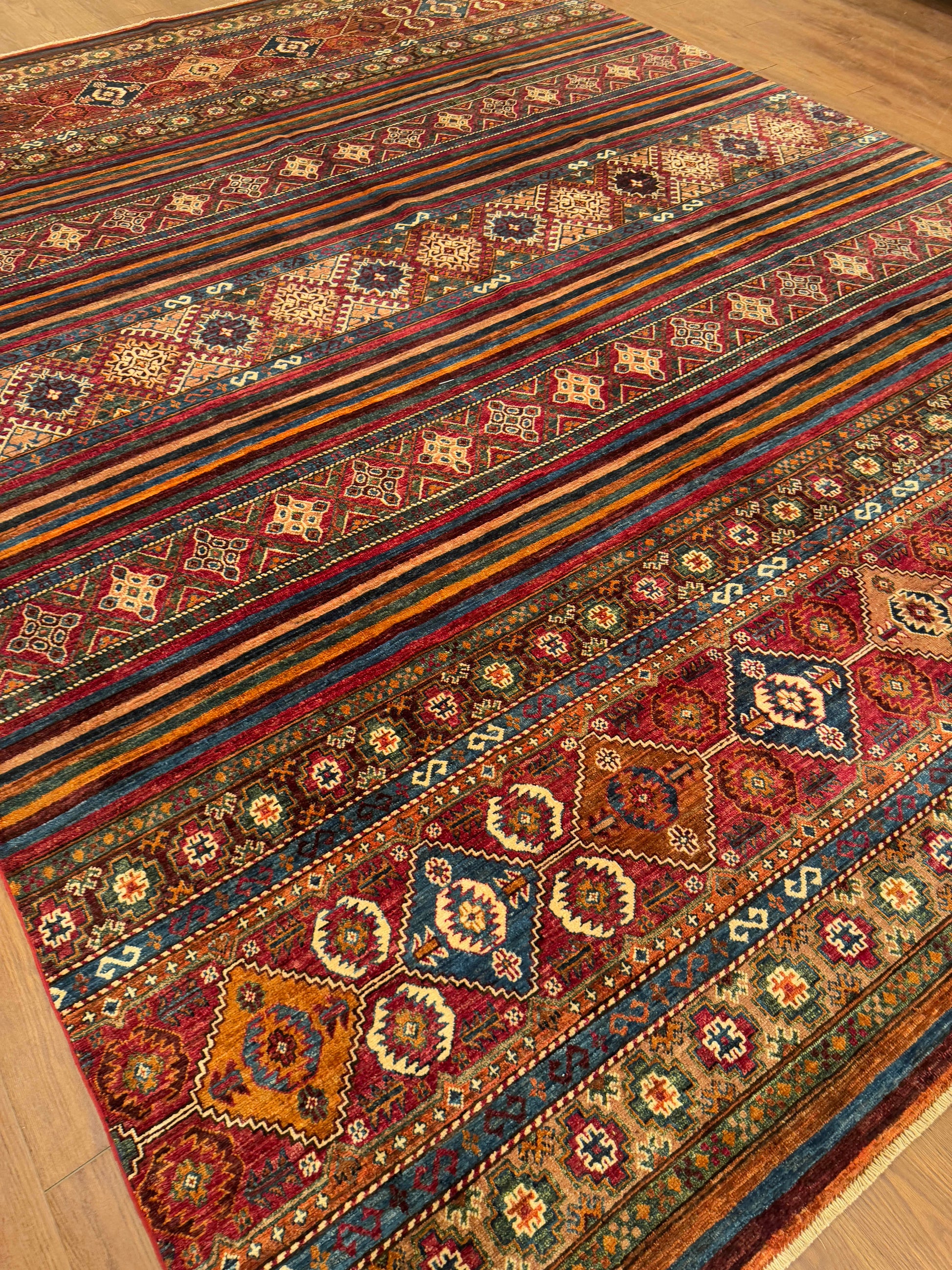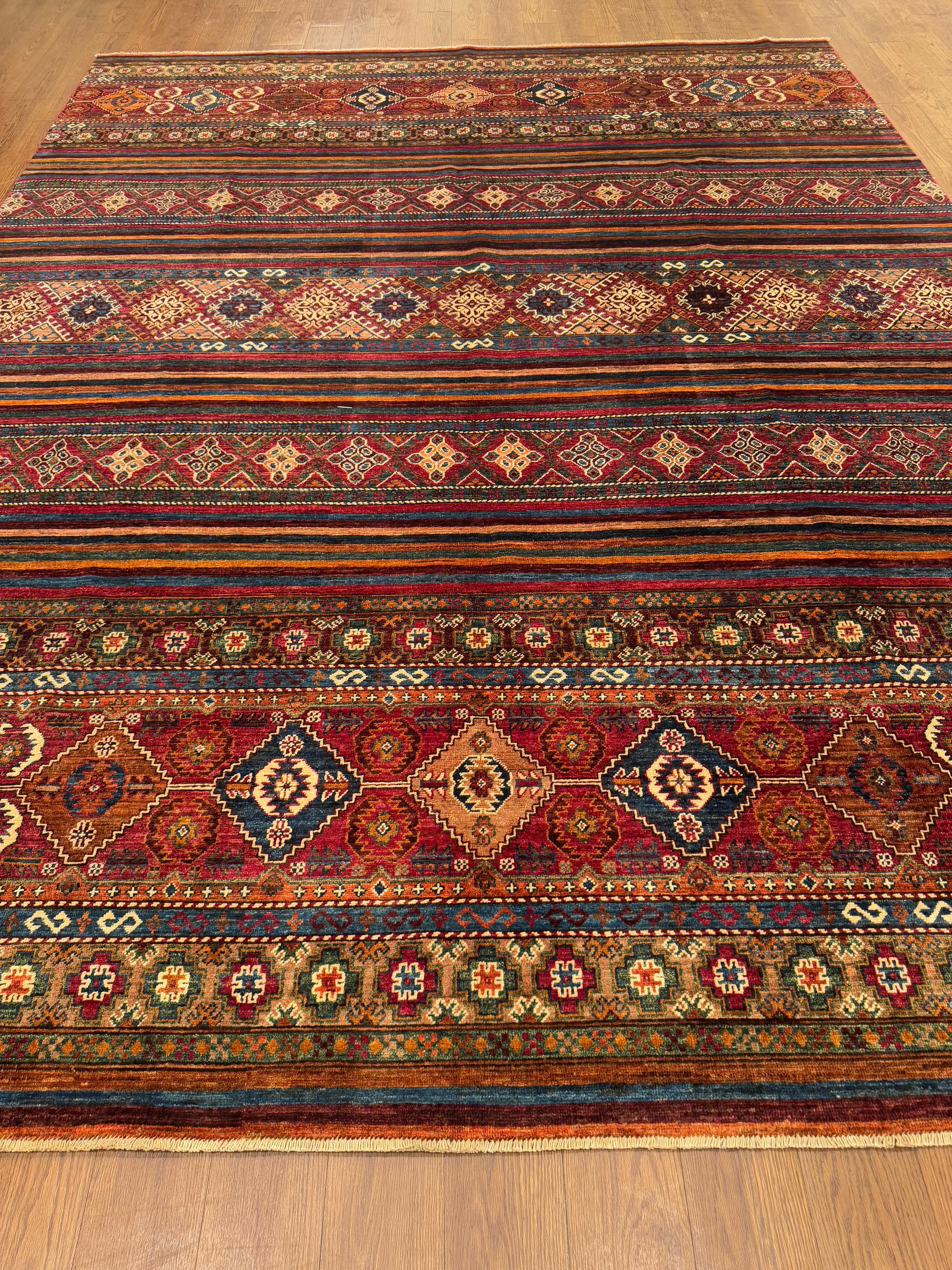 This handmade rug displays a captivating series of horizontal tribal bands filled with intricate geometric patterns and symbolic motifs. The warm palette of rust, navy, gold, olive, and ivory creates a sense of depth and cultural richness. Crafted from fine wool, this rug showcases timeless craftsmanship and adds texture, color, and authenticity to both rustic and contemporary spaces.