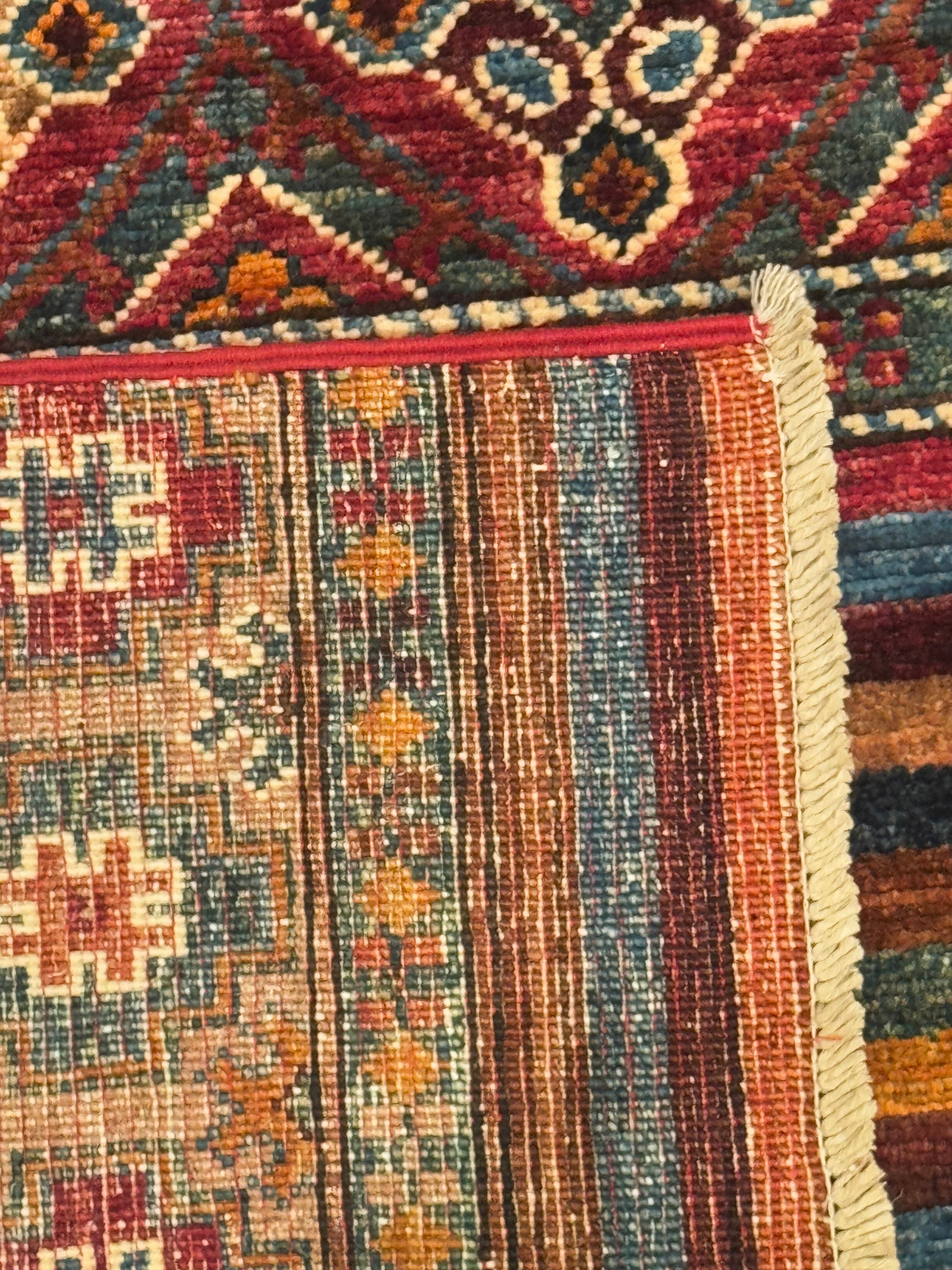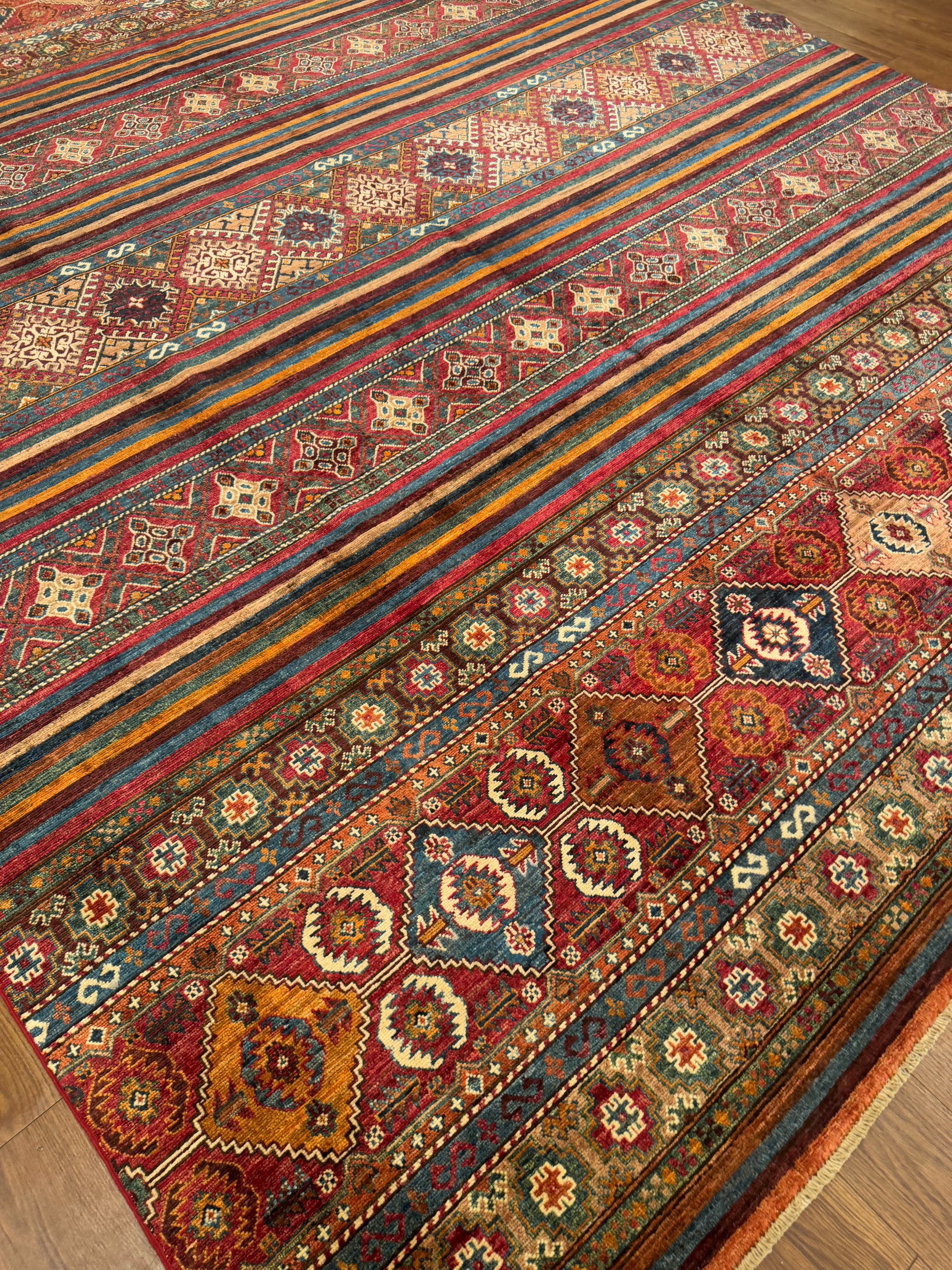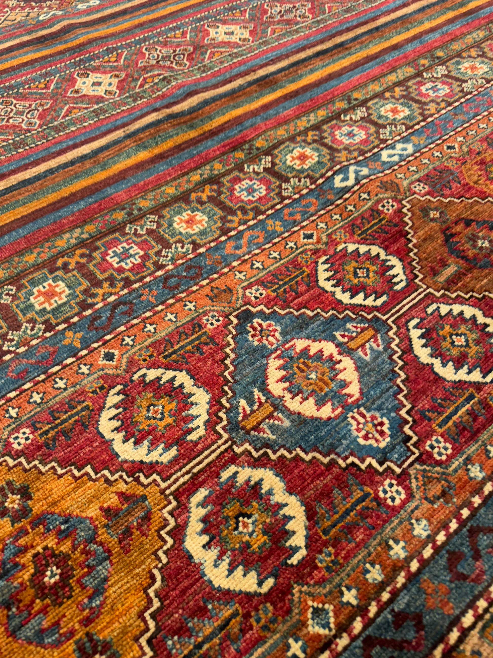 This handmade rug displays a captivating series of horizontal tribal bands filled with intricate geometric patterns and symbolic motifs. The warm palette of rust, navy, gold, olive, and ivory creates a sense of depth and cultural richness. Crafted from fine wool, this rug showcases timeless craftsmanship and adds texture, color, and authenticity to both rustic and contemporary spaces.