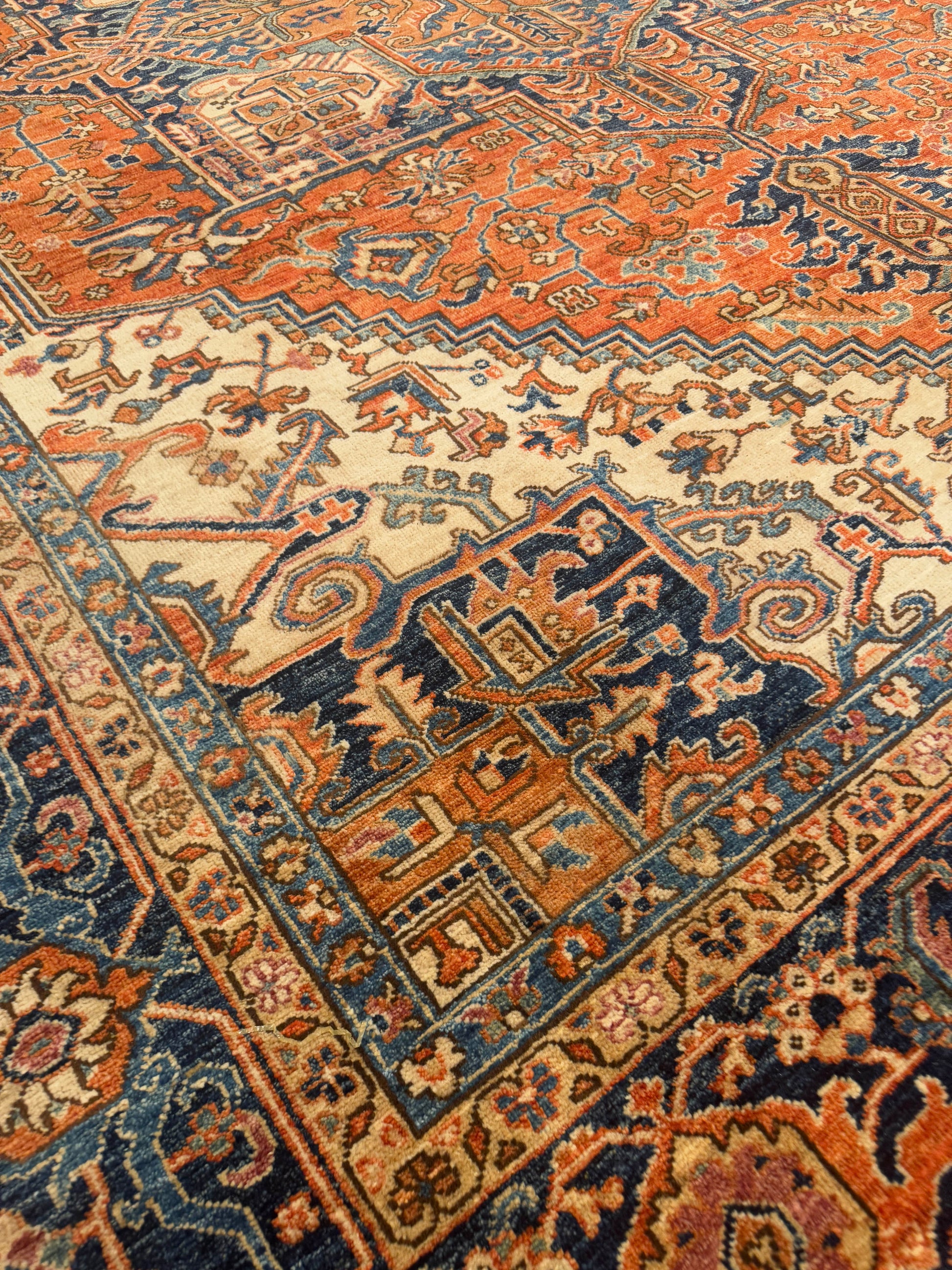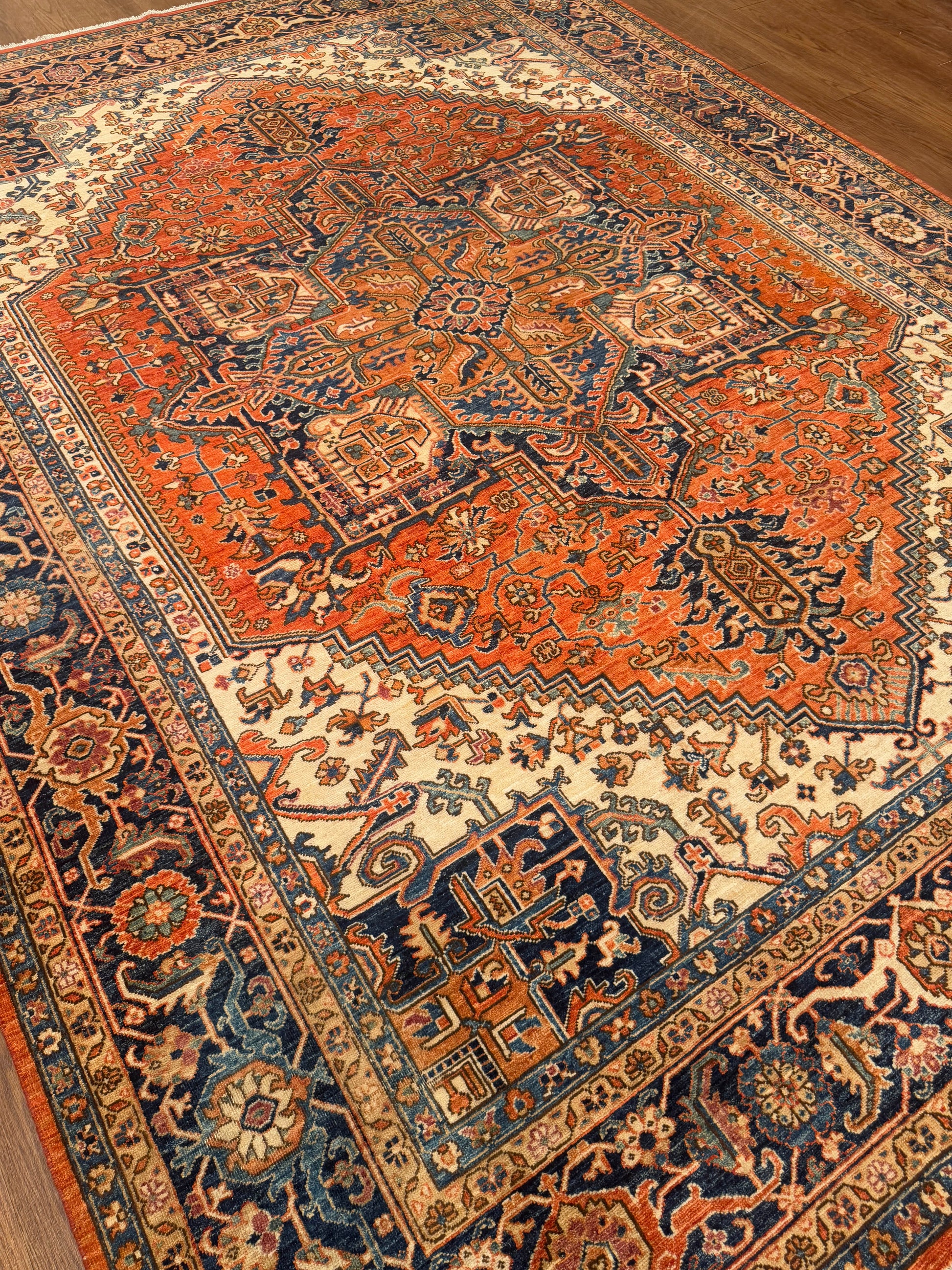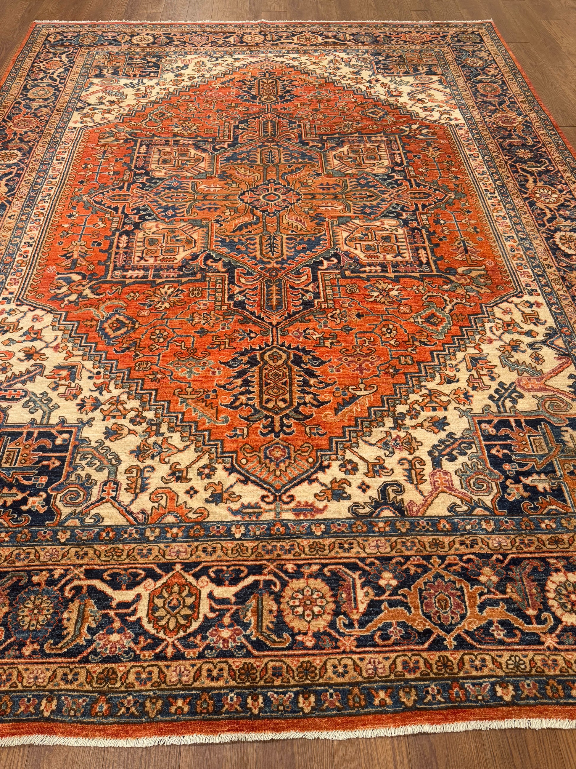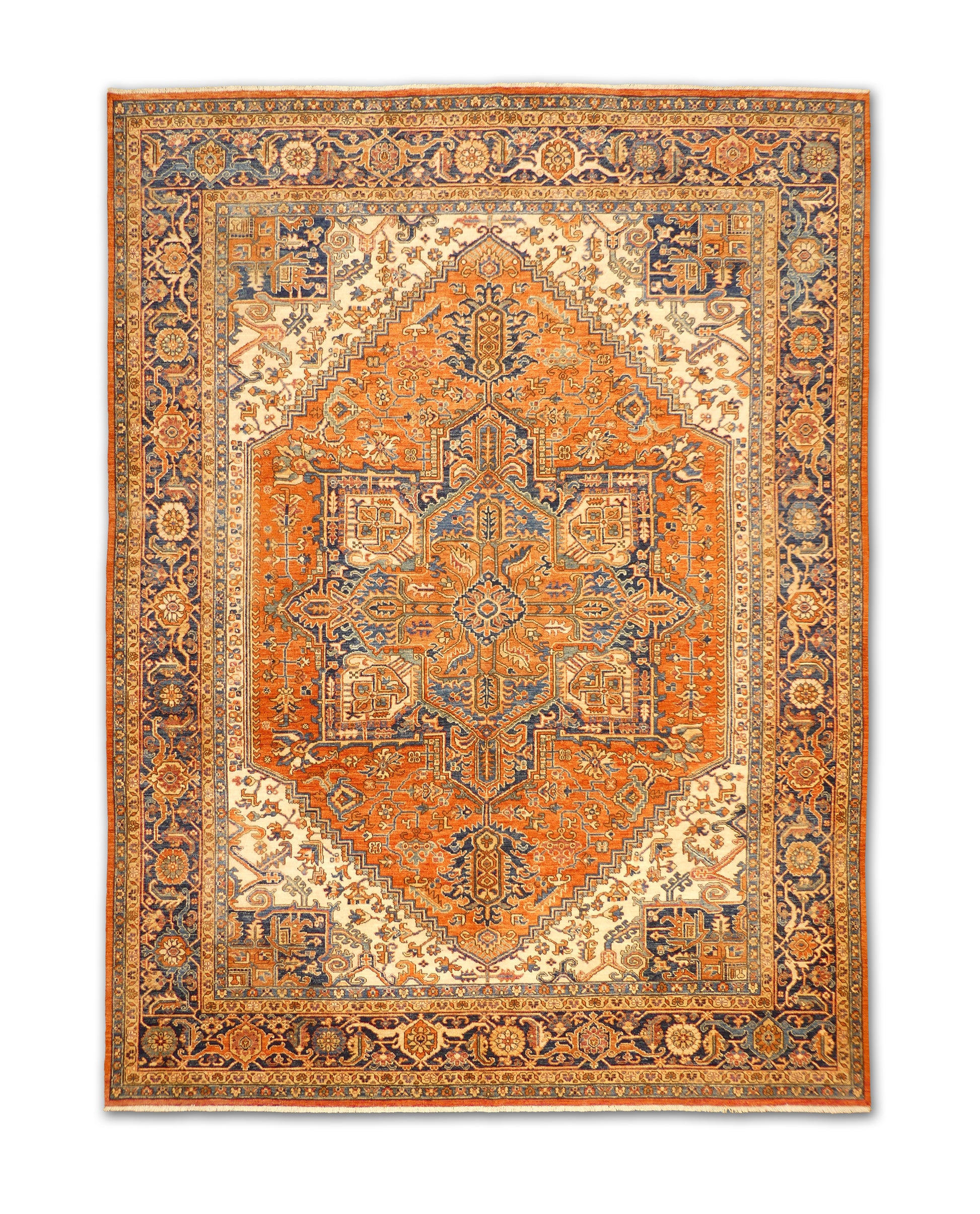 This handmade rug displays a bold central medallion surrounded by intricate angular motifs and a beautifully layered border. The vibrant palette of burnt orange, navy blue, ivory, and soft beige creates a rich contrast that highlights its geometric artistry. Every detail is handwoven with precision, resulting in a timeless piece that adds warmth and sophistication to any room.