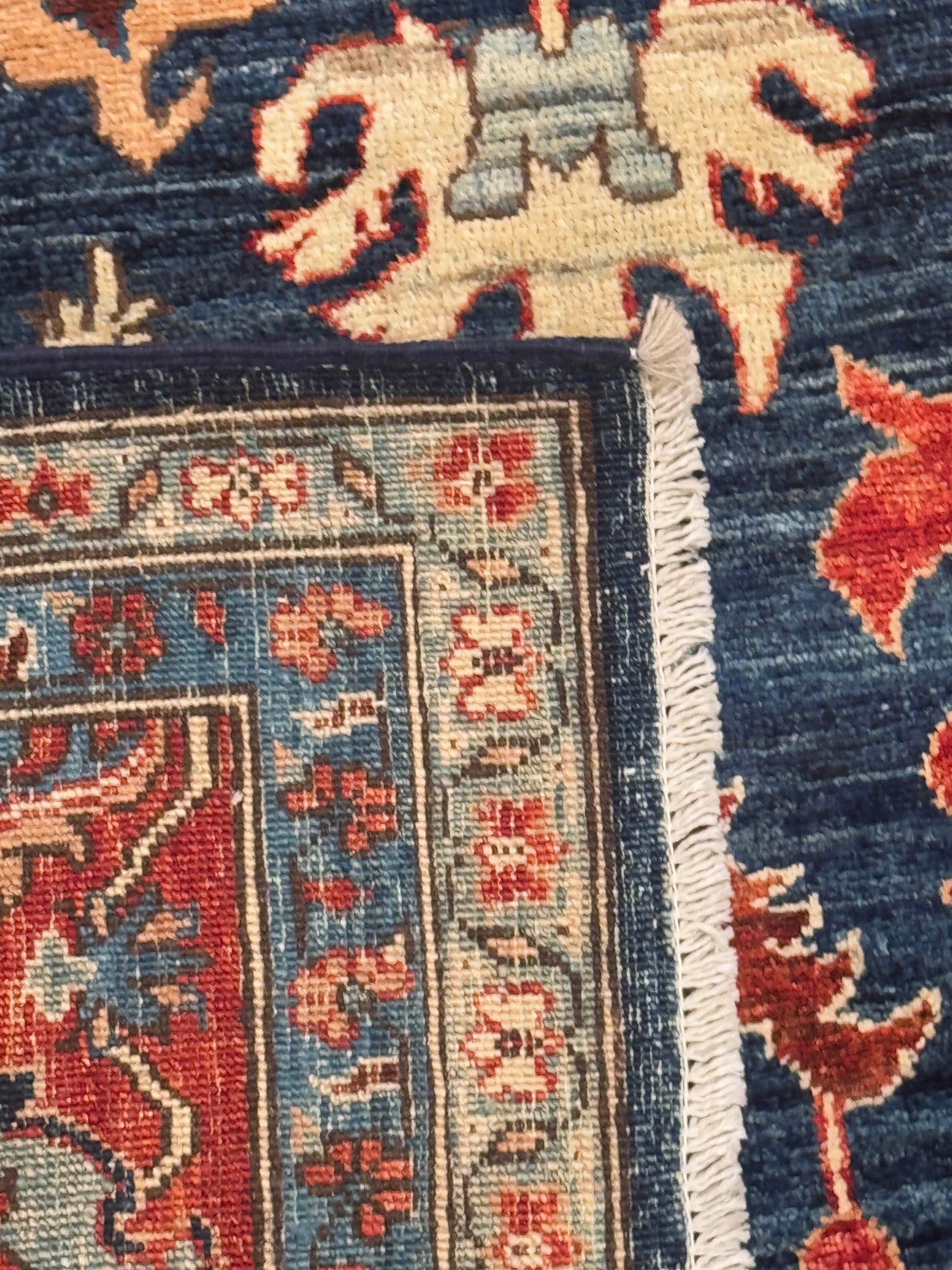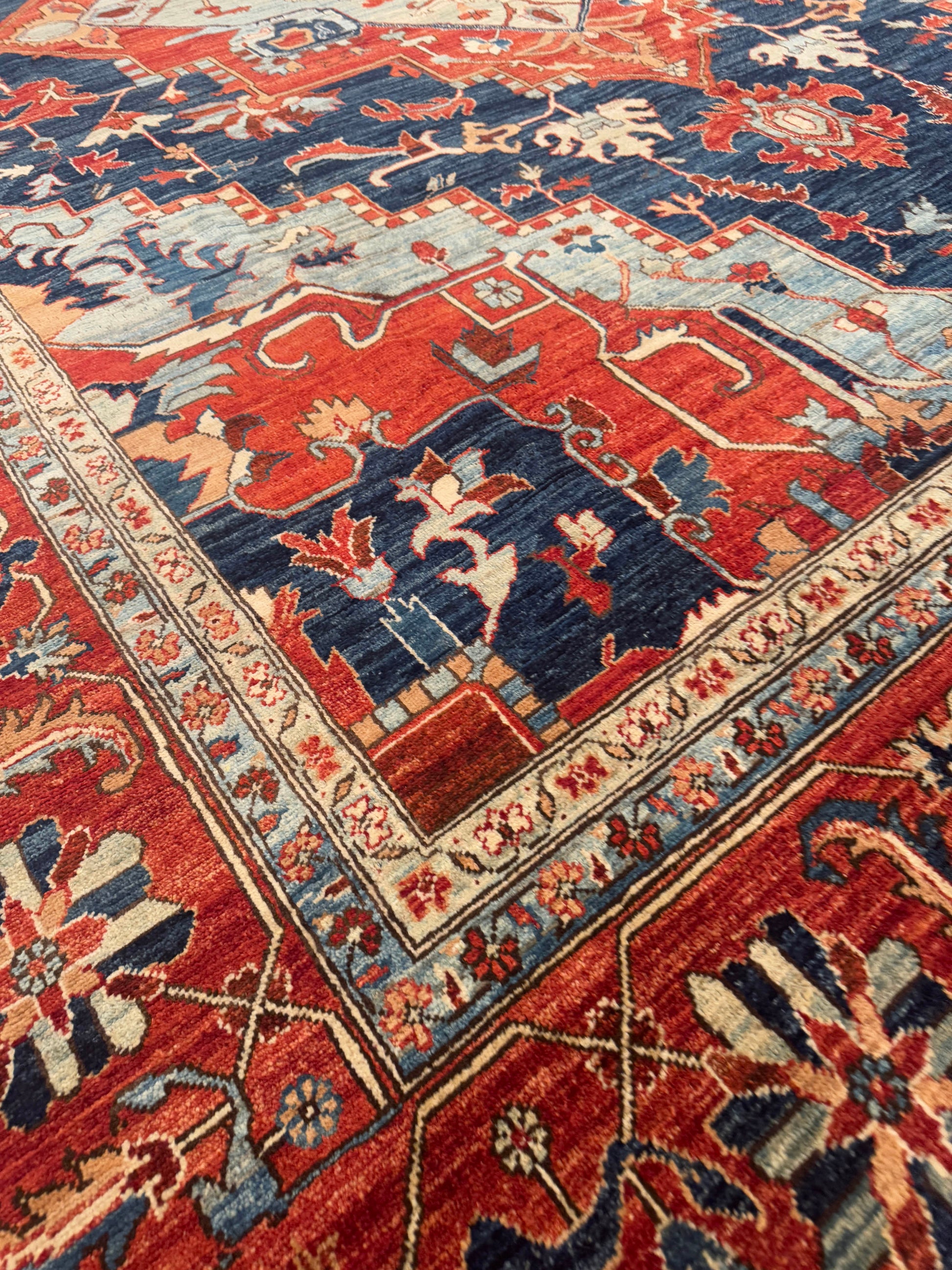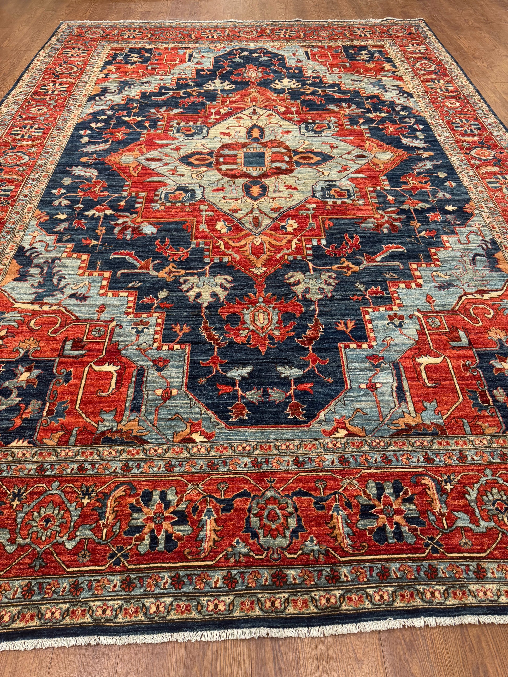 This handmade rug features a bold geometric medallion centered within an intricate field of floral and angular motifs. The rich palette of navy, red, ivory, and soft blue creates a striking contrast that embodies classic Heriz artistry. Woven from fine wool, this rug combines durability with timeless elegance, making it a powerful statement piece for any traditional or transitional interior.