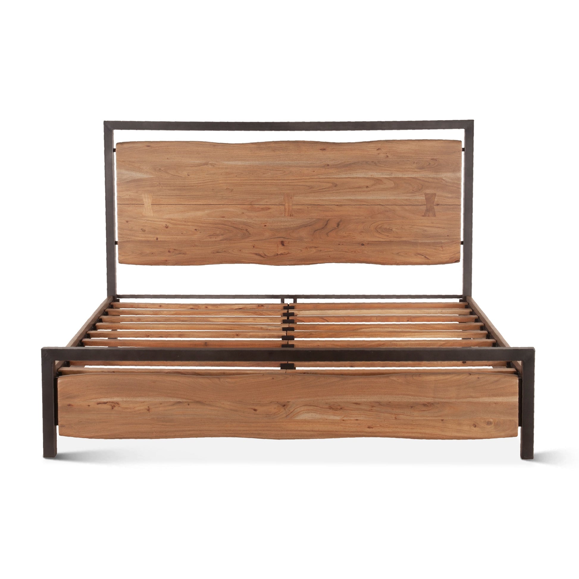 This bed brings together the warmth of smoked acacia wood and the refined structure of modern design. Its faux live-edge detailing softens the sleek lines of the iron base, creating a natural harmony between organic form and contemporary craftsmanship. Built from solid acacia and reclaimed iron using heirloom-quality techniques, it’s designed for lasting strength and character. The butterfly joinery and smooth finish lend a touch of artistry, making it a versatile centerpiece for both rustic and modern interiors.