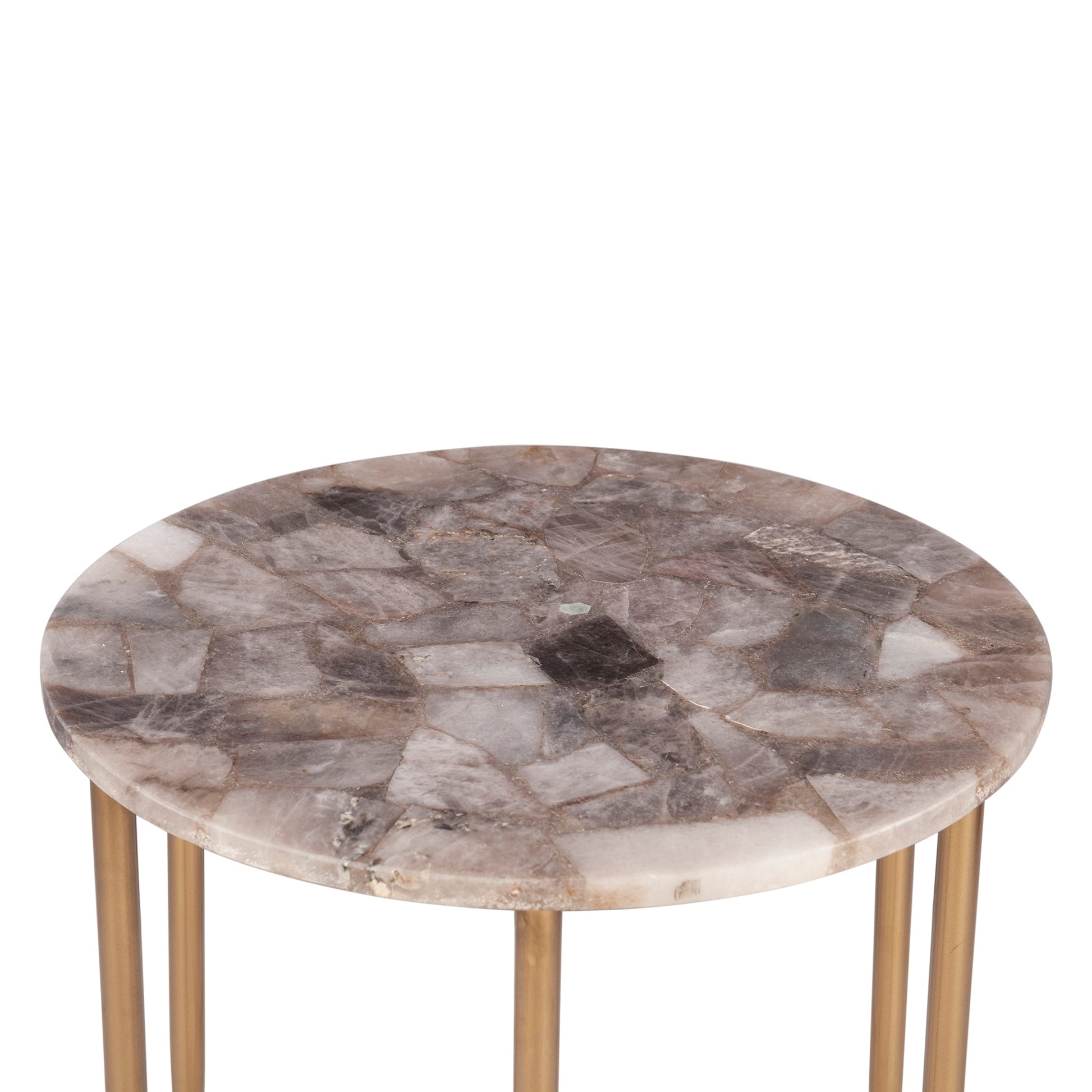 This side table celebrates the natural beauty of translucent smoky quartz, creating a luminous focal point for refined interiors. The rich tonal depth of the stone pairs perfectly with the antique gold reclaimed iron base, forming a sophisticated balance between organic material and sculptural metalwork. Elegant and versatile, it serves beautifully as a statement accent beside a sofa, armchair, or bed. Each top is uniquely patterned, highlighting the individual character of the natural stone.