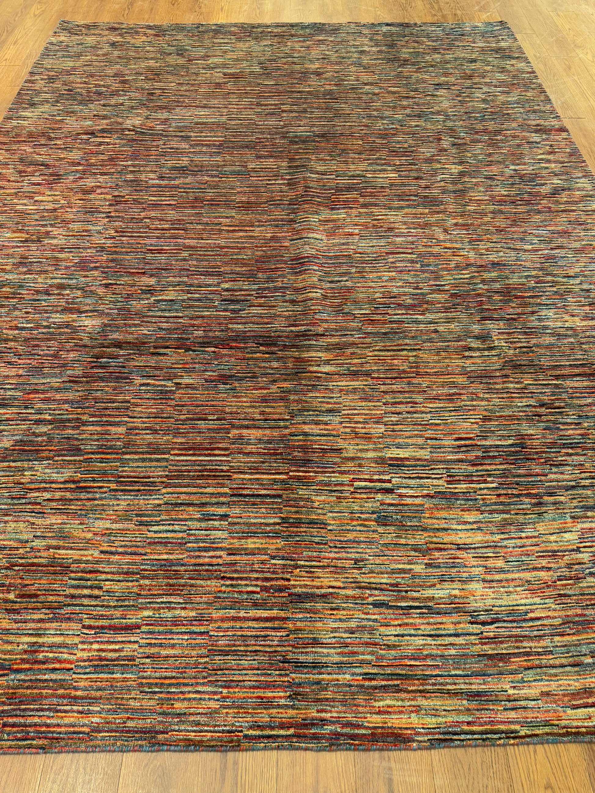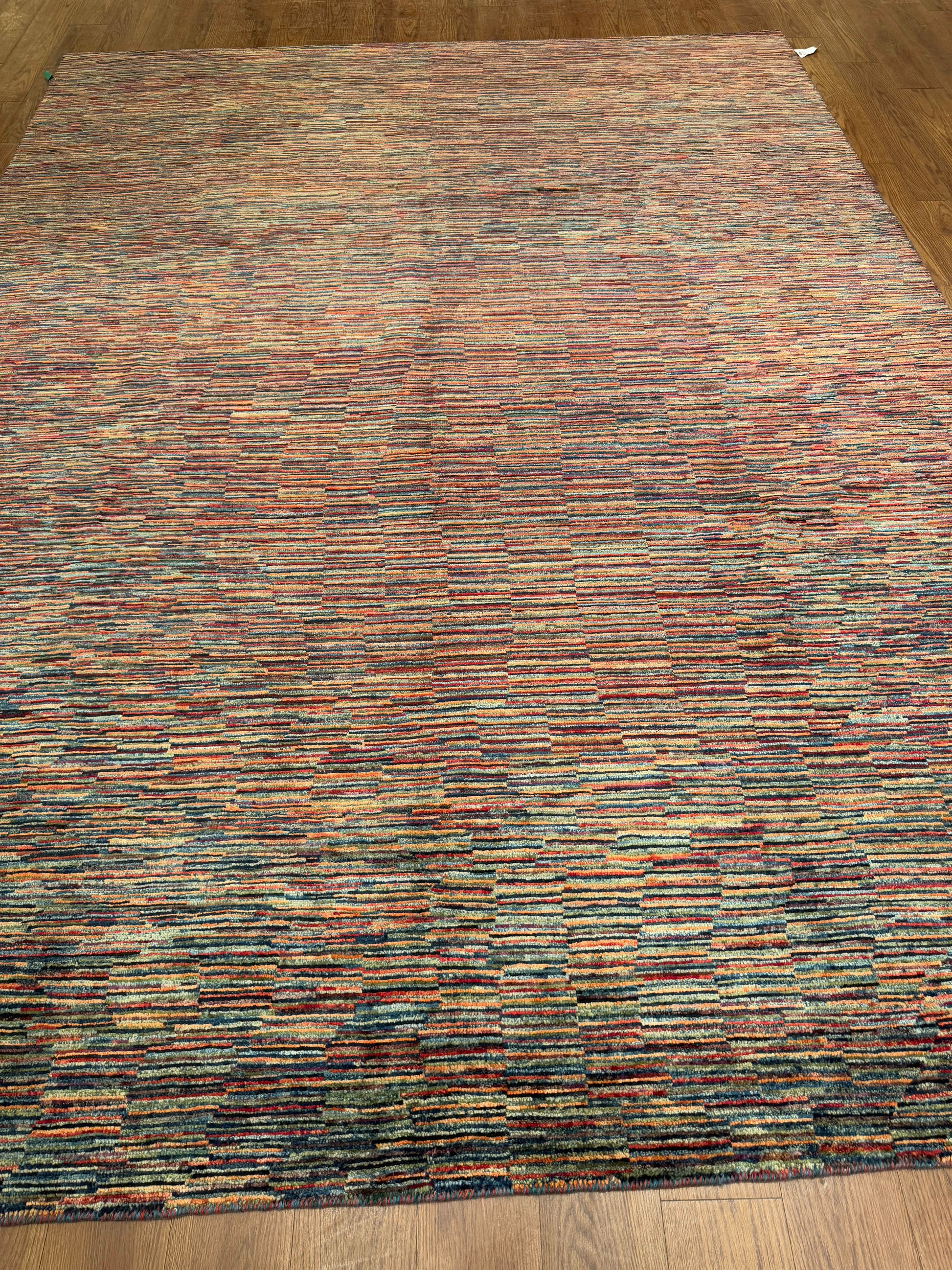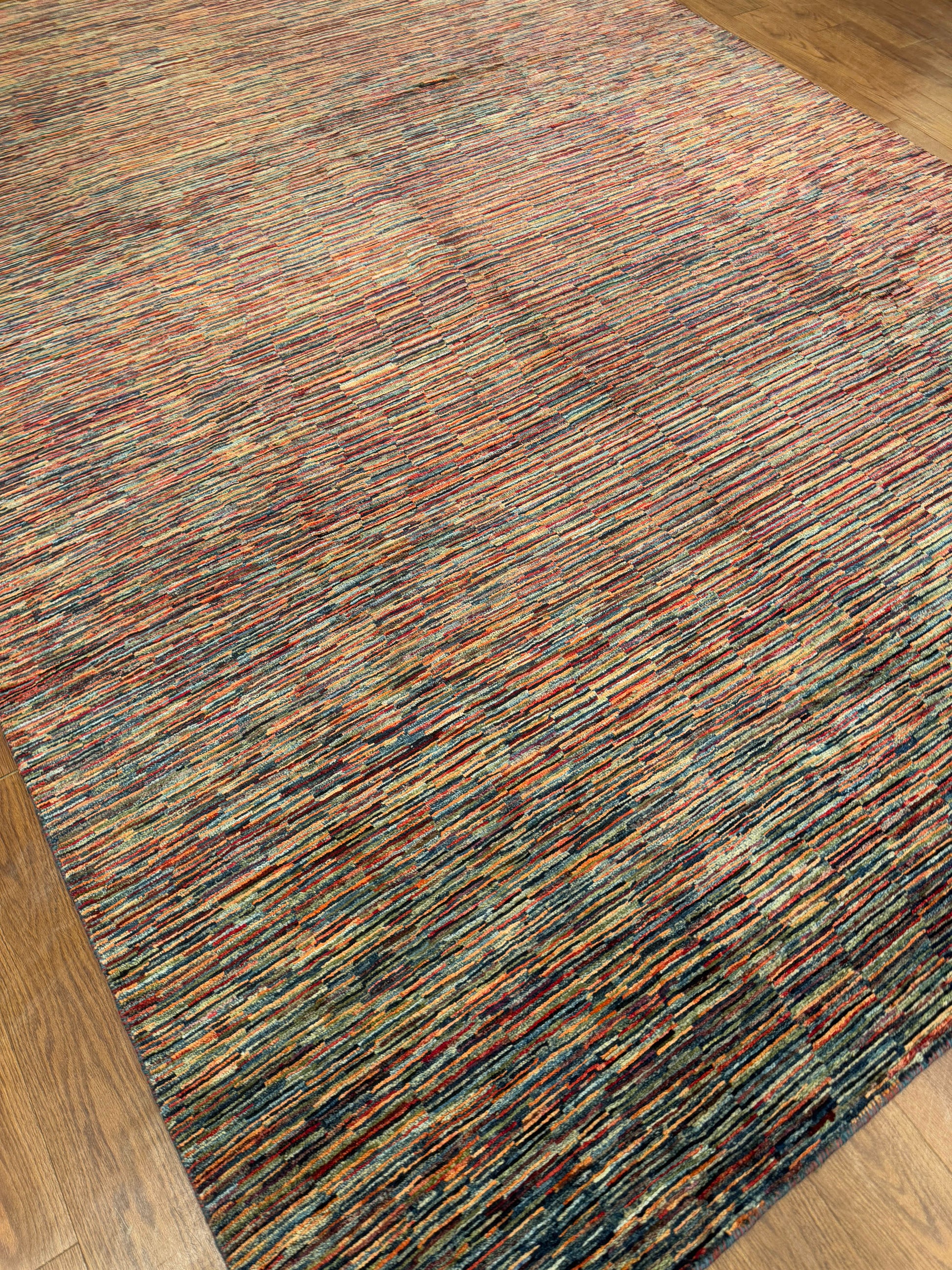 This handmade rug presents a contemporary linear design, blending subtle rhythm with a refined texture. The composition features countless horizontal strokes in shades of terracotta, teal, gold, navy, and olive, creating a dynamic yet soothing visual flow. Its modern aesthetic and earthy tones make it a versatile choice for both contemporary and transitional interiors.