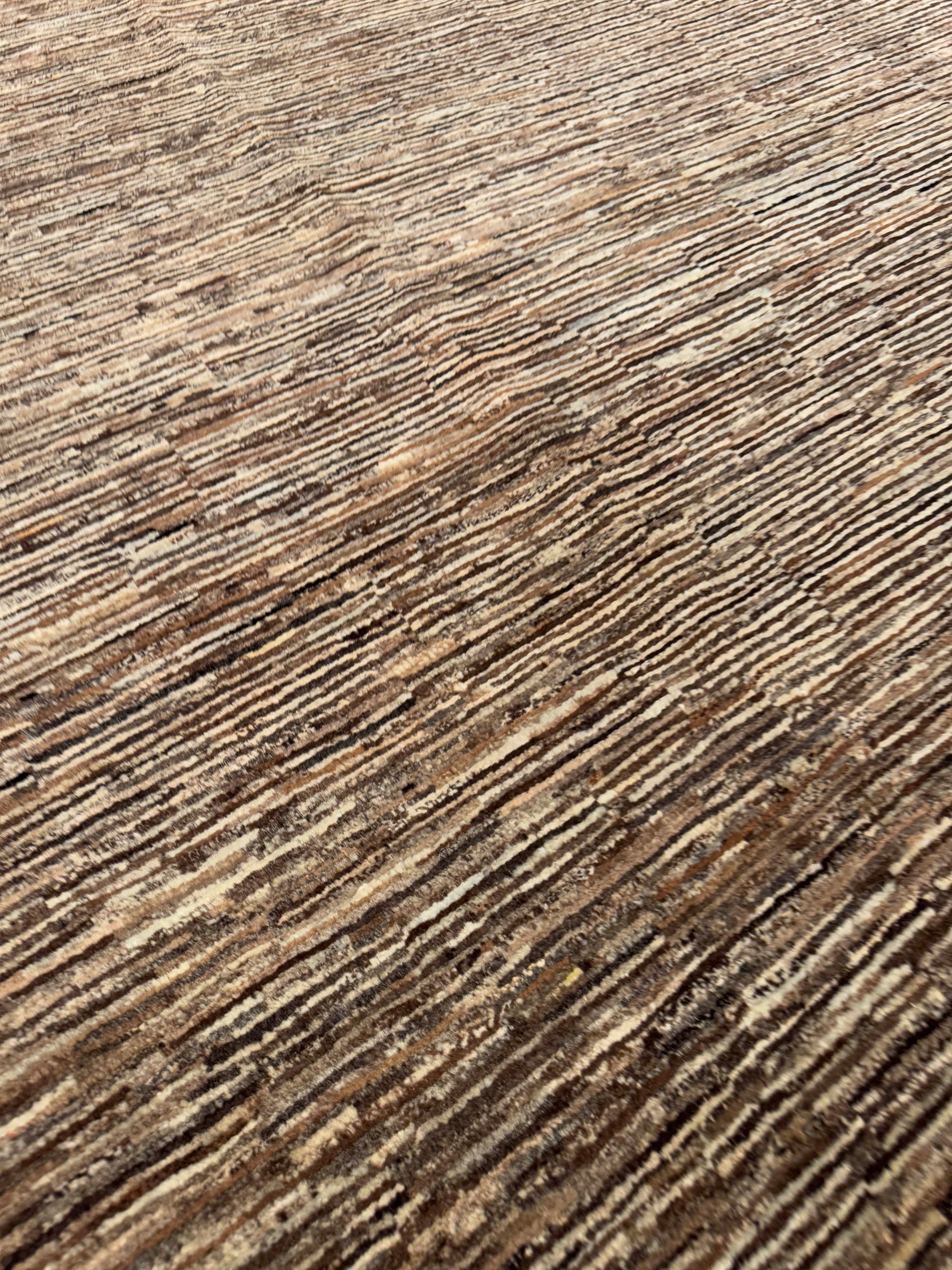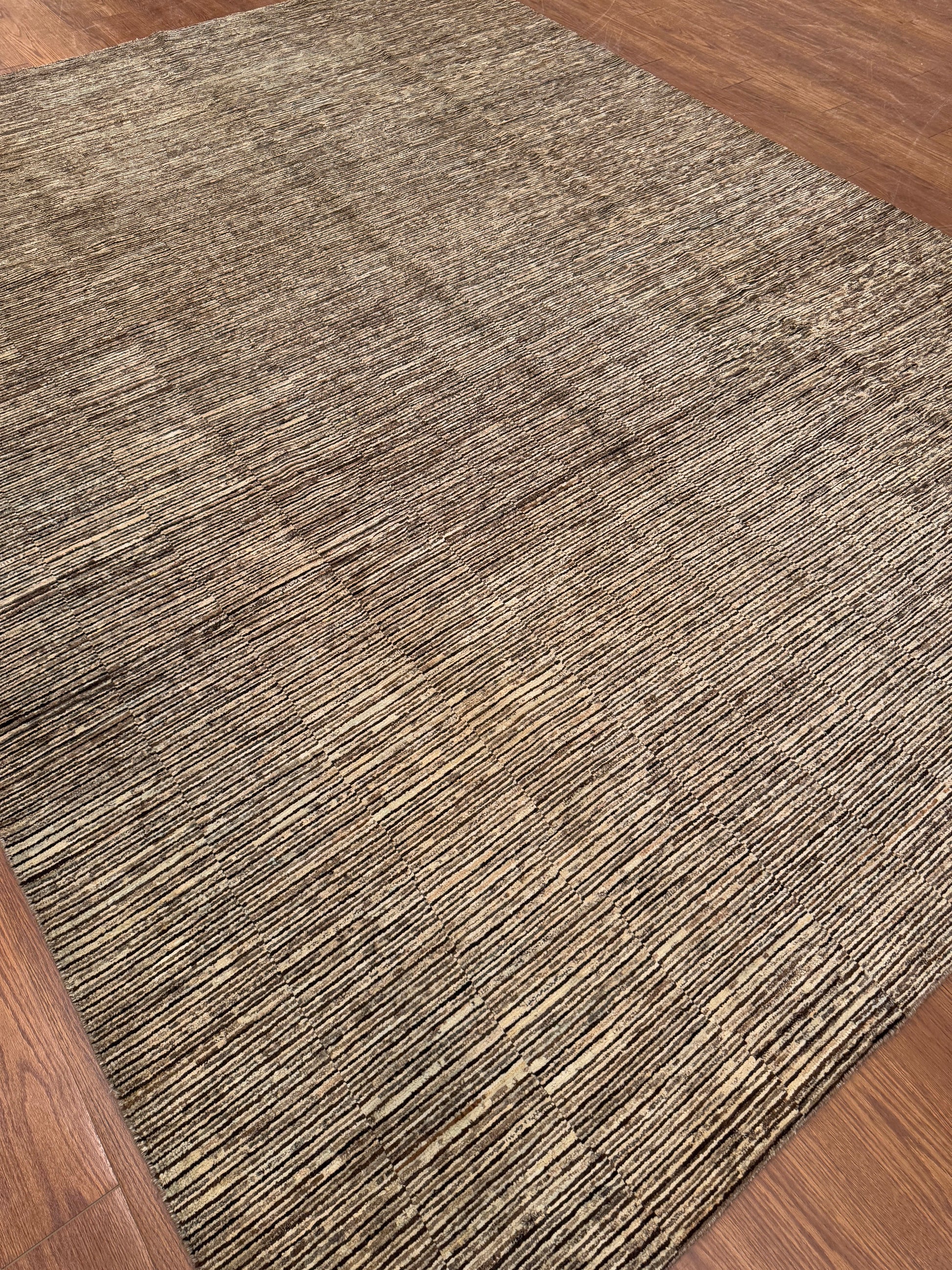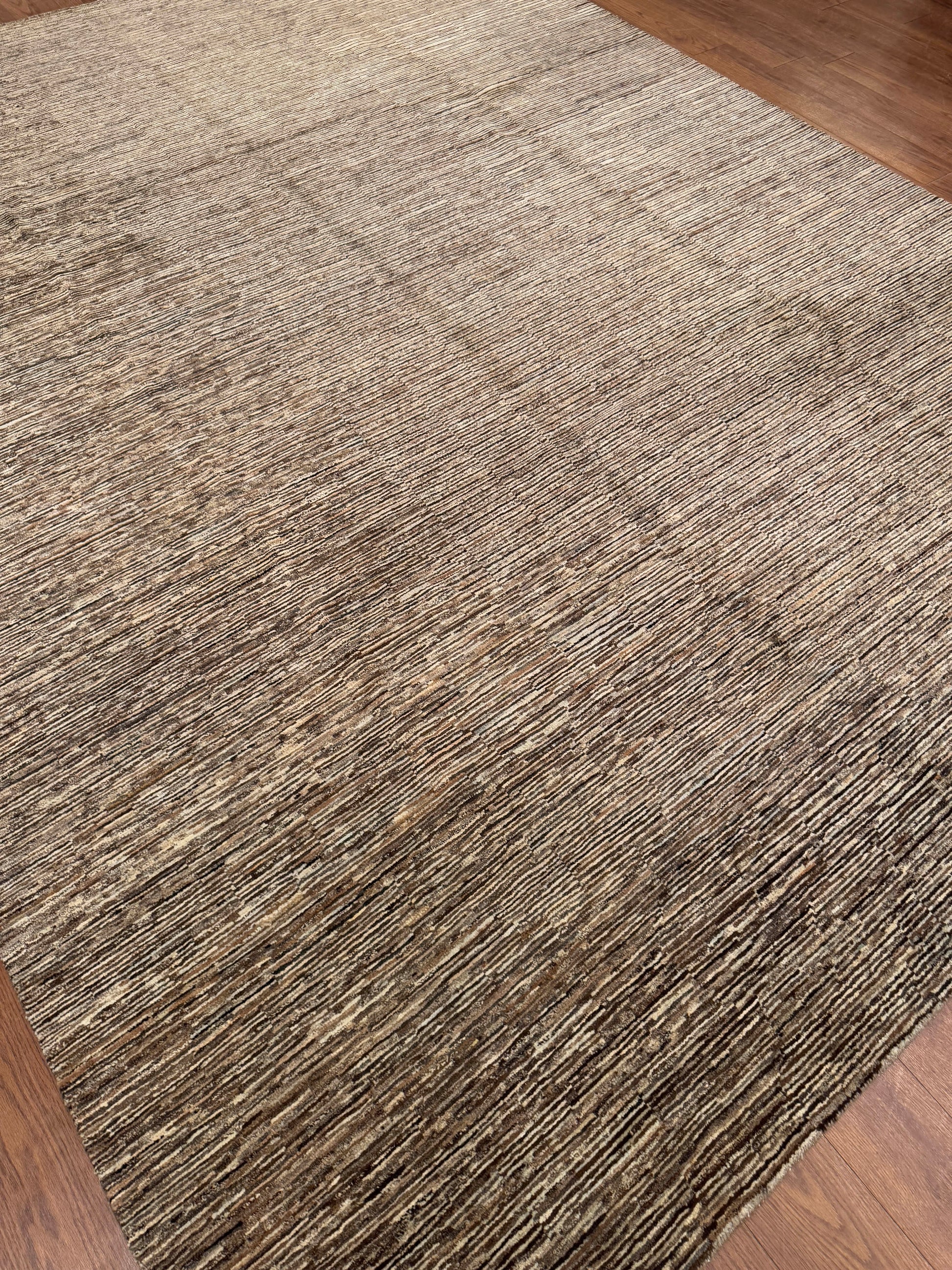 This handmade rug features a sophisticated tonal design that blends natural hues of taupe, beige, and sand into a beautifully textured surface. The subtle horizontal striations create movement and depth, giving it an organic, earthy elegance. Its understated design complements both modern and traditional interiors, offering warmth and refinement through simplicity.
