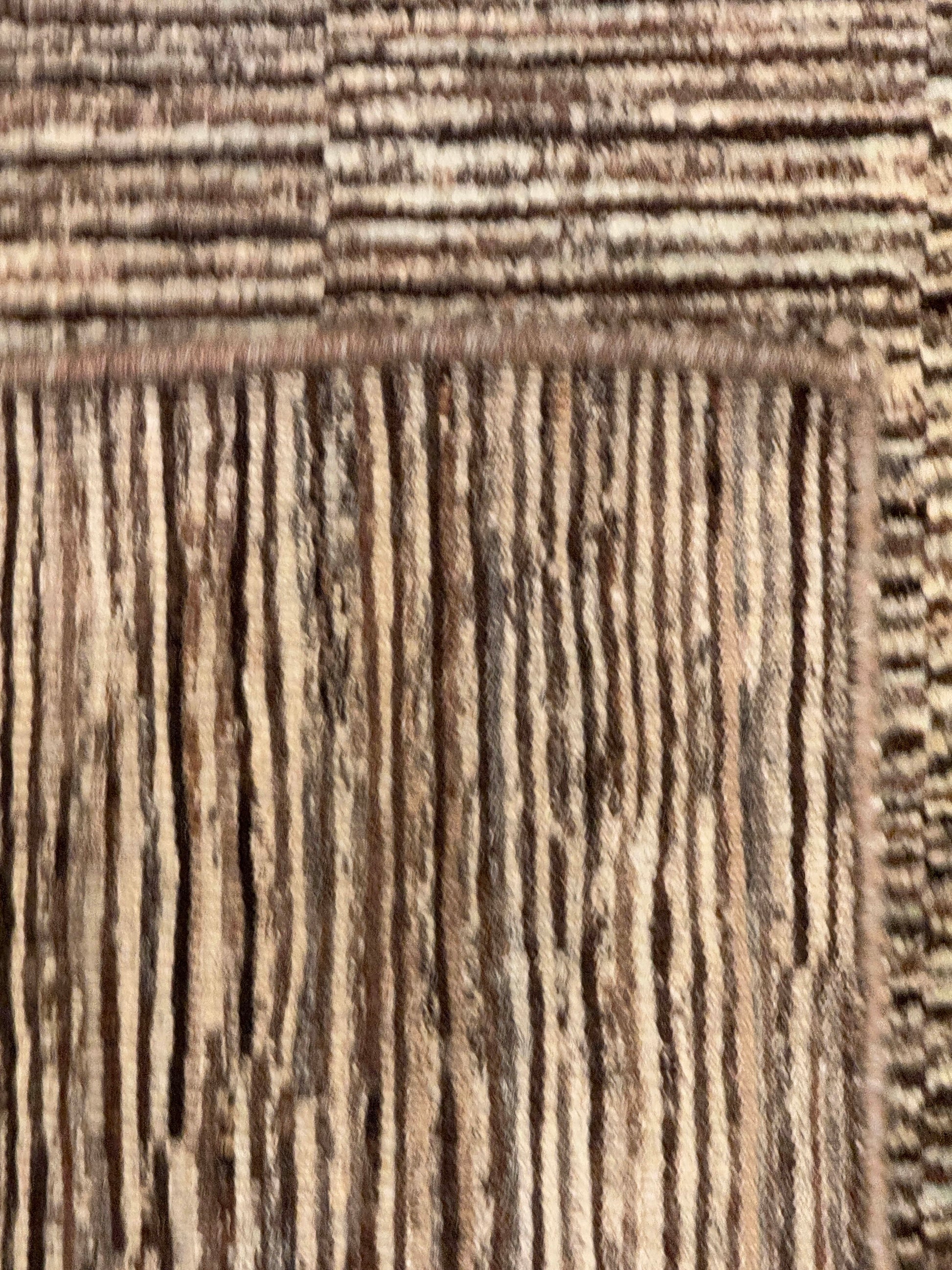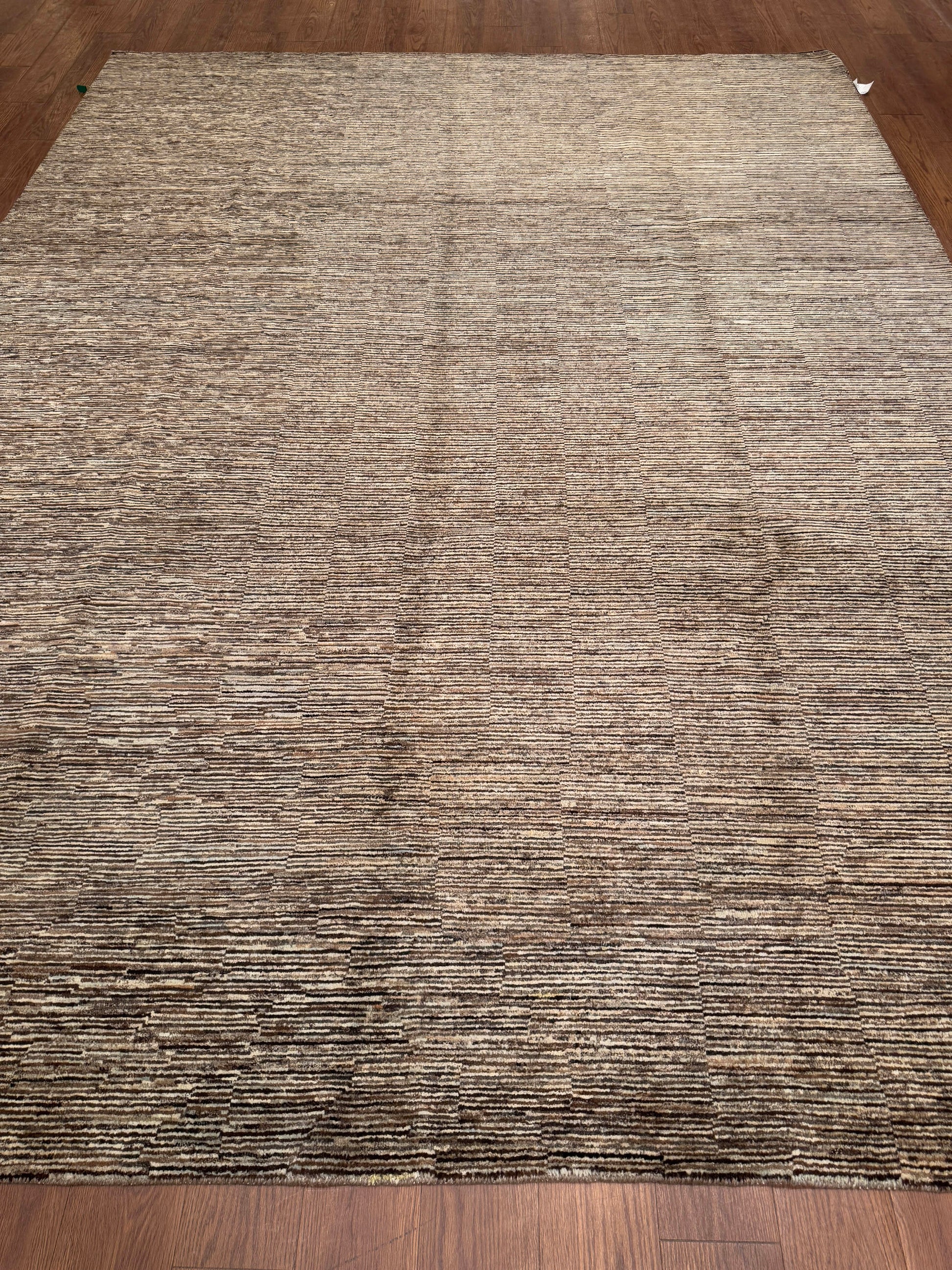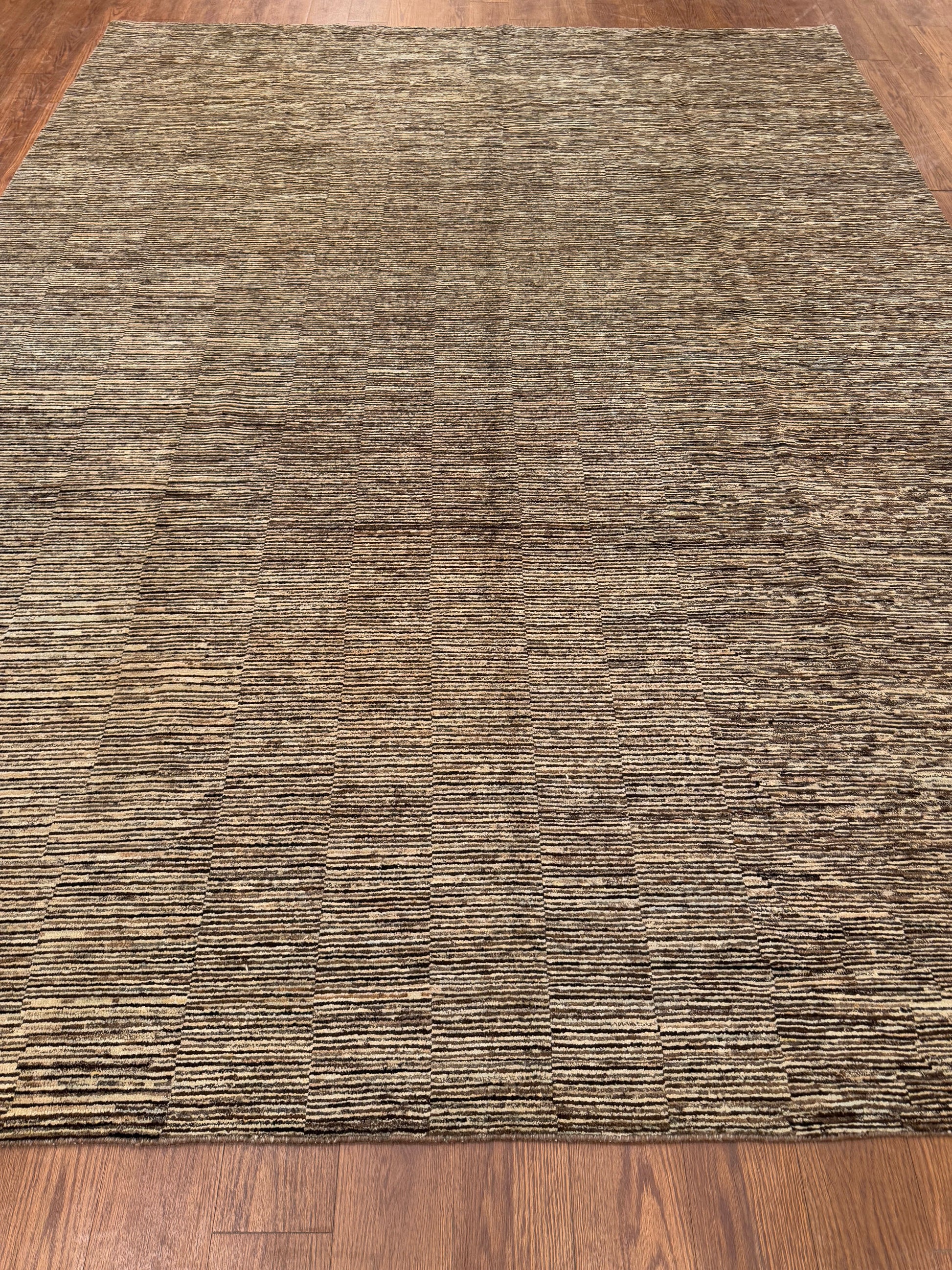 This handmade rug features a sophisticated tonal design that blends natural hues of taupe, beige, and sand into a beautifully textured surface. The subtle horizontal striations create movement and depth, giving it an organic, earthy elegance. Its understated design complements both modern and traditional interiors, offering warmth and refinement through simplicity.