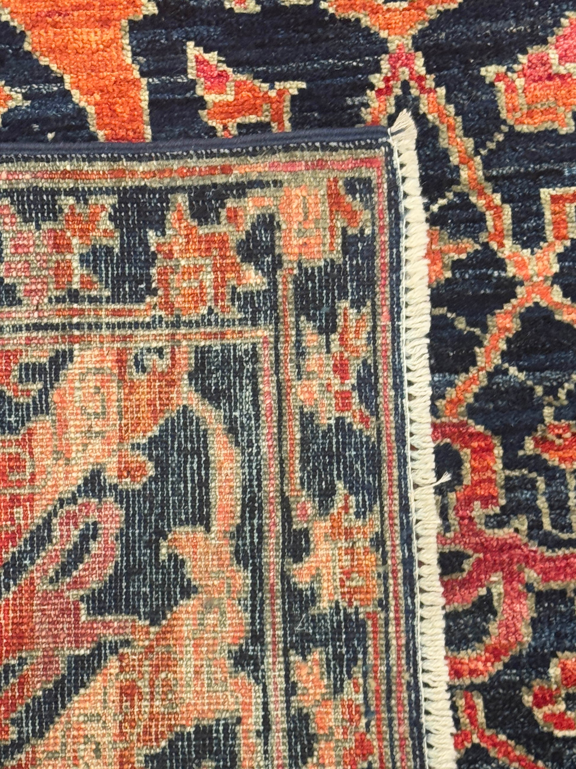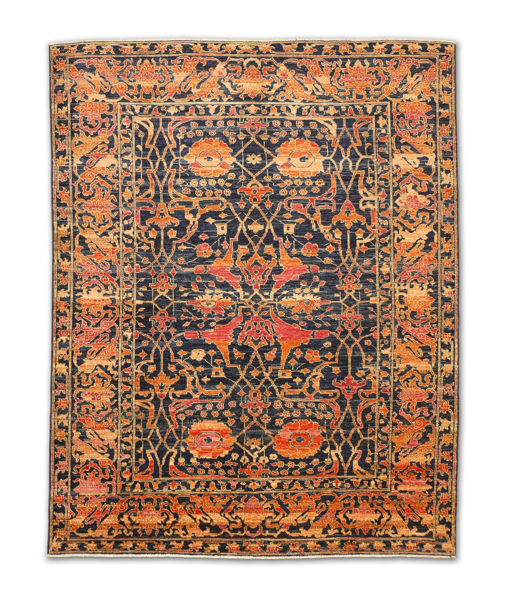 This handmade rug features a refined allover floral pattern woven across a deep navy background, highlighted by warm tones of coral, terracotta, and gold. The intricate vine work and balanced symmetry create a sense of sophistication, while the contrasting palette adds vibrancy and depth. A perfect blend of elegance and tradition, it’s ideal for anchoring refined interiors with timeless charm.