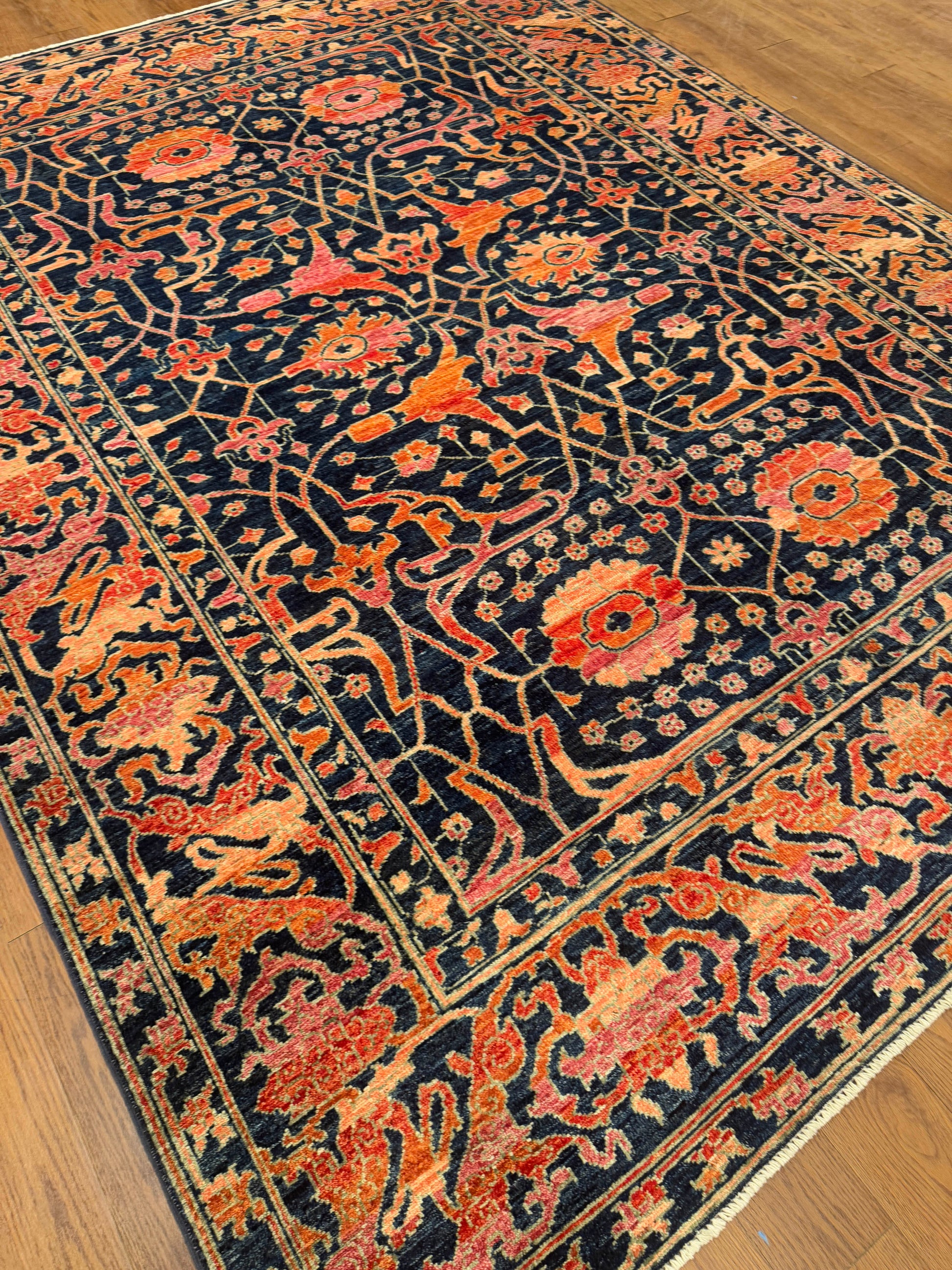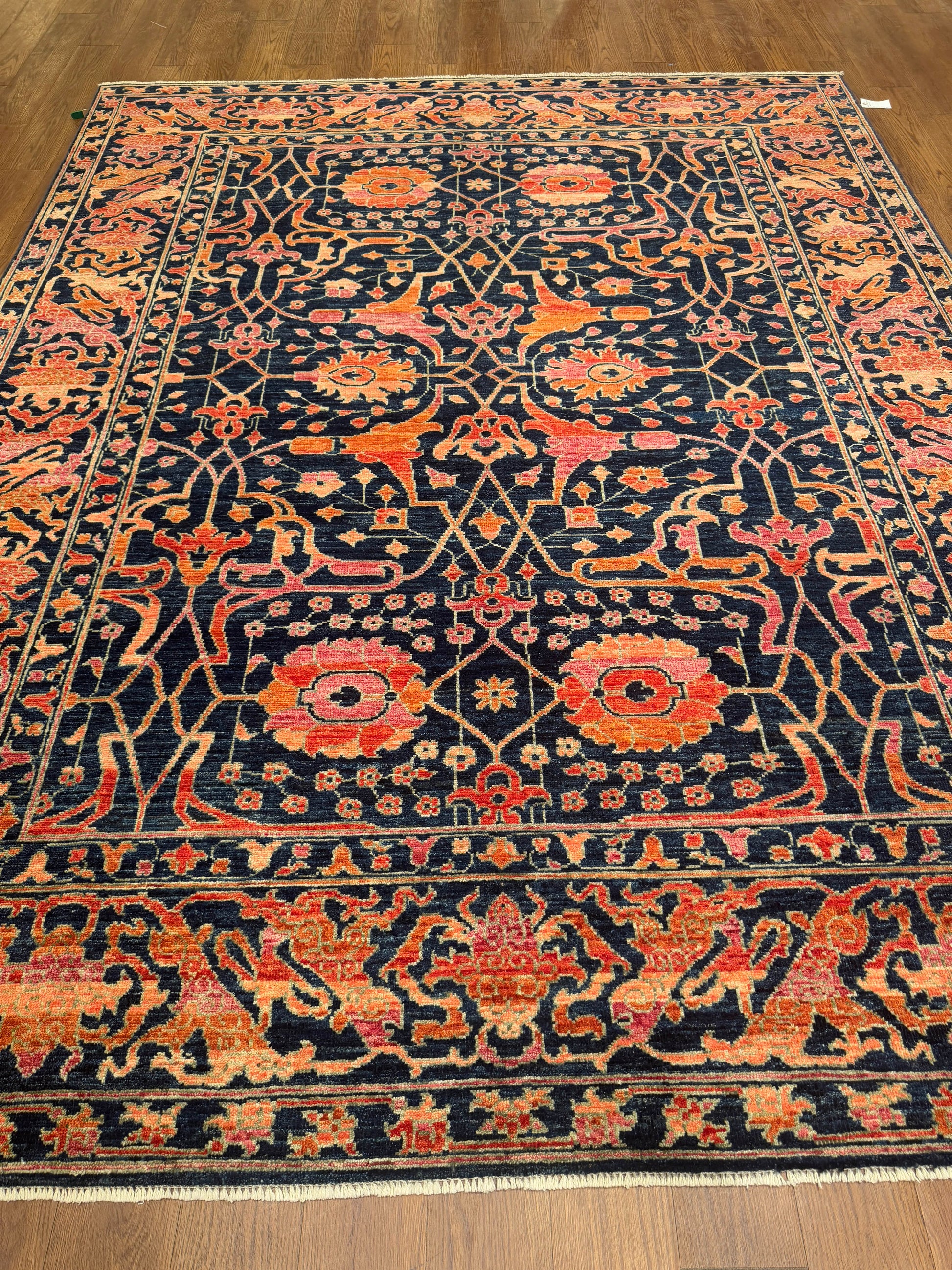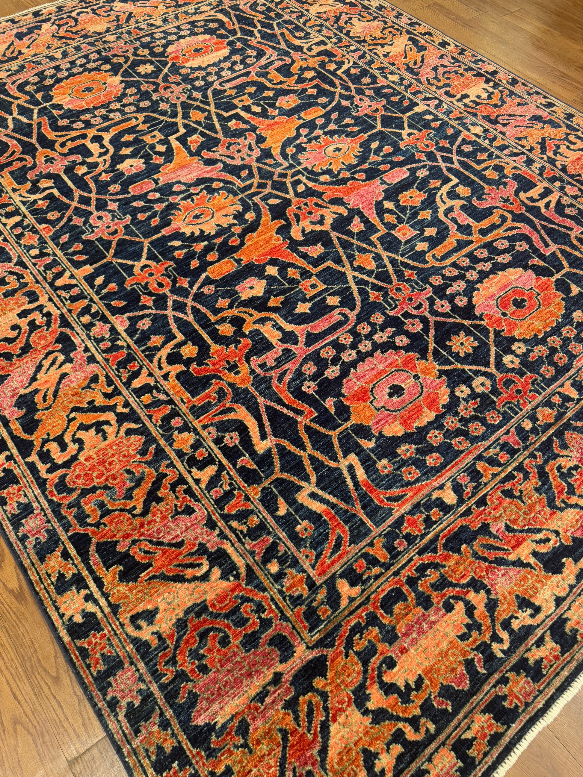 This handmade rug displays a regal allover botanical pattern set against a deep navy backdrop, illuminated by rich tones of coral, terracotta, and gold. Its symmetrical vine work and stylized floral motifs create a sense of grandeur and balance, while the aged finish adds depth and character. A statement piece that bridges tradition and sophistication, it brings warmth and elegance to any refined interior.
