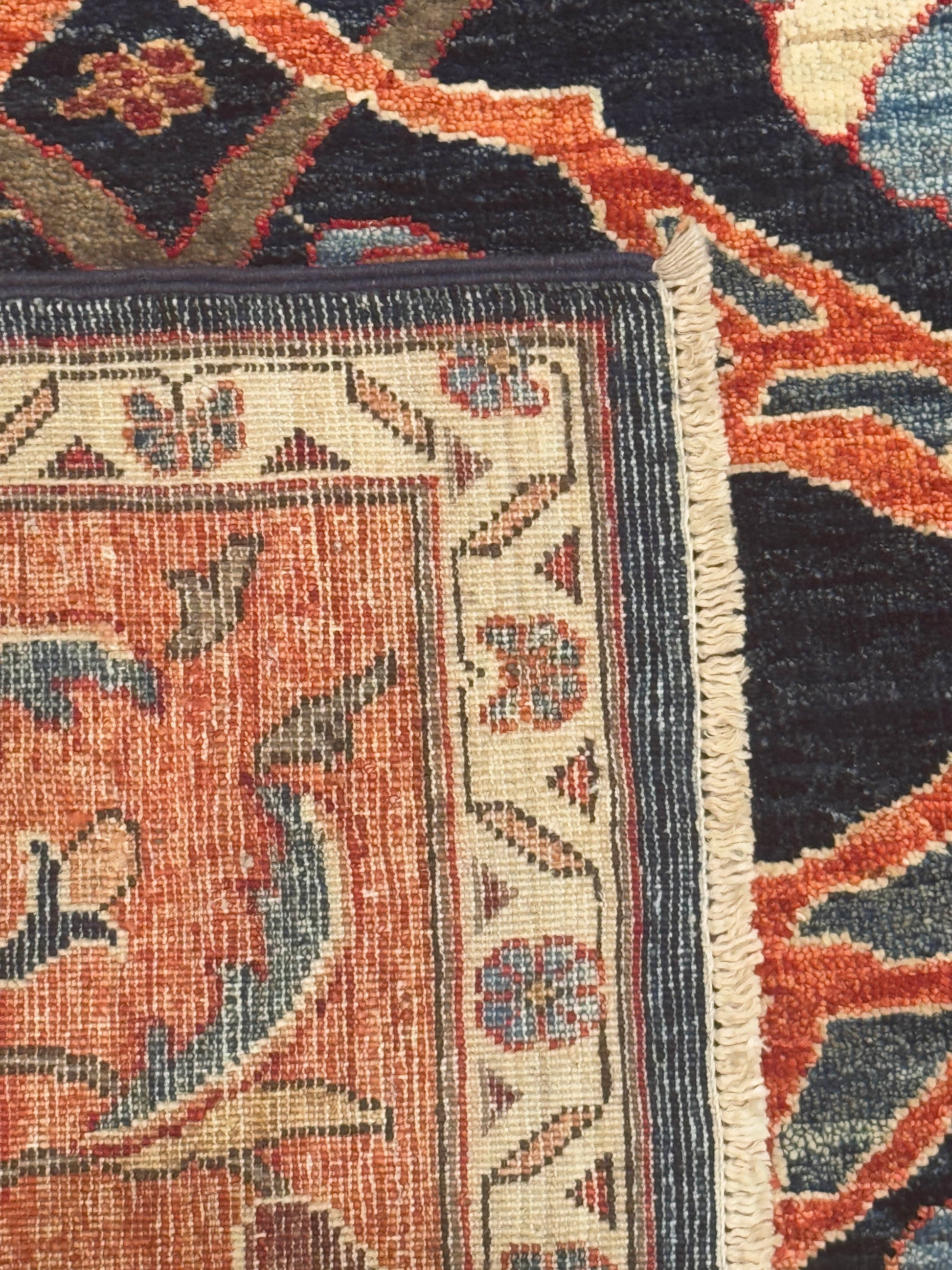 Rich and dramatic, this handwoven rug commands attention with its deep navy field and intricate lattice of floral motifs. Accents of terracotta, ivory, and soft blue interlace gracefully across the surface, while the bold orange border adds warmth and vibrancy. The meticulous craftsmanship and balanced color palette make this piece a sophisticated focal point in any setting.