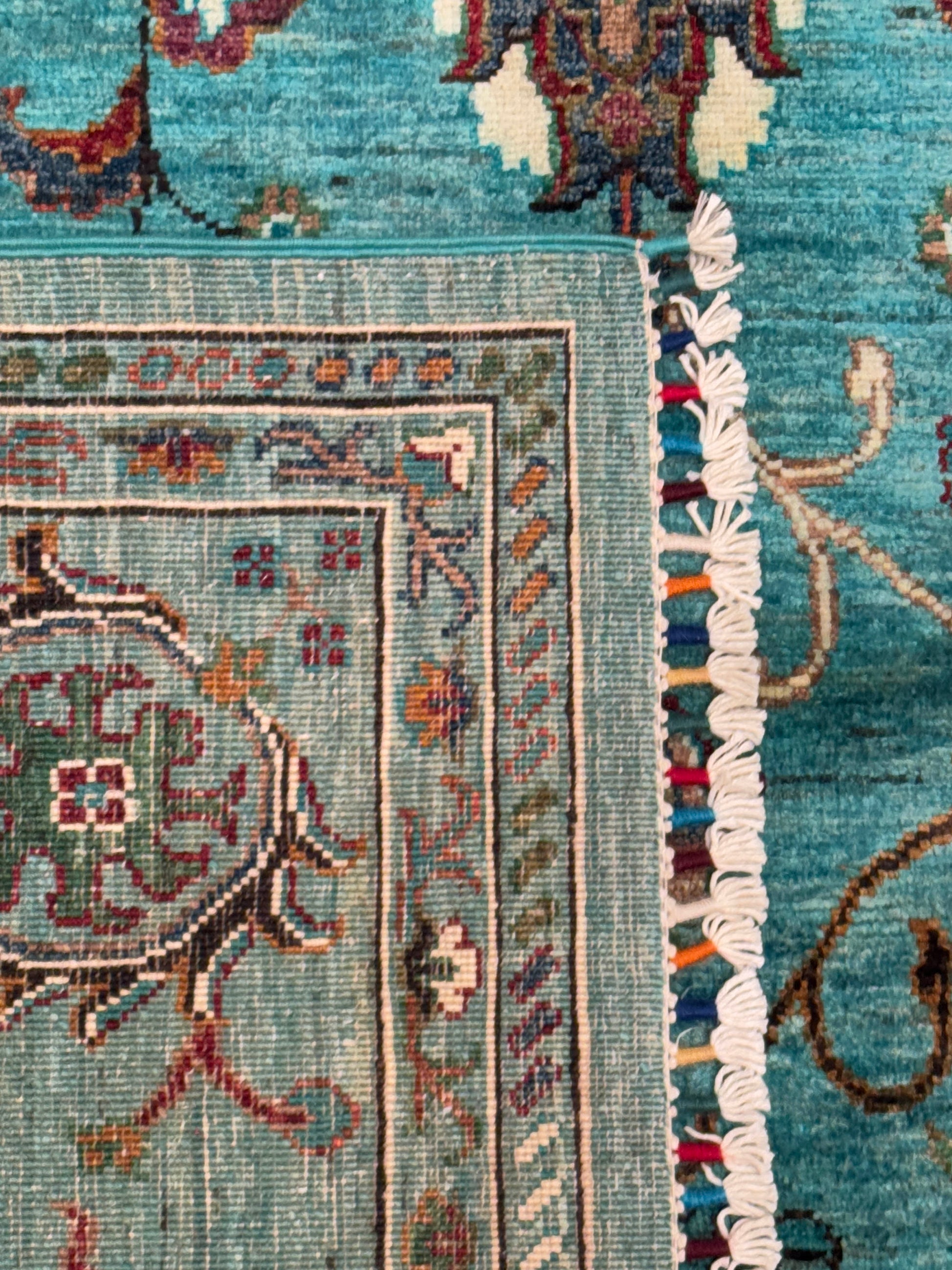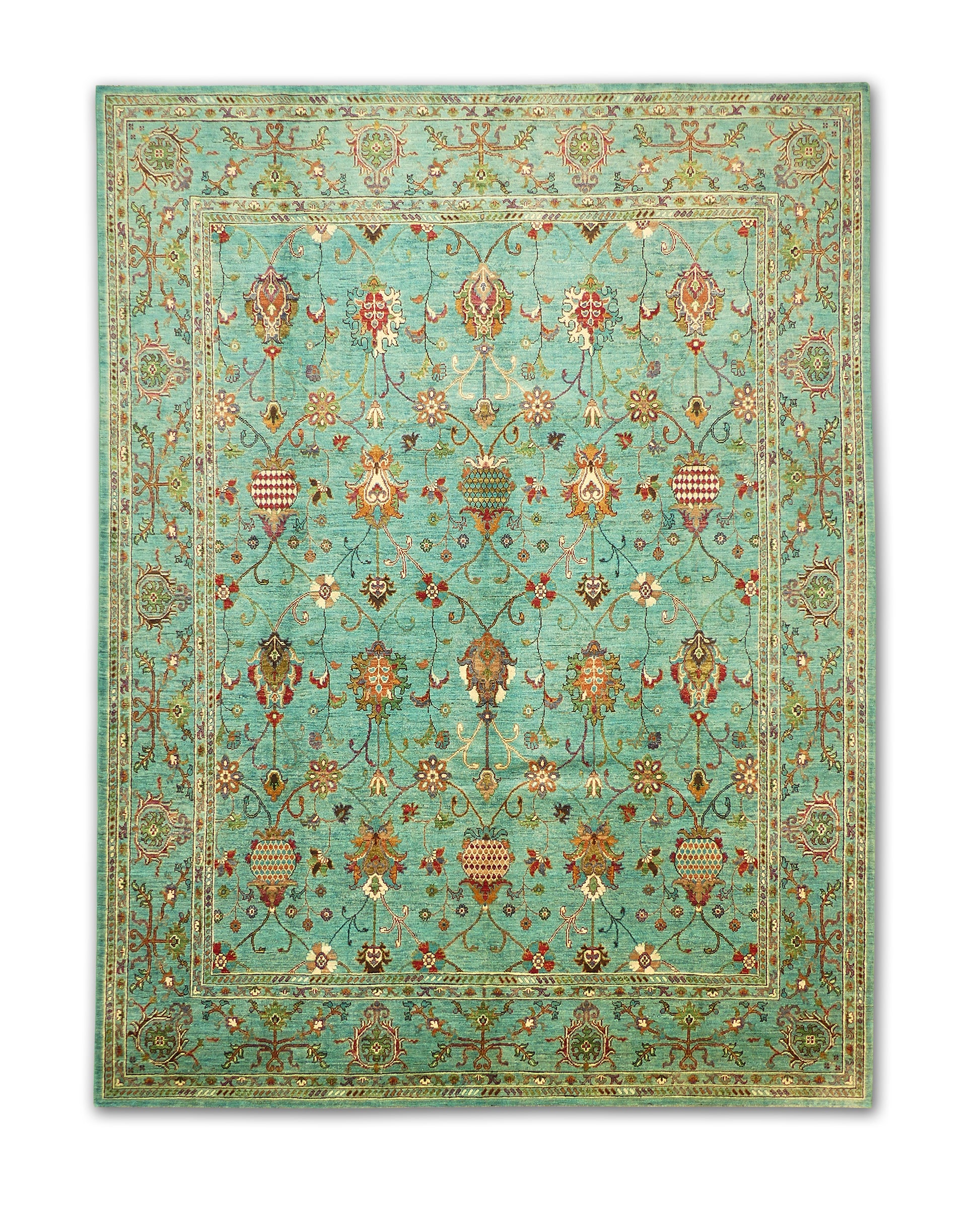 This handmade rug showcases an elegant floral lattice design across a luminous turquoise background, creating a lively yet balanced aesthetic. The intricate vinework and blooming motifs in soft coral, gold, and ivory tones add a touch of vibrancy and sophistication. With its detailed border and masterful craftsmanship, this piece brings a refreshing pop of color while maintaining timeless appeal.