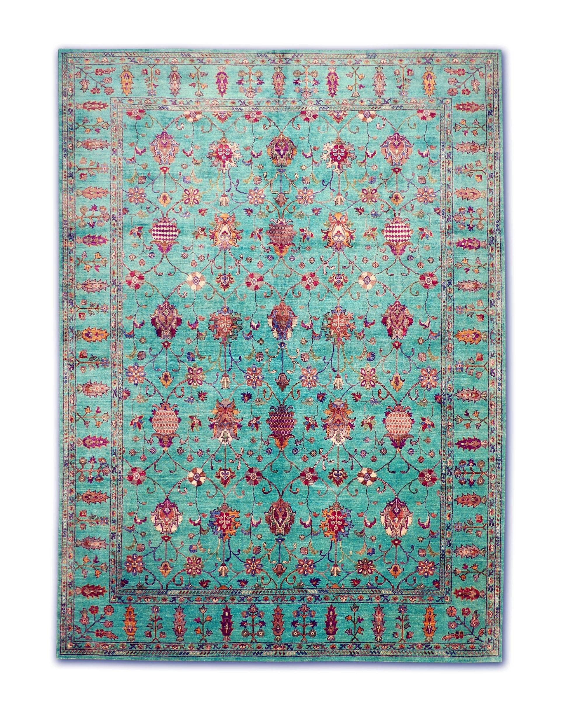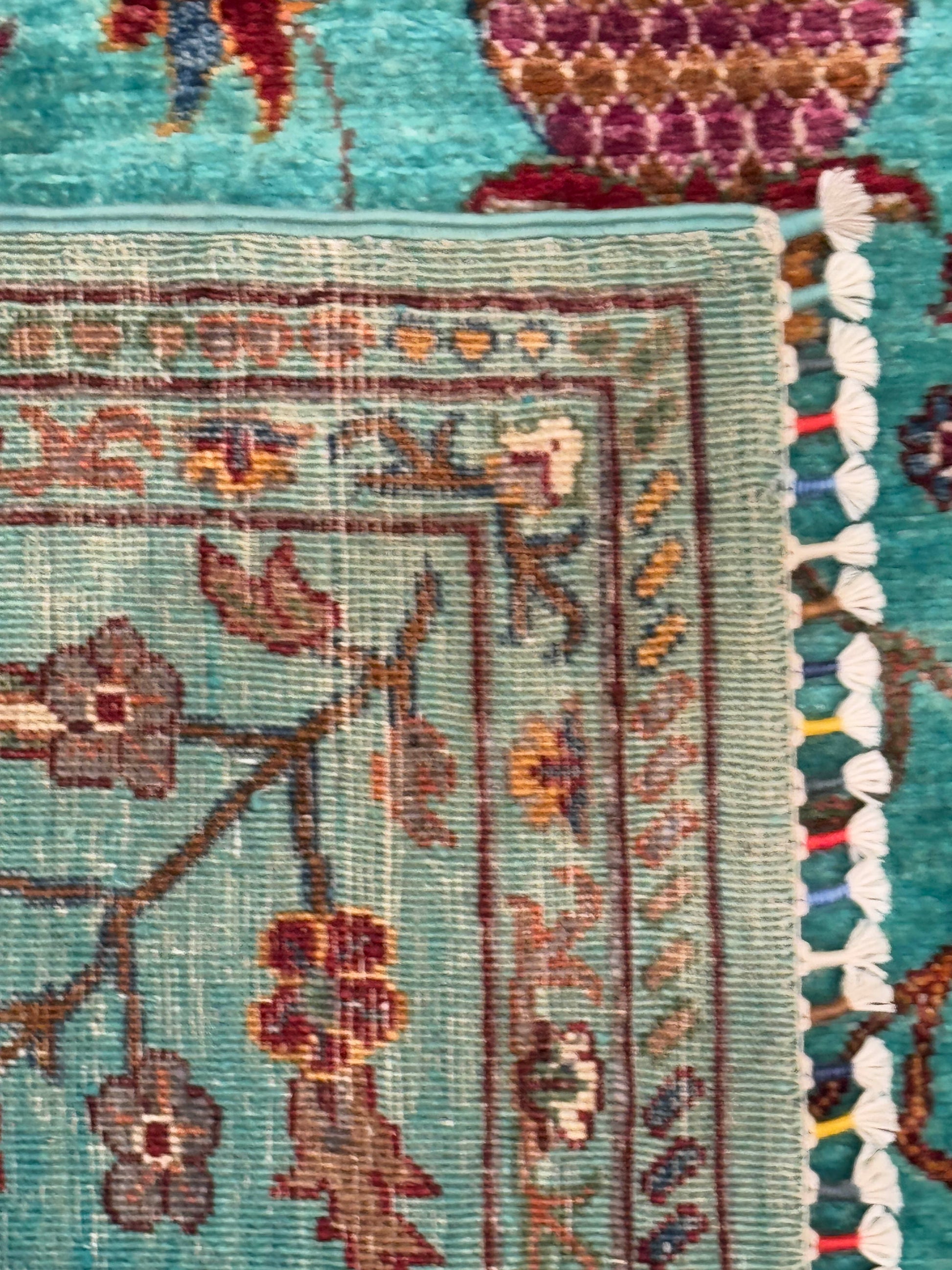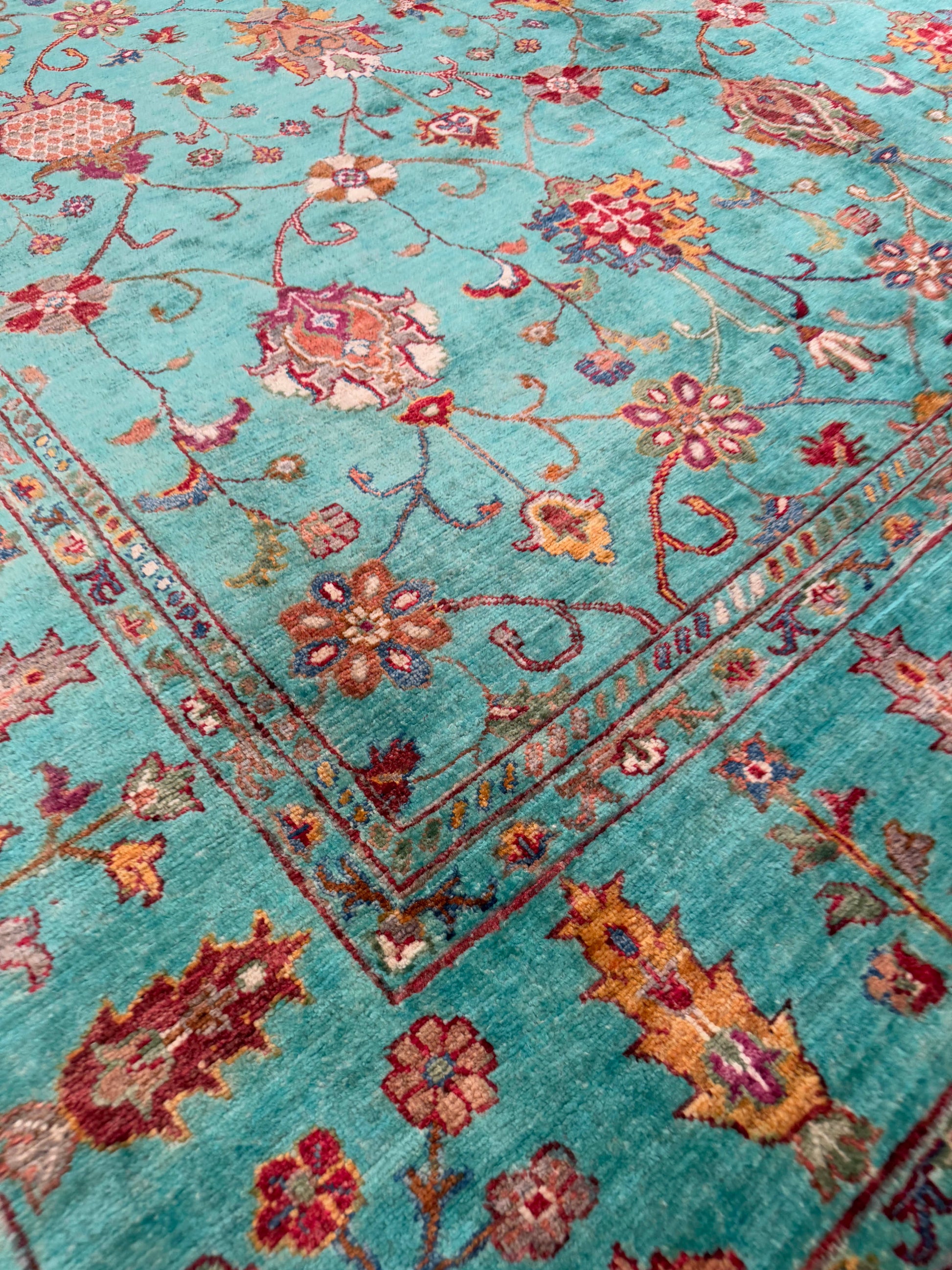 This handmade rug radiates elegance with its intricate all-over floral design set against a stunning turquoise background. The motifs feature rich tones of burgundy, gold, ivory, and soft rose, creating a lively yet refined aesthetic. Delicate vine and blossom patterns flow symmetrically throughout, while the matching border adds graceful balance. Perfect for brightening both modern and traditional interiors, this rug brings warmth and artistic sophistication to any setting.