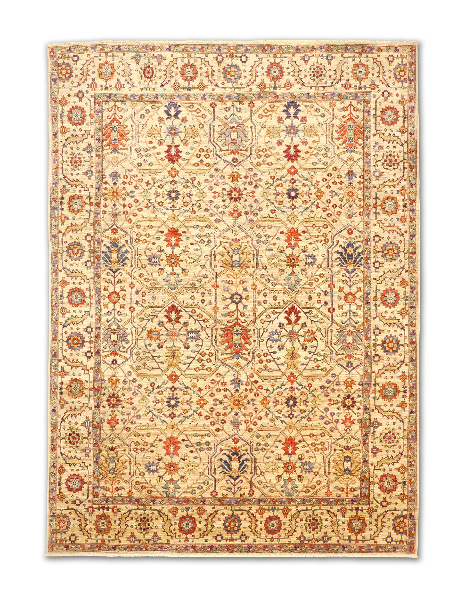 This handmade rug features an elegant repeating floral and vine motif arranged in a refined lattice structure. The ivory background is brought to life with accents of rust red, soft blue, sage, and gold, creating a harmonious and timeless look. Meticulously woven from fine wool, this piece exudes both warmth and sophistication—perfect for enhancing traditional or transitional interiors.