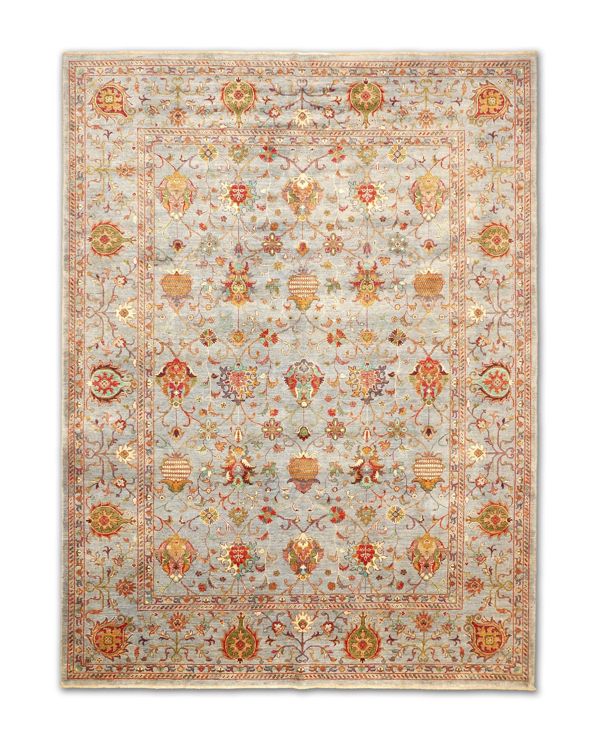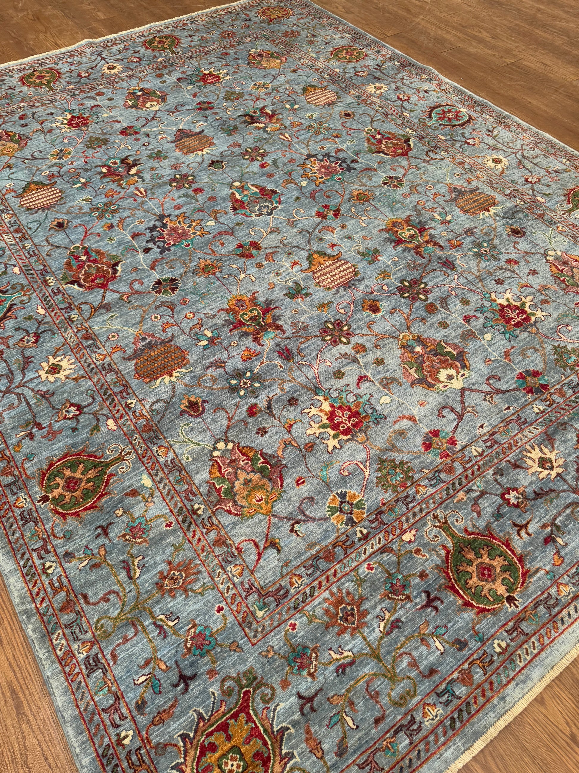 This handmade rug showcases an elegant all-over floral design woven across a serene sky-blue field. Graceful vine patterns connect ornate palmettes and blooming motifs in shades of ivory, gold, red, and olive green, creating a refined sense of movement and harmony. Its soft palette and balanced composition make it a timeless piece ideal for brightening classic or transitional interiors.