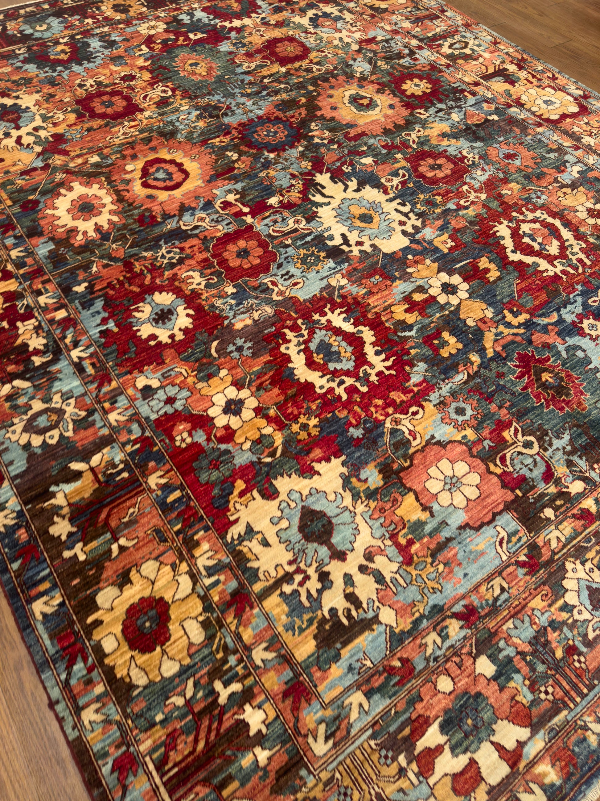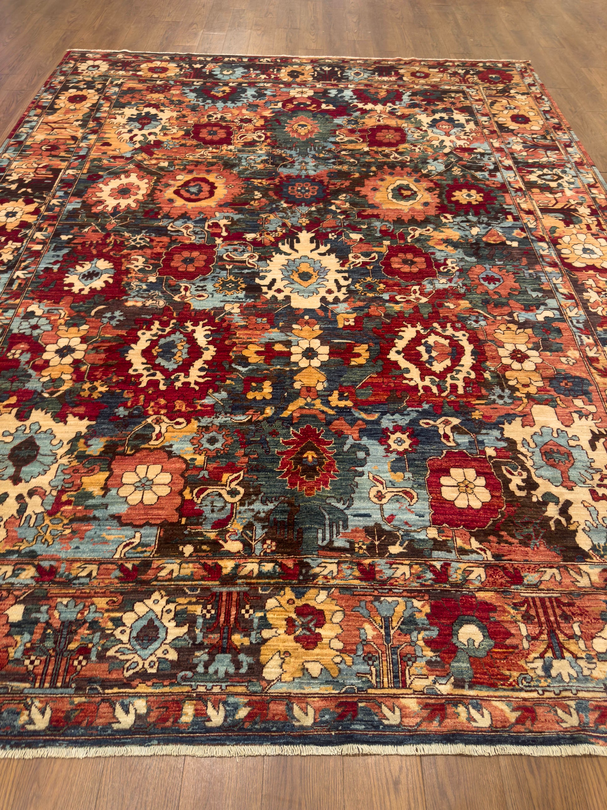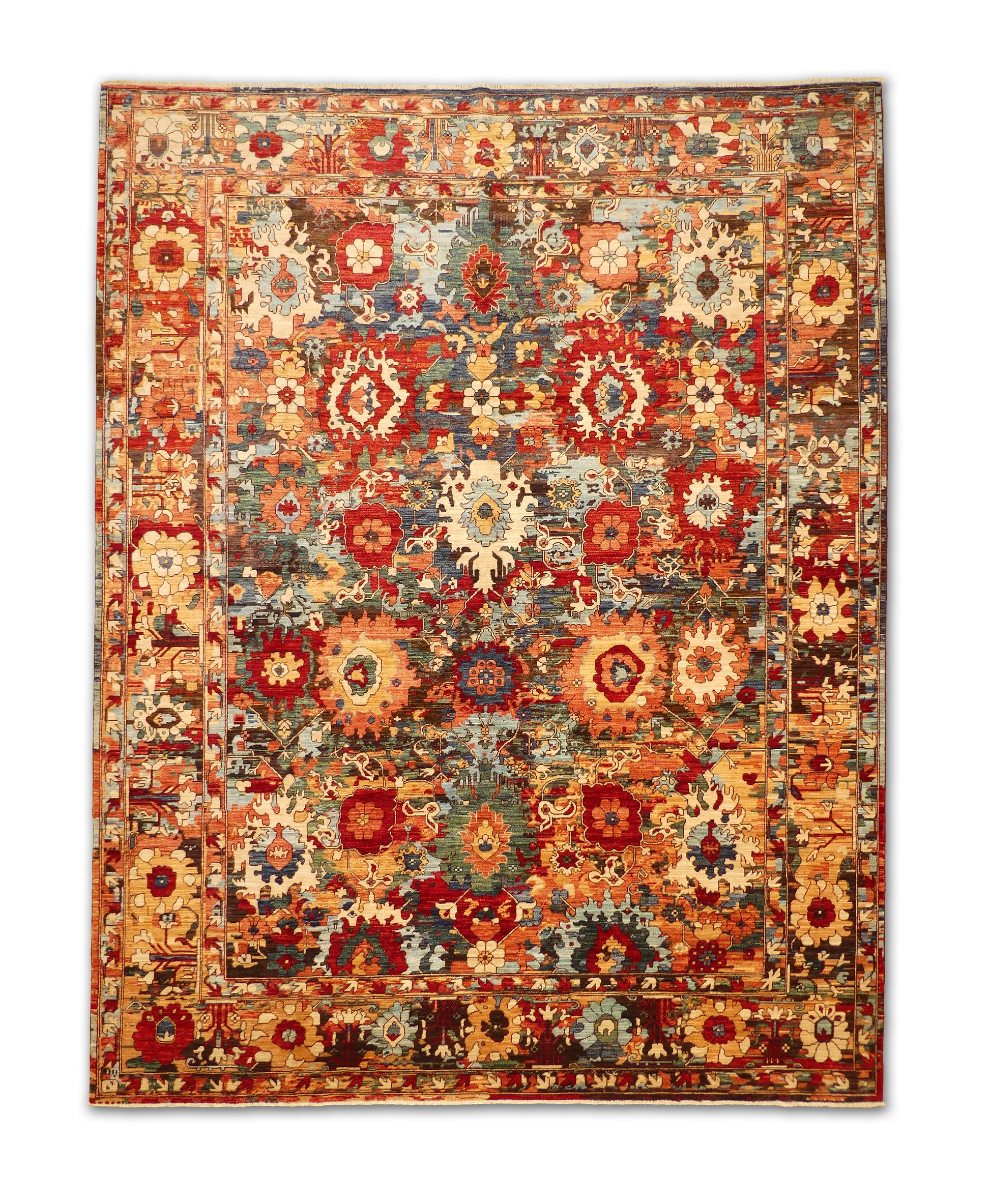 This handmade rug bursts with color and movement through its vivid allover floral design. The field features a dynamic interplay of red, teal, gold, ivory, and coral tones, creating a lively and artistic statement. Bold blossoms and vine motifs give it a painterly charm, while the soft wool texture adds depth and warmth. Perfect for transforming a neutral space into a vibrant focal point filled with personality and artisanal beauty.