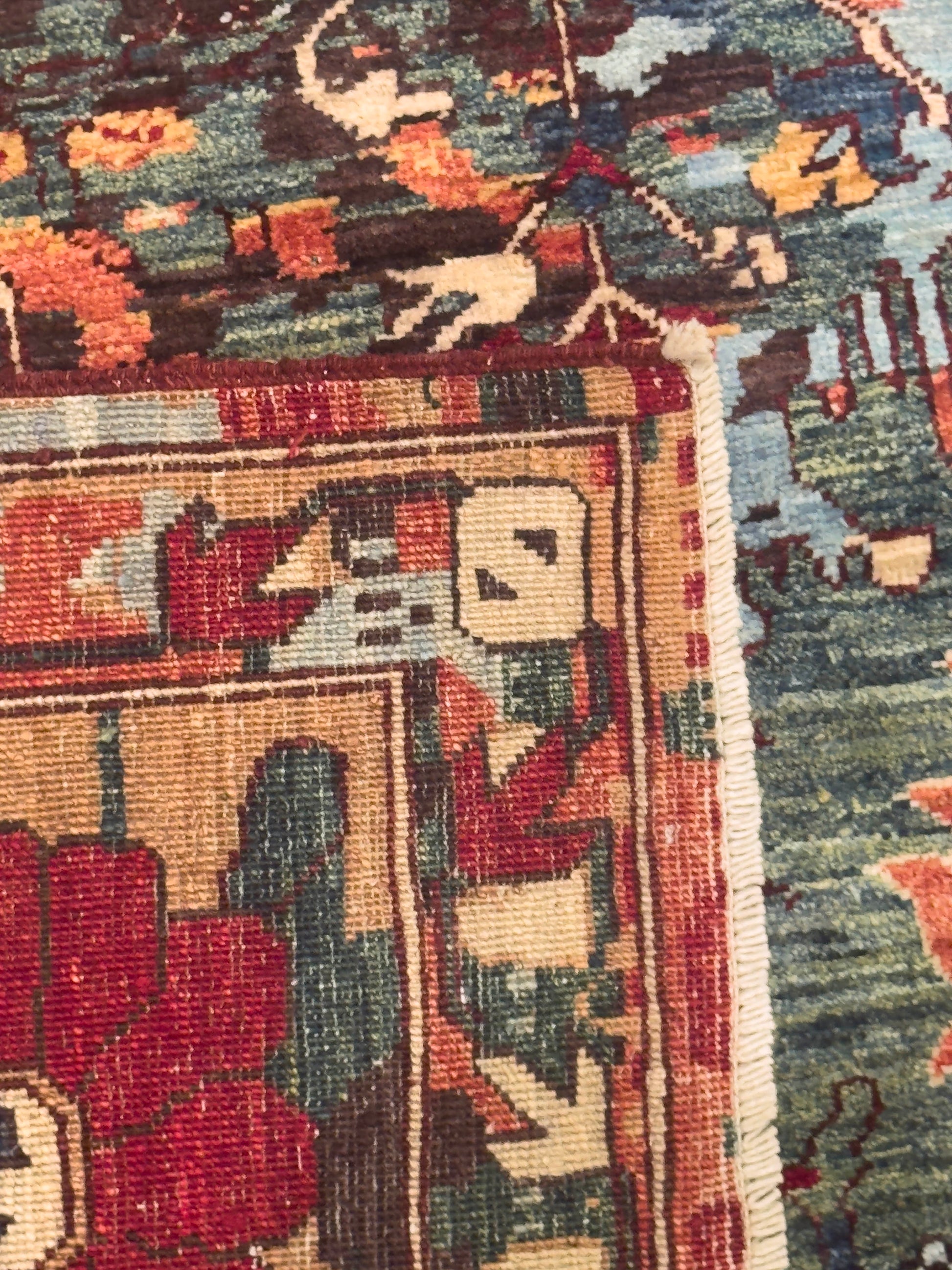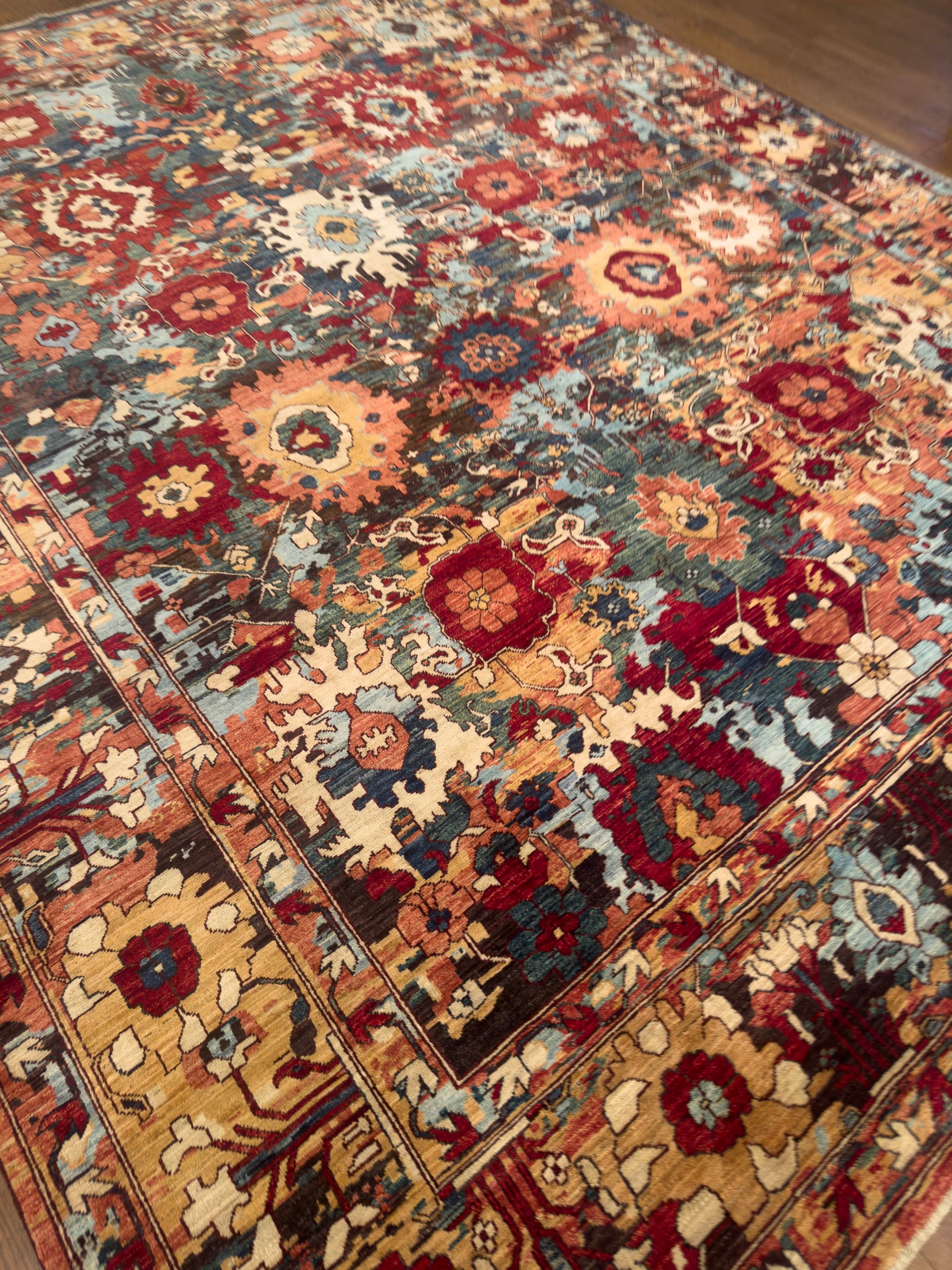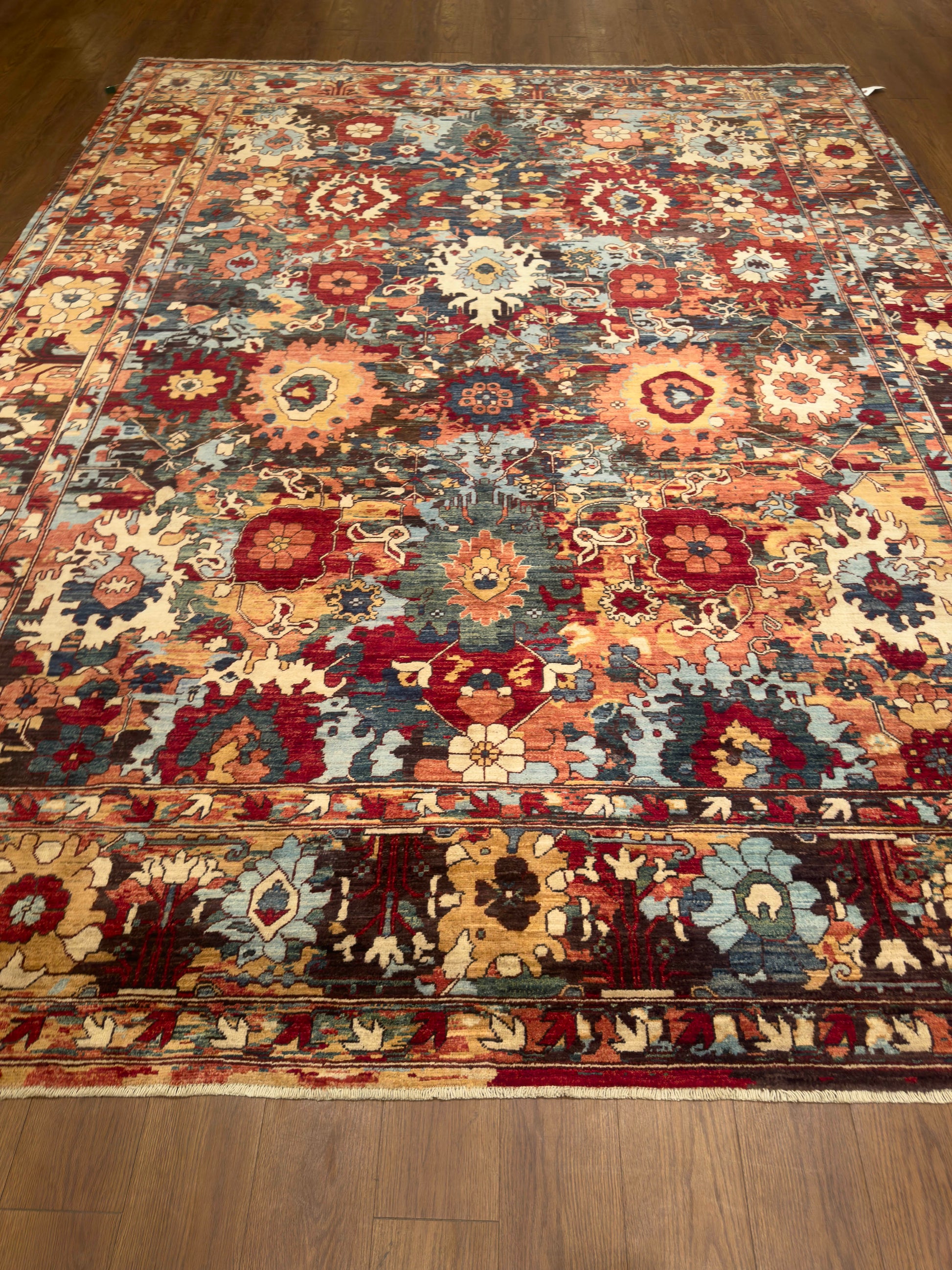 This handmade rug bursts with color and movement through its vivid allover floral design. The field features a dynamic interplay of red, teal, gold, ivory, and coral tones, creating a lively and artistic statement. Bold blossoms and vine motifs give it a painterly charm, while the soft wool texture adds depth and warmth. Perfect for transforming a neutral space into a vibrant focal point filled with personality and artisanal beauty.