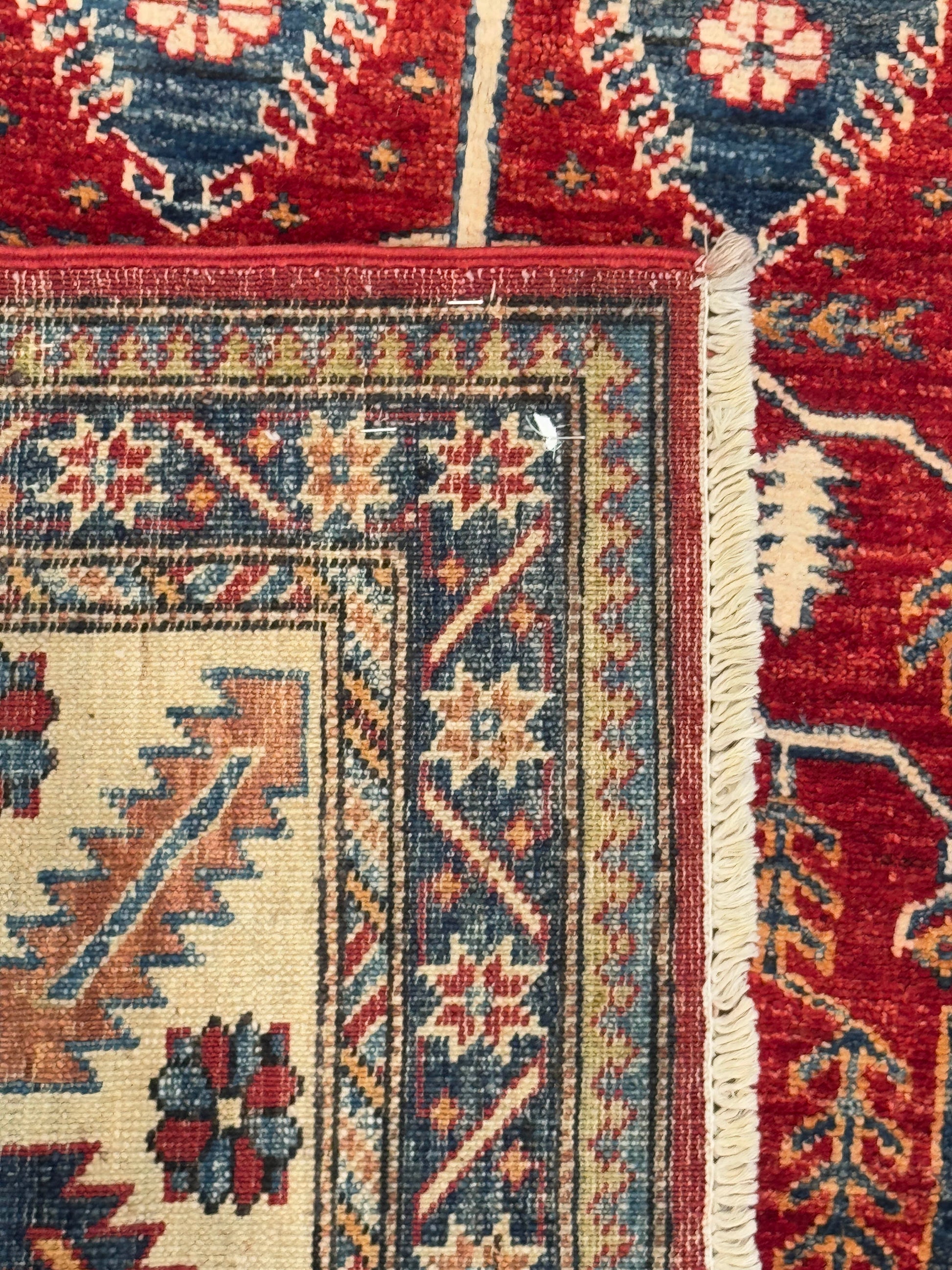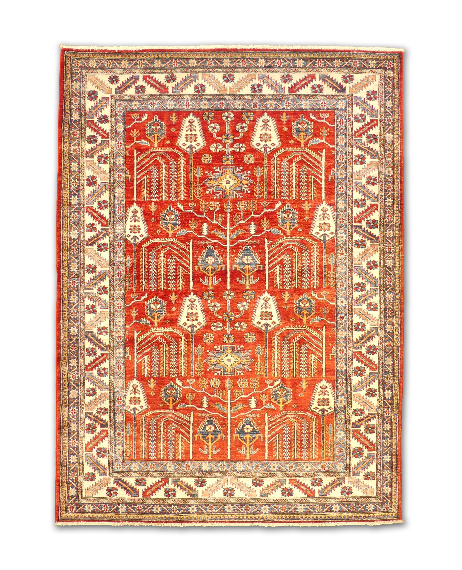 - Design: Geometric floral and arrow motifs with a detailed ivory border