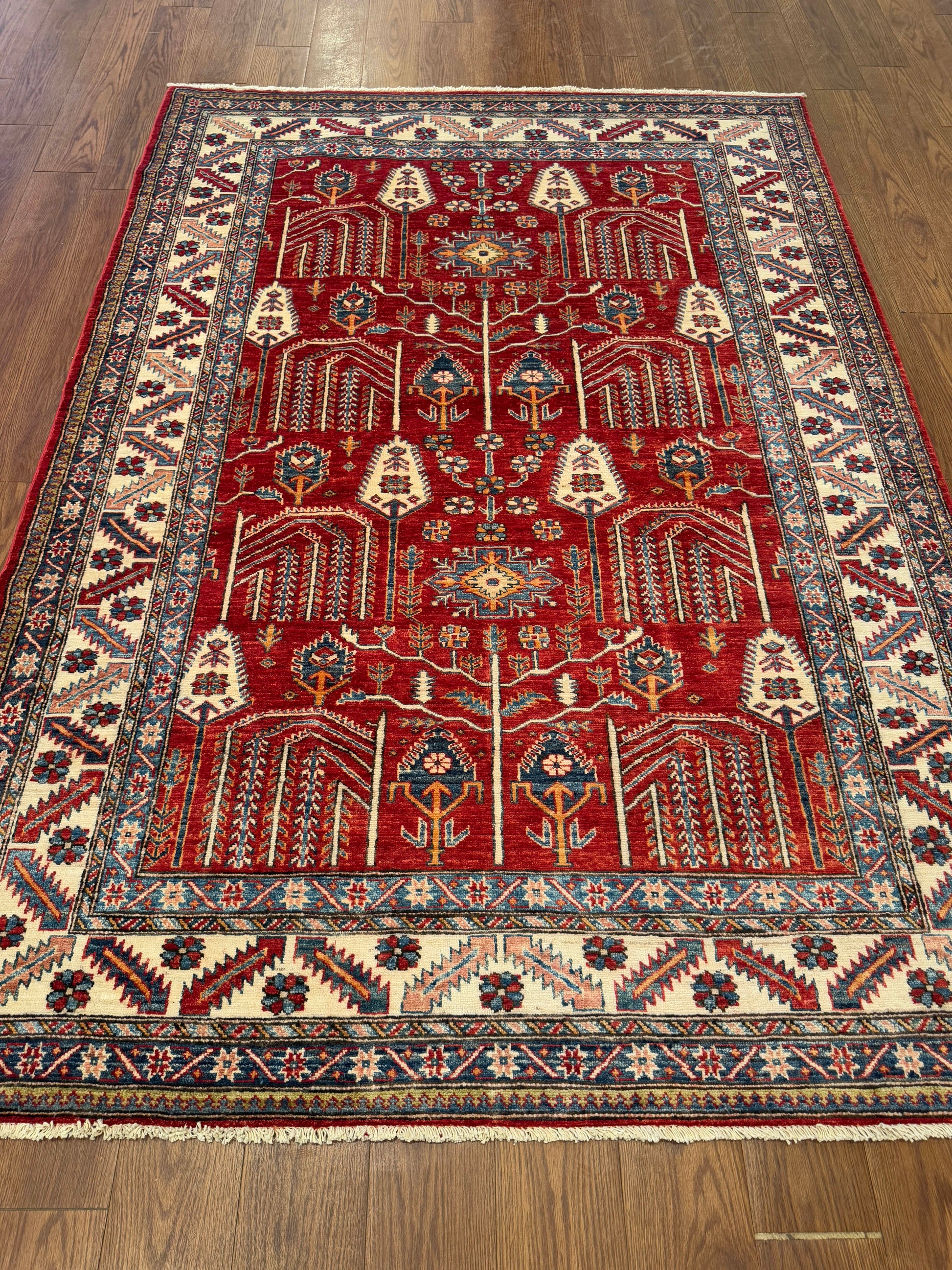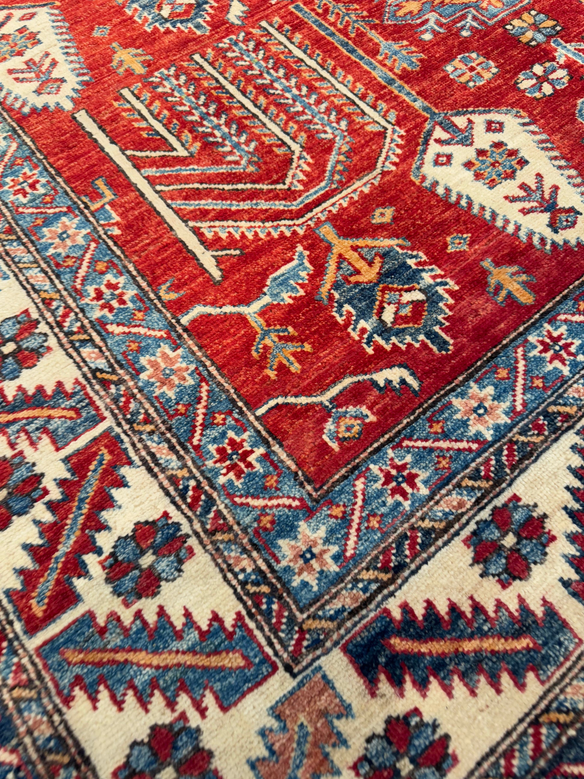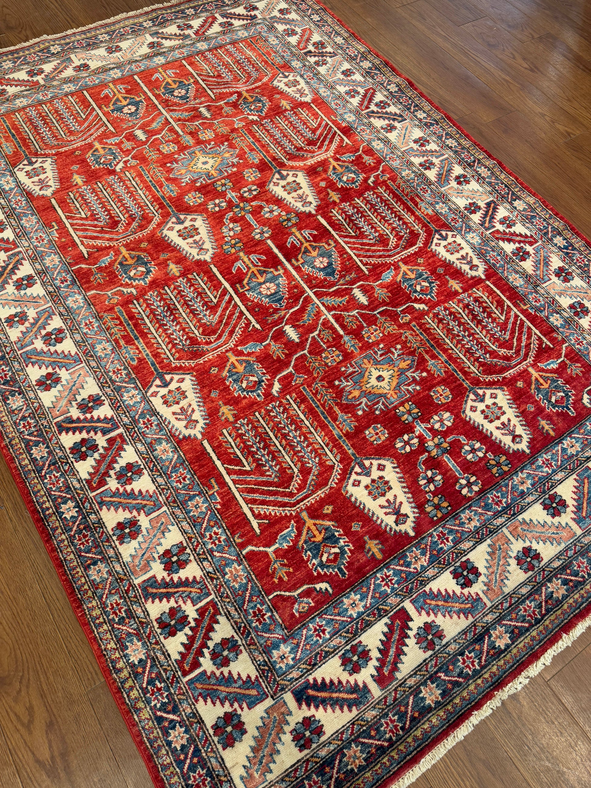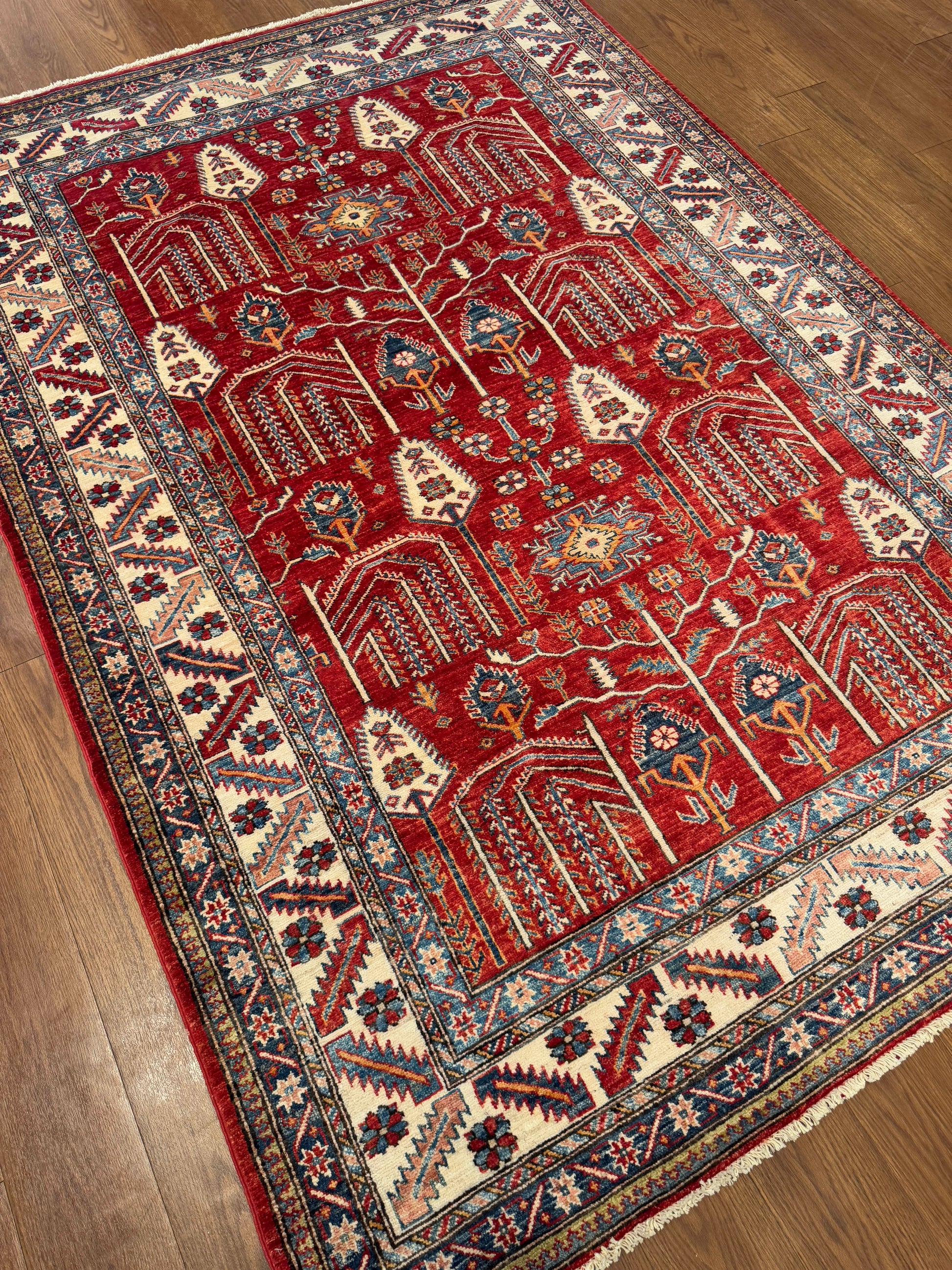 This rug showcases a vivid red field filled with highly stylized botanical motifs arranged in vertical symmetry. Arrow-like forms and angular floral stems create a rhythmic, directional flow, while the ivory border balances the intensity with repeating geometric and floral patterns in shades of blue and red. The contrast of bold color and structured design gives this piece a strong tribal character.