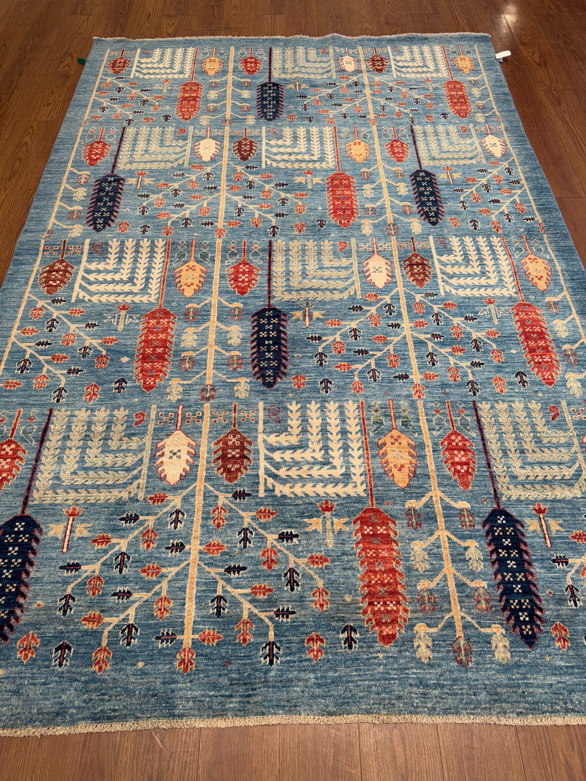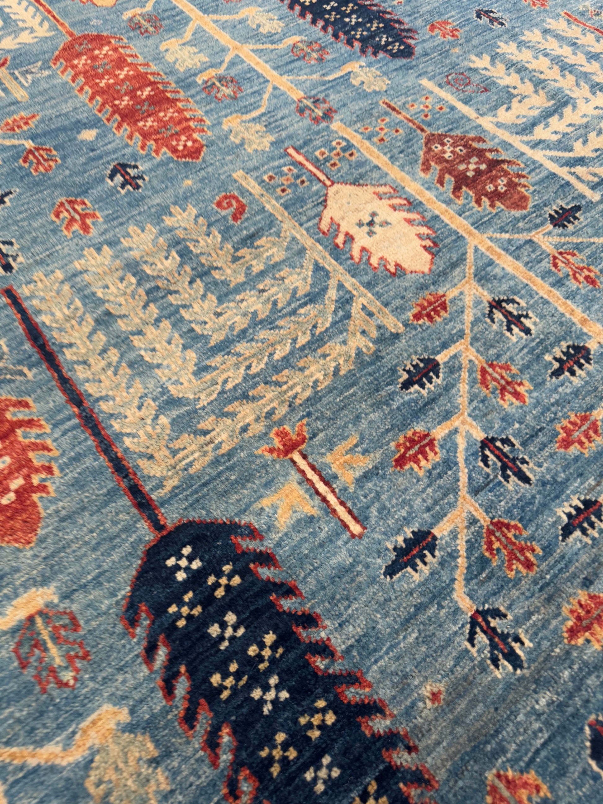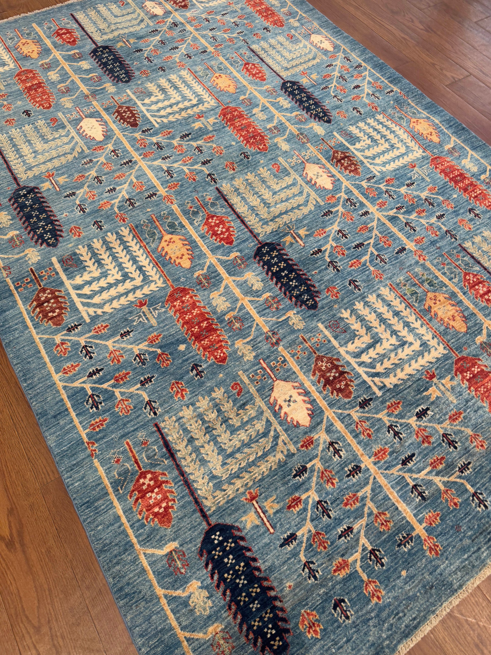 This striking handwoven wool rug features a vivid sky-blue background decorated with stylized botanical motifs in shades of red, ivory, navy, and gold. The repeating pattern of leaves and branches creates a rhythmic and balanced design, bringing both vibrancy and elegance to the piece. Its lively yet sophisticated palette makes it an ideal focal point for a wide range of interiors.