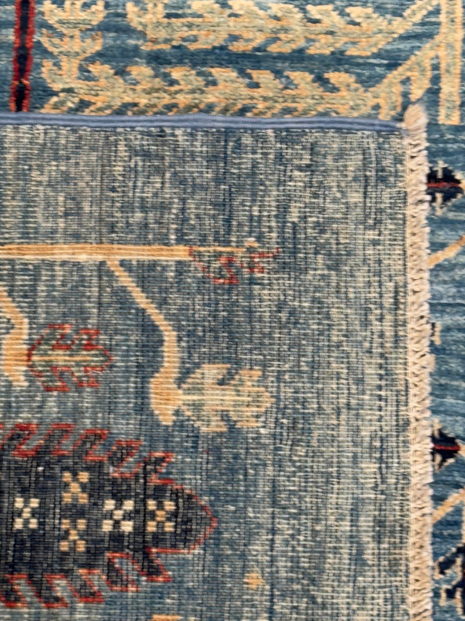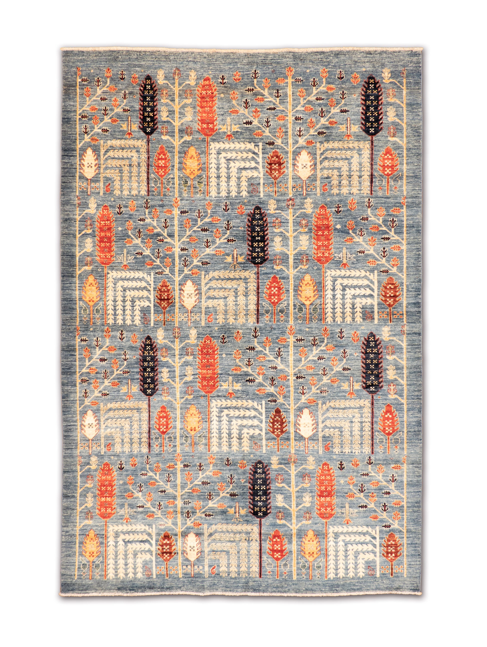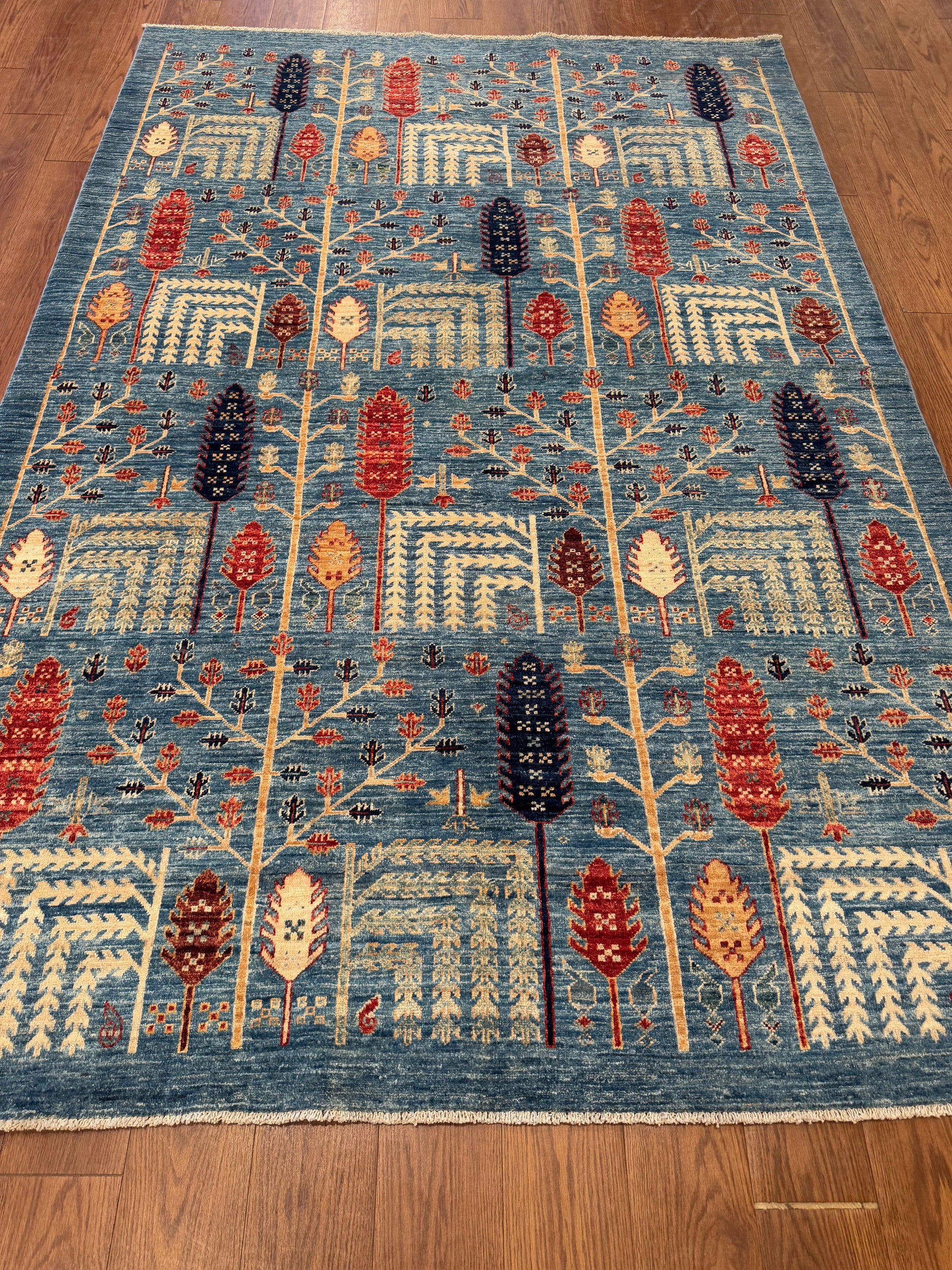 This striking handwoven wool rug features a vivid sky-blue background decorated with stylized botanical motifs in shades of red, ivory, navy, and gold. The repeating pattern of leaves and branches creates a rhythmic and balanced design, bringing both vibrancy and elegance to the piece. Its lively yet sophisticated palette makes it an ideal focal point for a wide range of interiors.