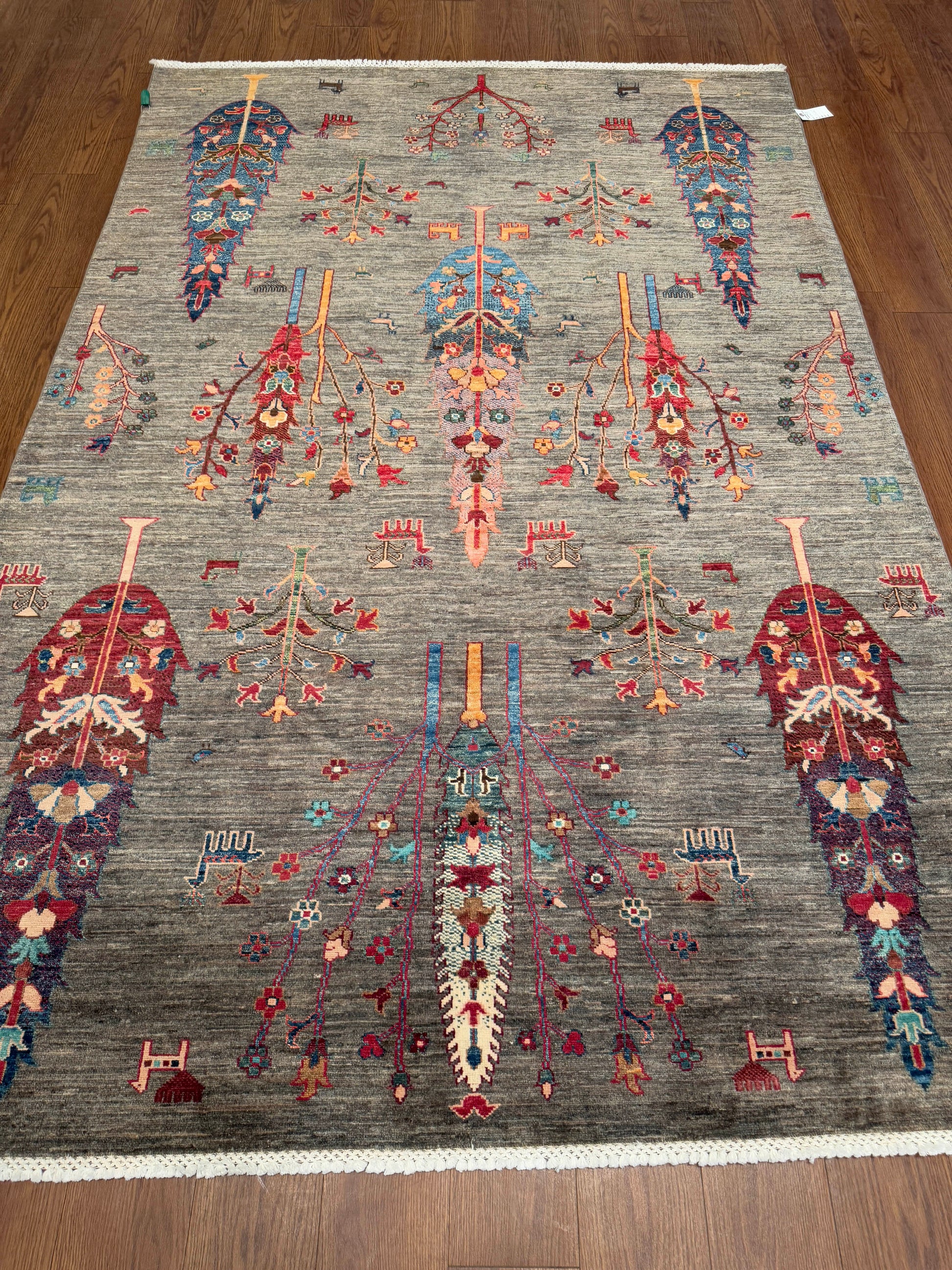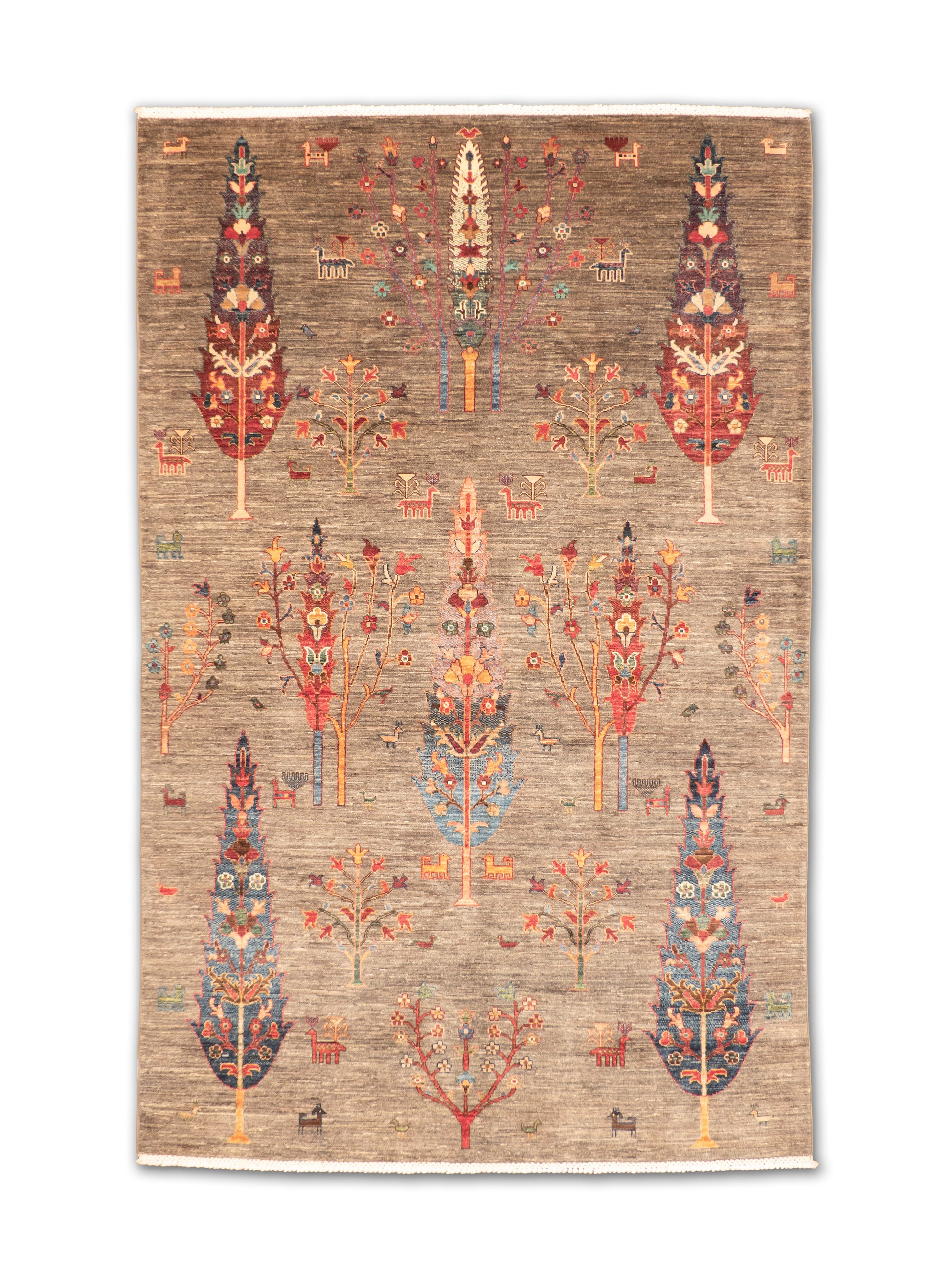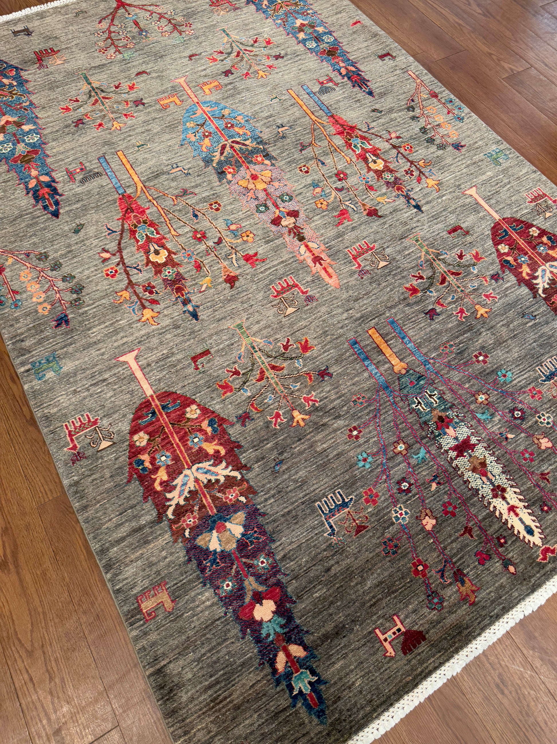 This striking hand-knotted rug showcases tall stylized tree motifs arranged vertically across a soft gray field. Accented with floral and symbolic tribal details, the design uses rich tones of red, blue, orange, ivory, and teal to create a bold, artistic presence. Its unique composition brings both tradition and modern flair, making it a standout centerpiece in any room.