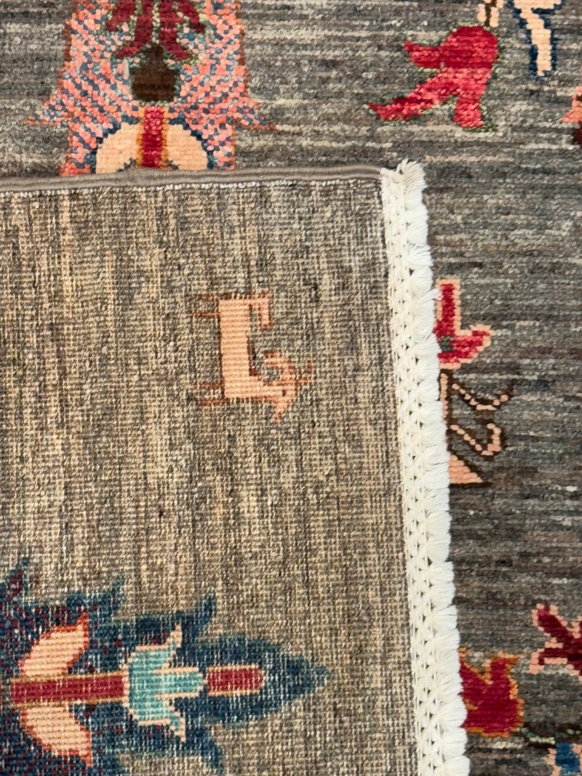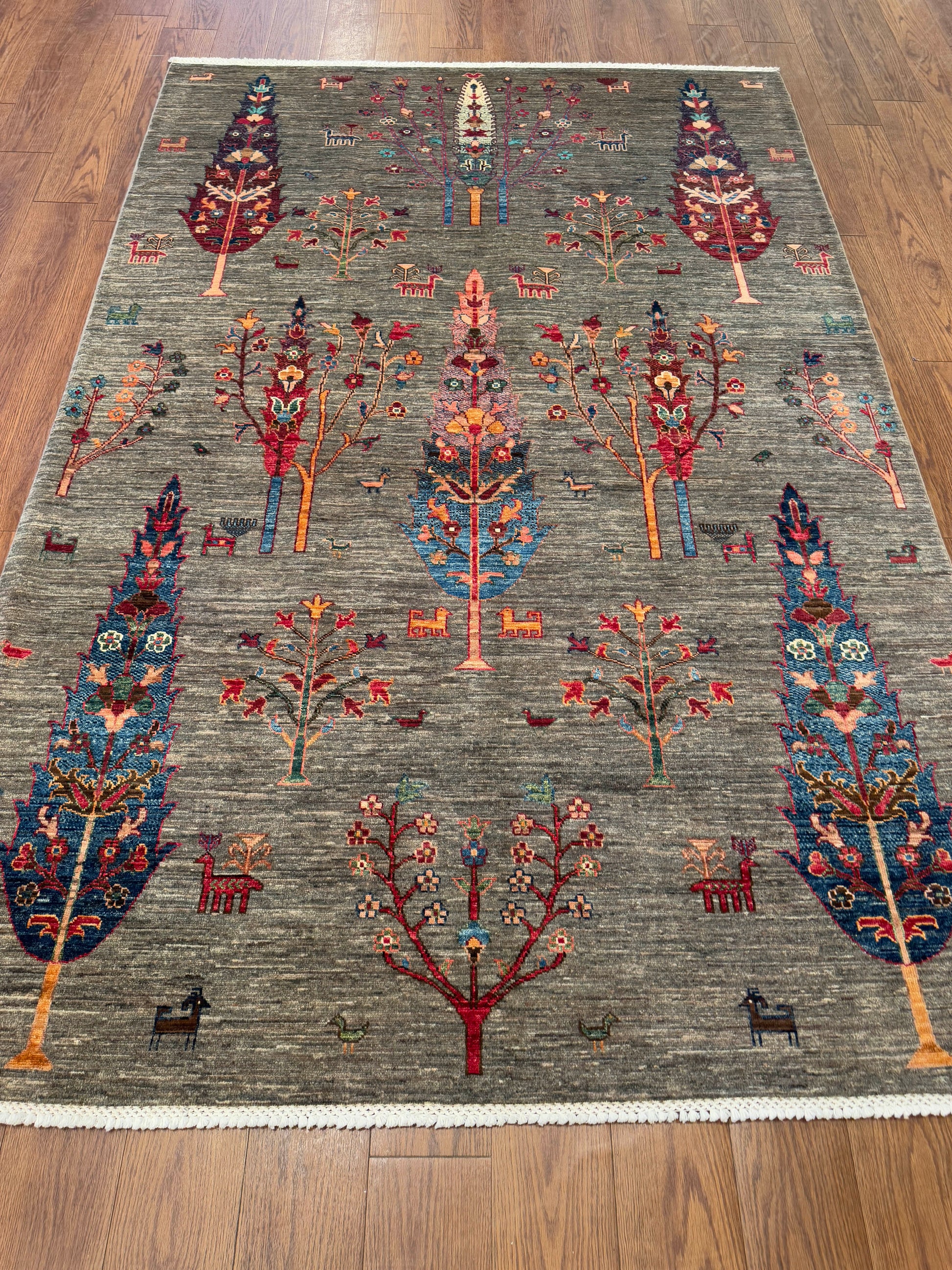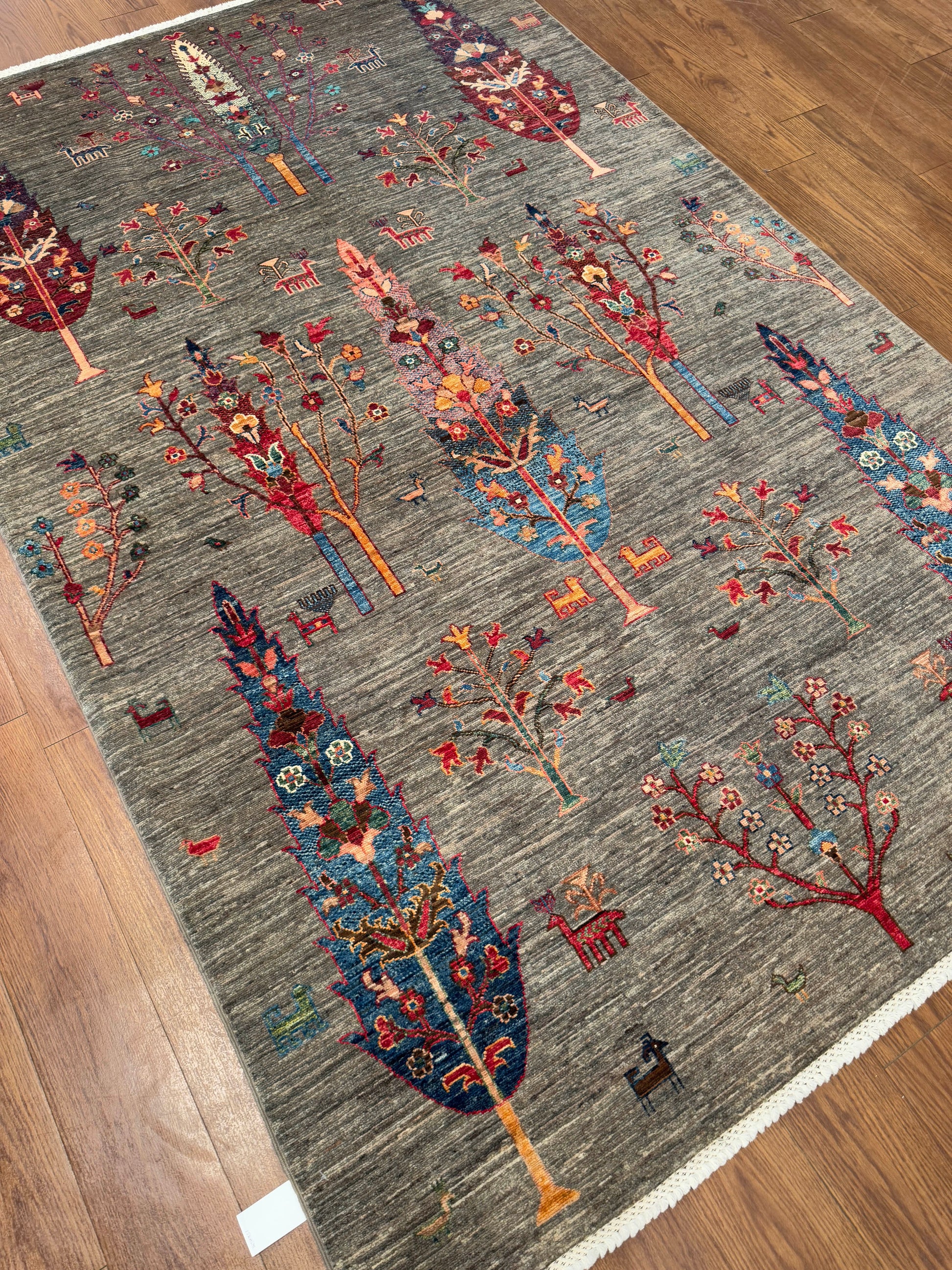 This striking hand-knotted rug showcases tall stylized tree motifs arranged vertically across a soft gray field. Accented with floral and symbolic tribal details, the design uses rich tones of red, blue, orange, ivory, and teal to create a bold, artistic presence. Its unique composition brings both tradition and modern flair, making it a standout centerpiece in any room.
