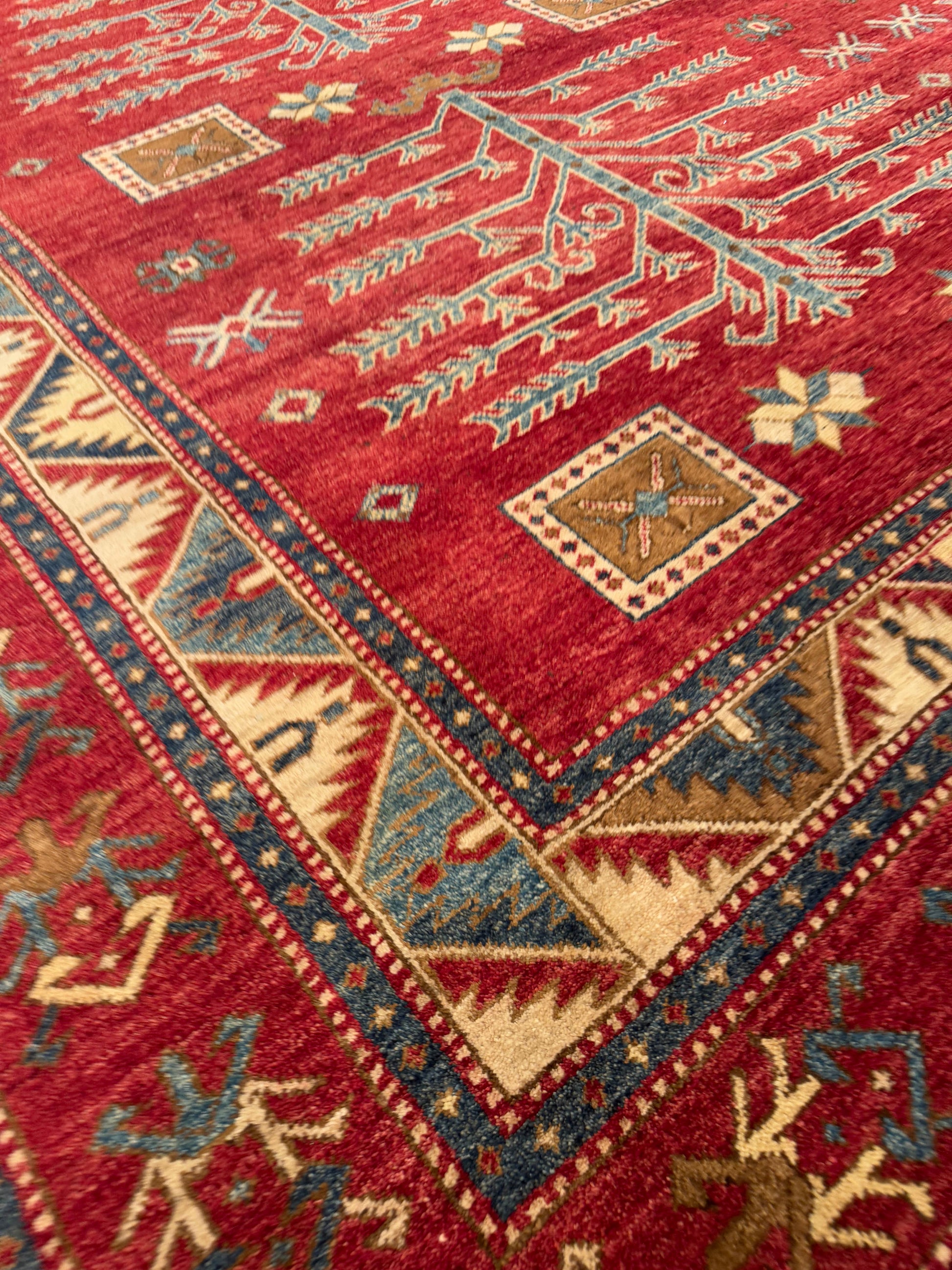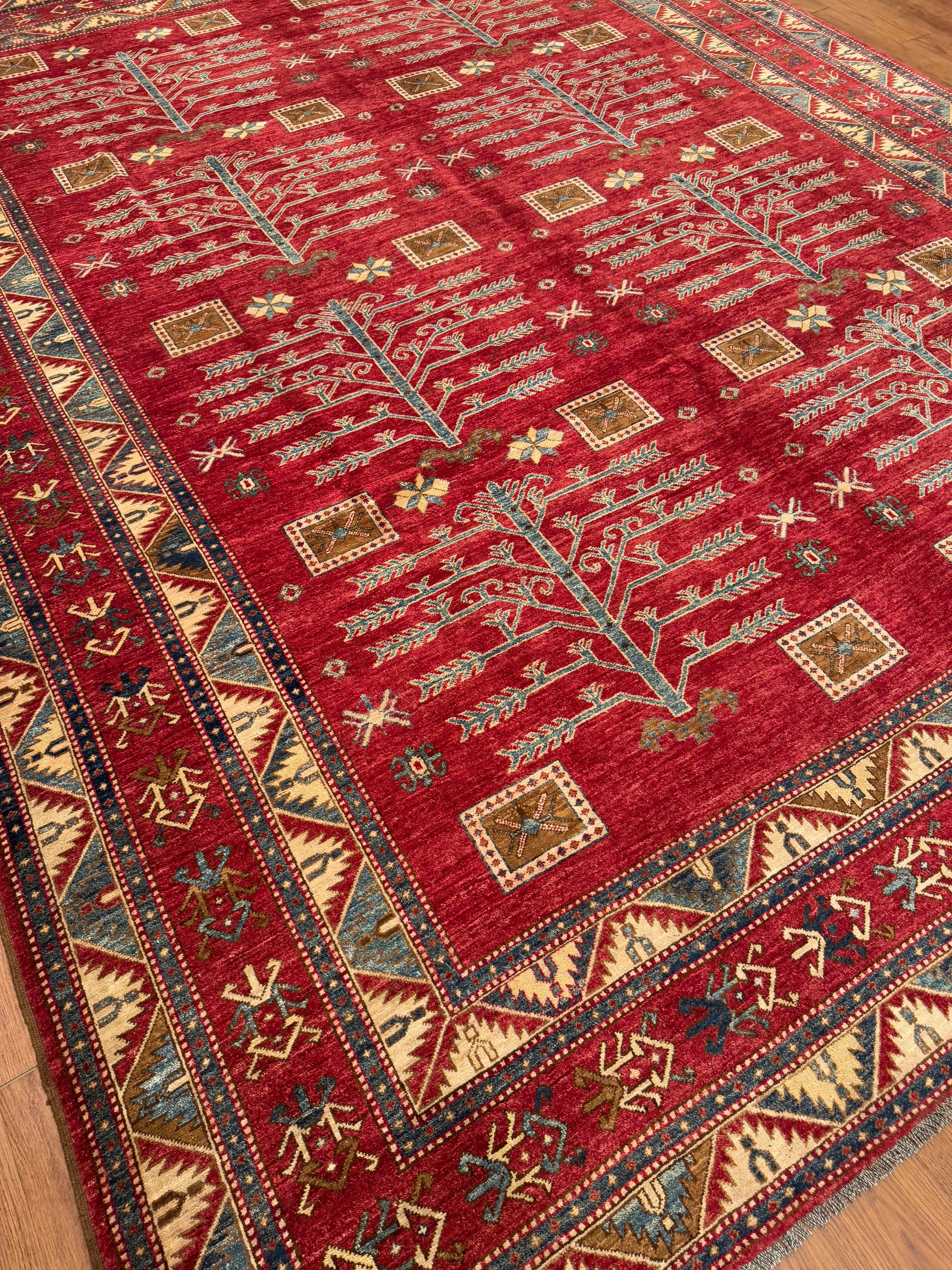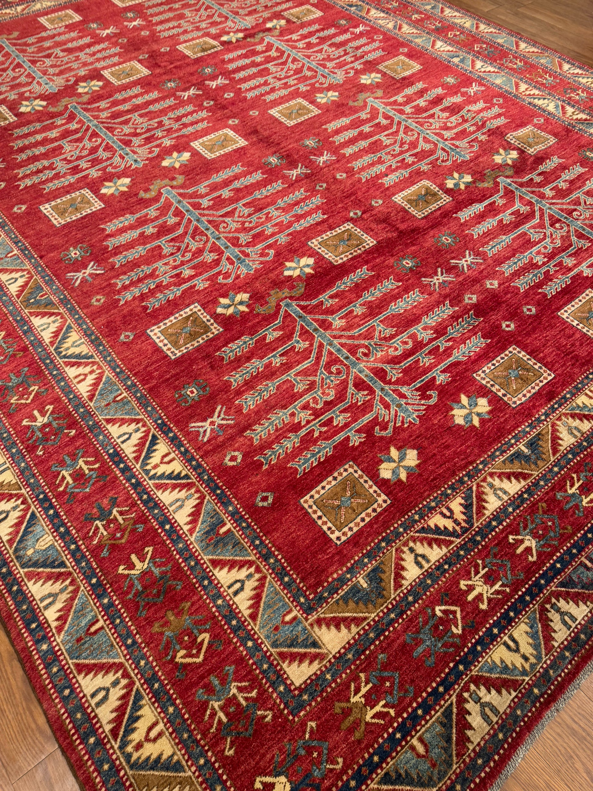 This striking handwoven rug features a bold red field enriched with symmetrical geometric and tree motifs, embodying balance and vitality. Accents of teal, ivory, and gold bring depth and vibrance, while the intricate border framing completes its refined tribal character. Perfect for adding warmth and cultural charm to any space.
