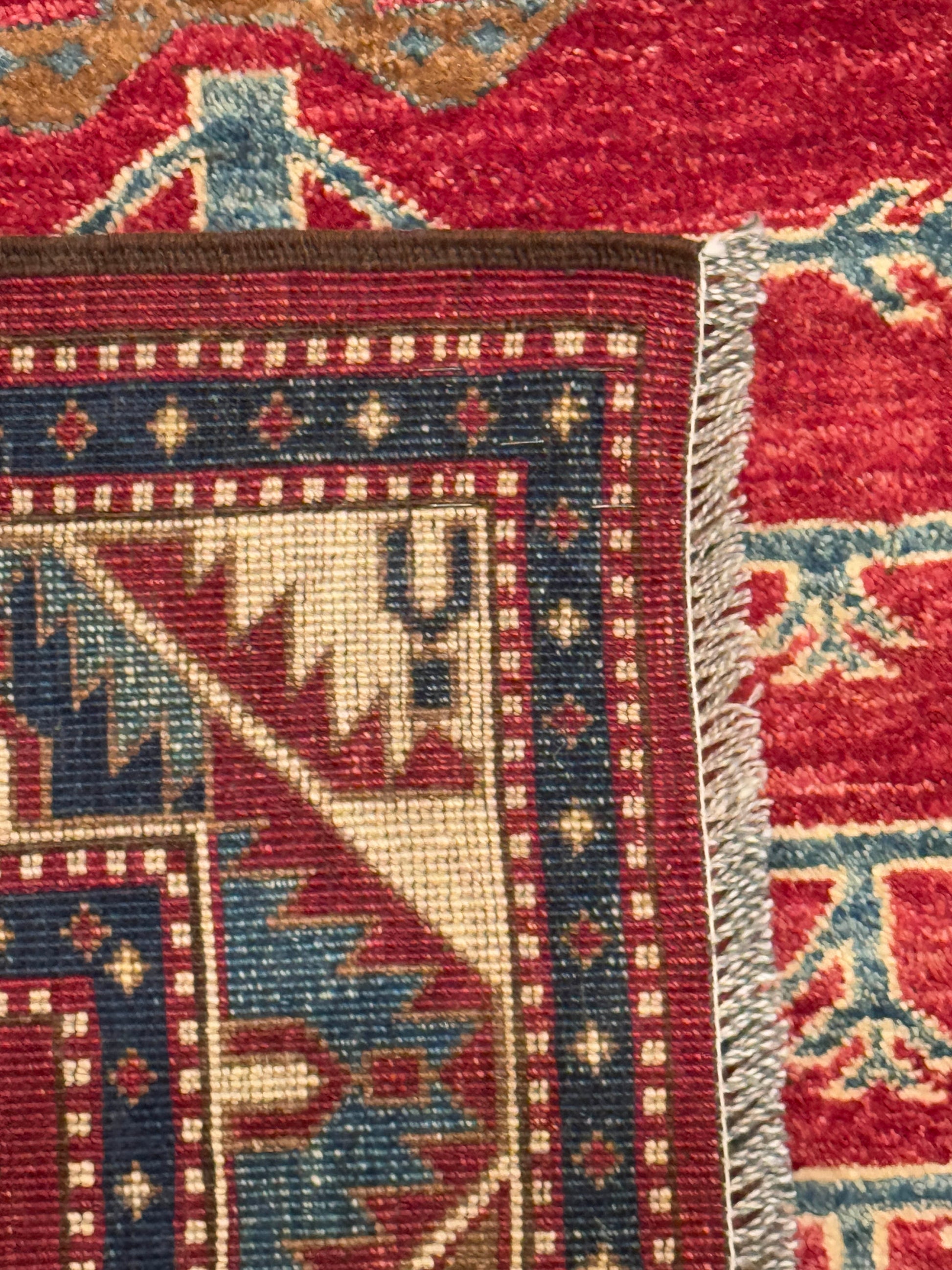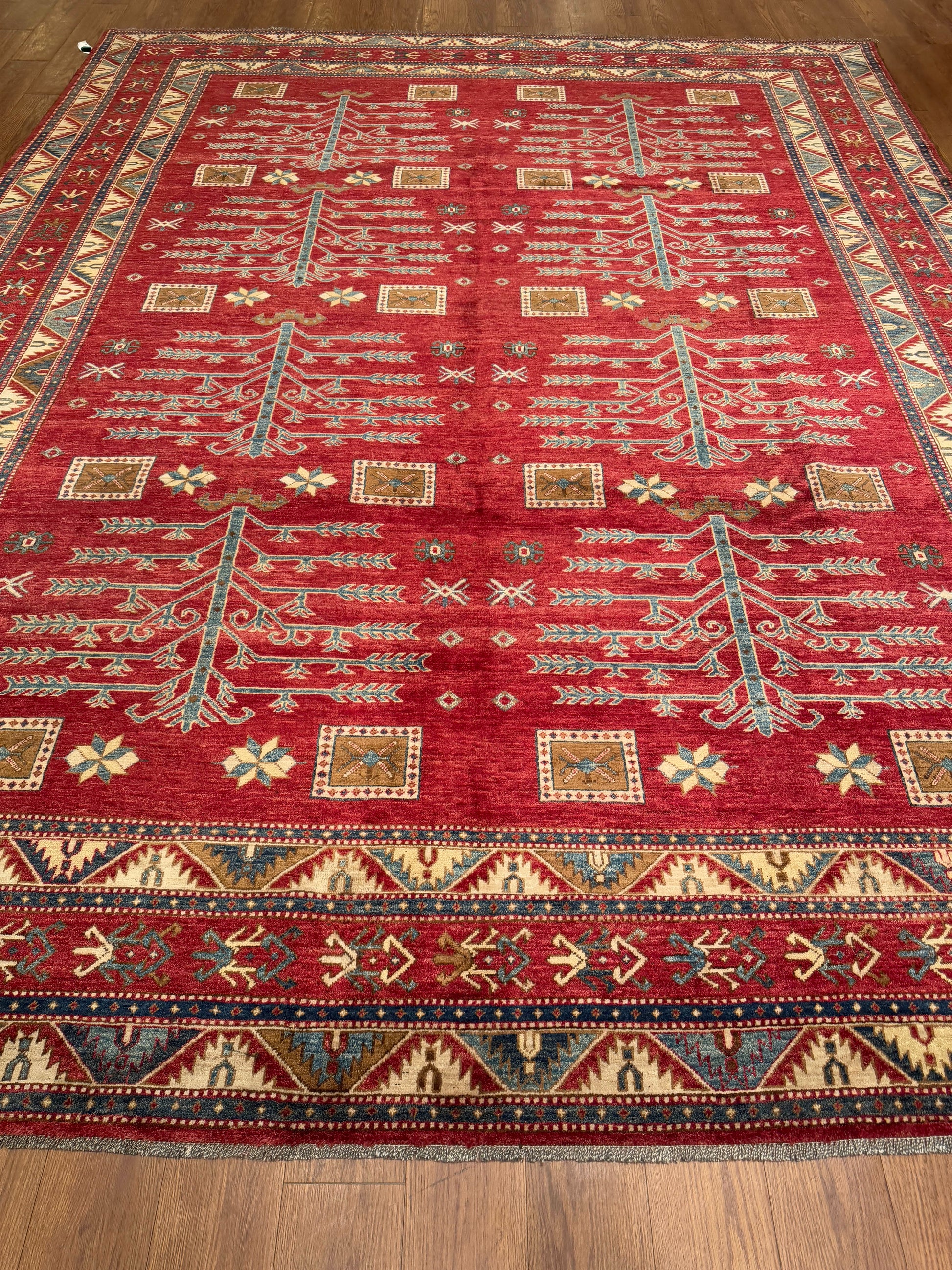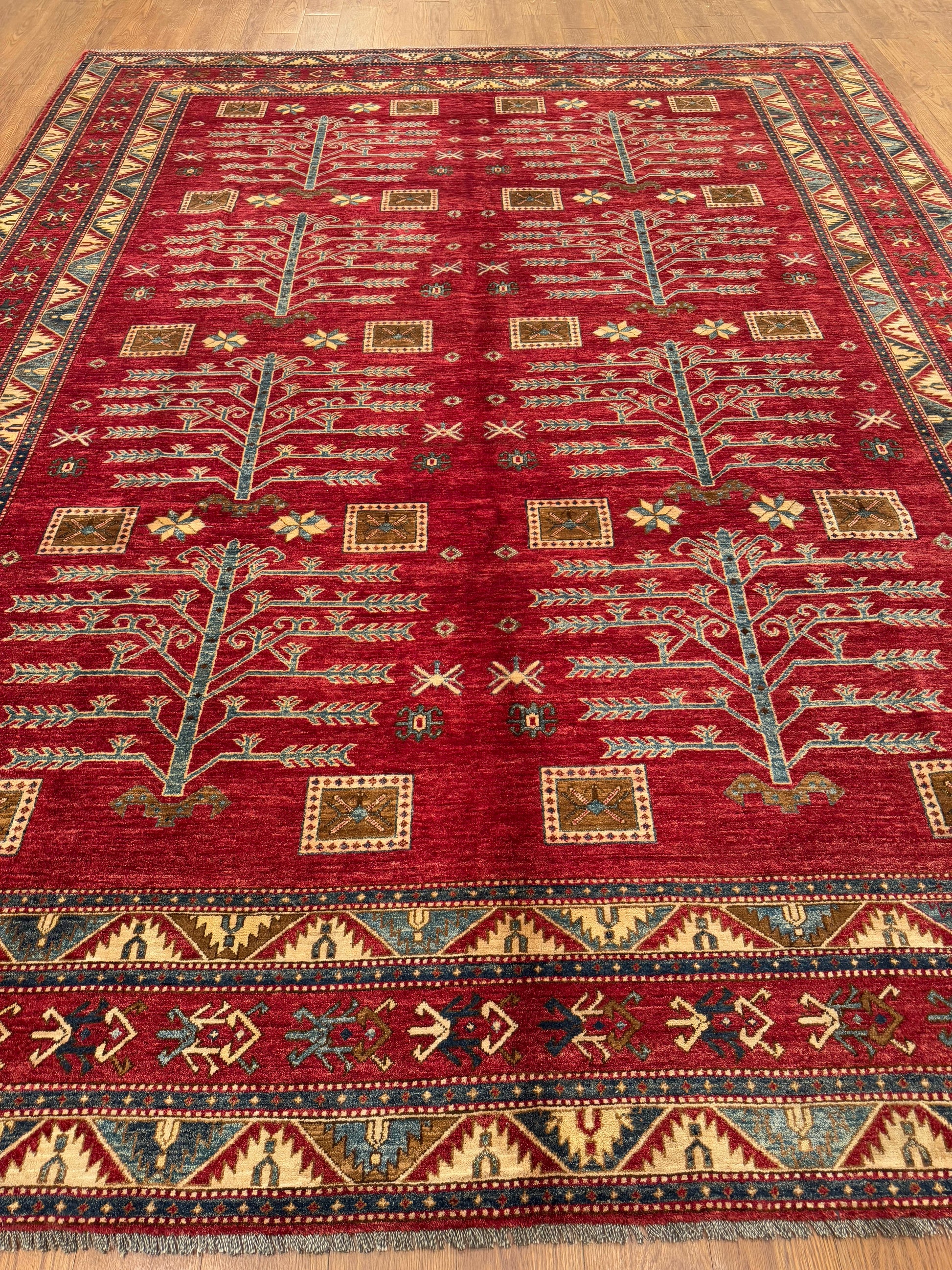 This striking handwoven rug features a bold red field enriched with symmetrical geometric and tree motifs, embodying balance and vitality. Accents of teal, ivory, and gold bring depth and vibrance, while the intricate border framing completes its refined tribal character. Perfect for adding warmth and cultural charm to any space.