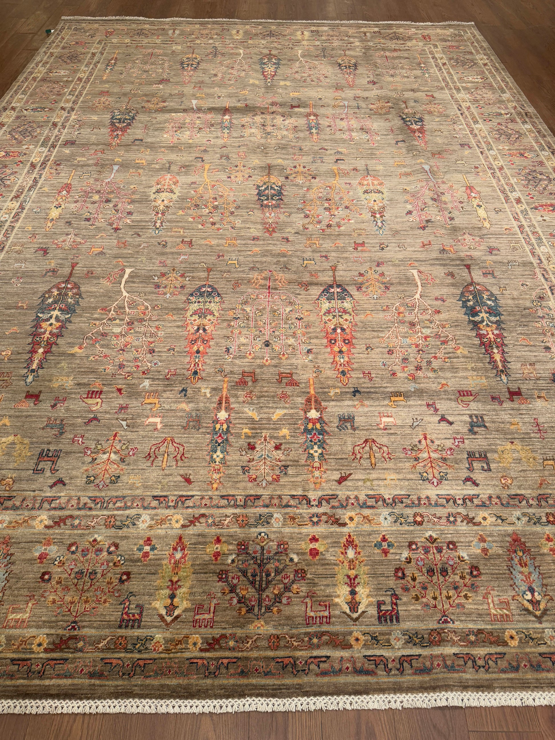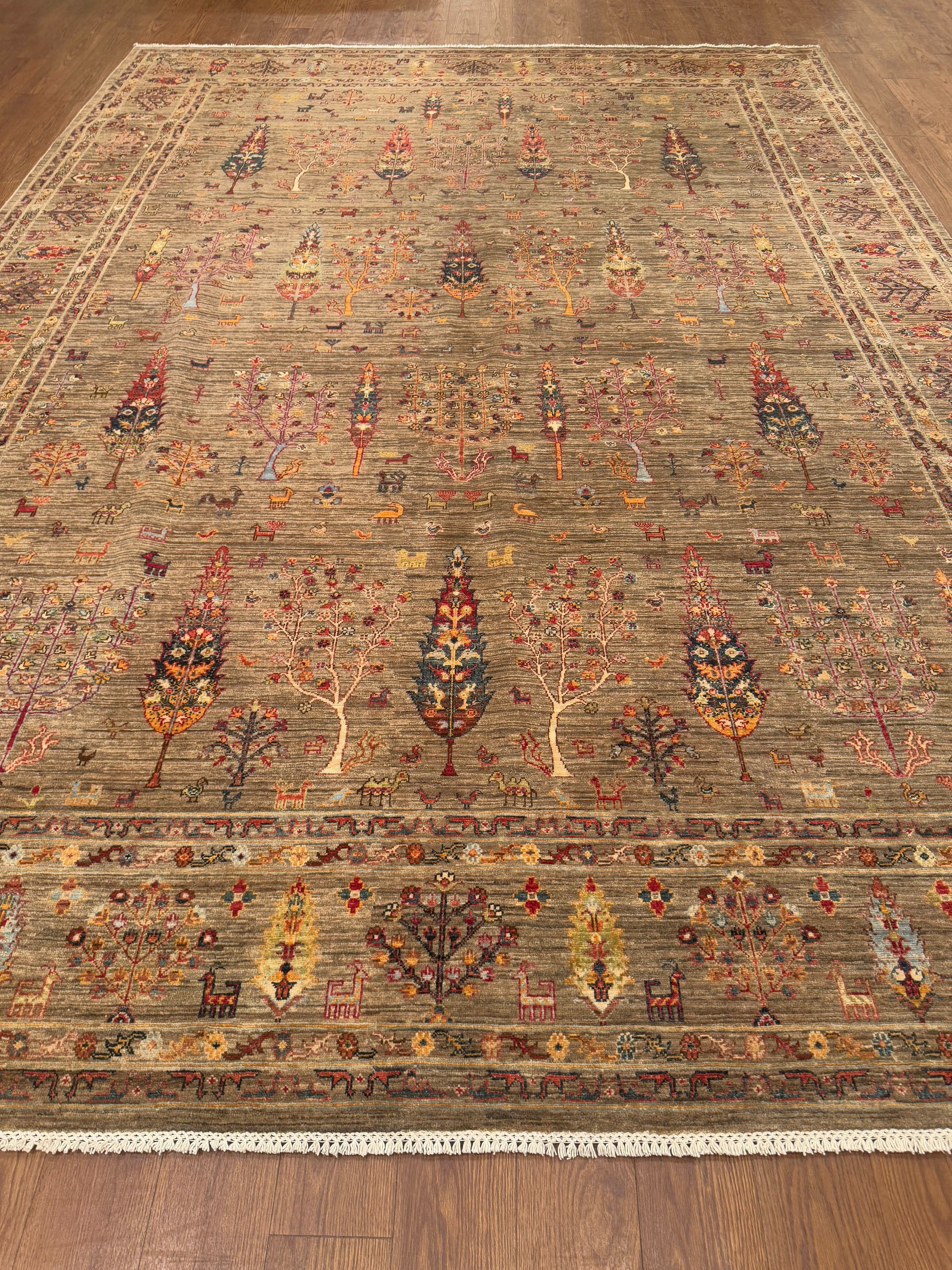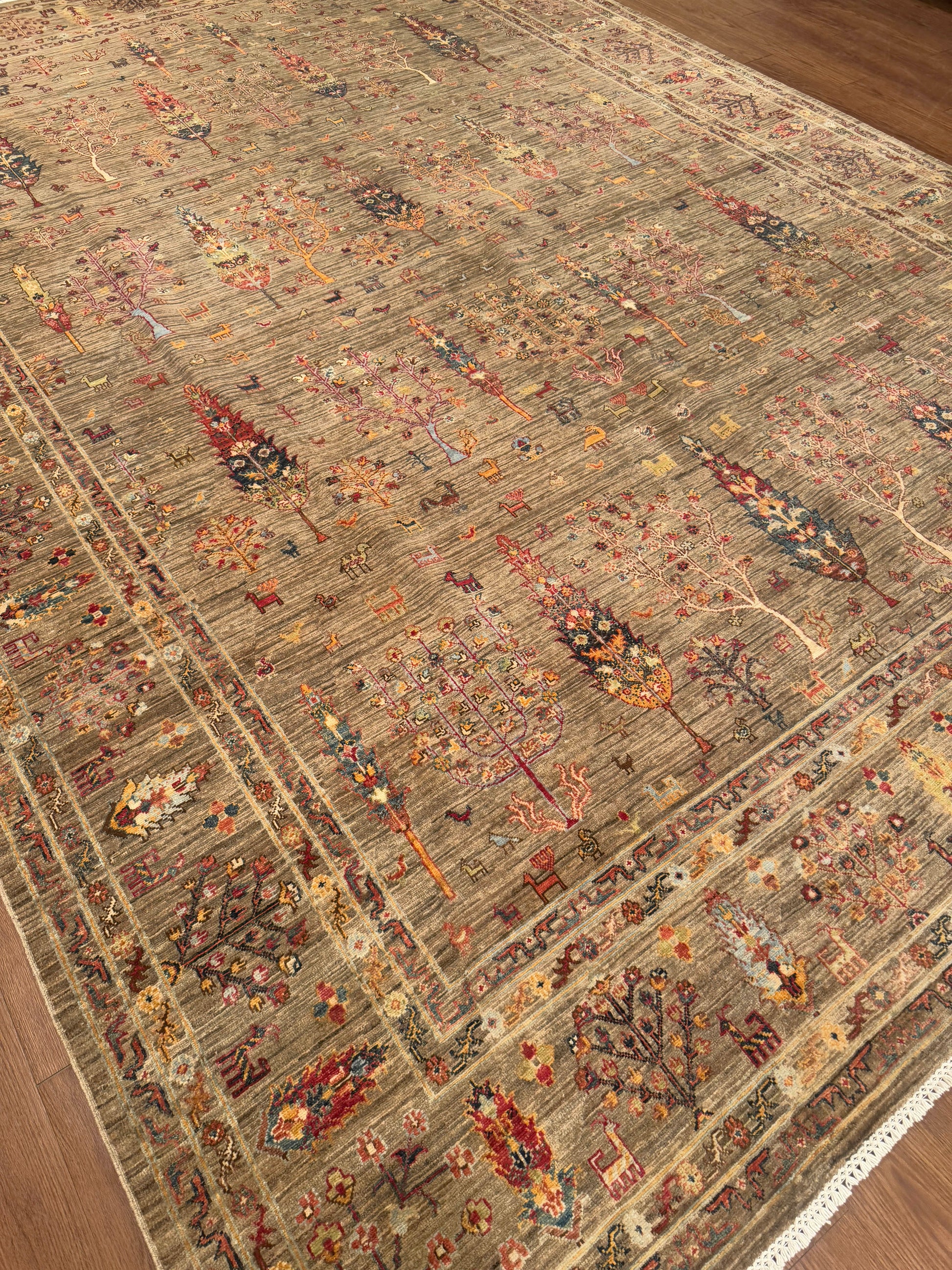 This handmade rug showcases an enchanting tree design with intricate botanical and animal motifs woven across a soft taupe field. Delicate shades of coral, gold, blue, and ivory bring the detailed foliage and figures to life, creating a scene that feels both organic and symbolic. Meticulously crafted from fine wool, this rug blends traditional storytelling with elegant artistry, making it a serene statement piece for refined interiors.