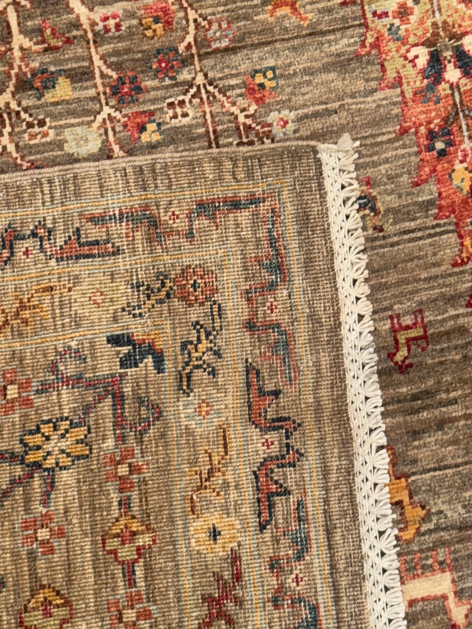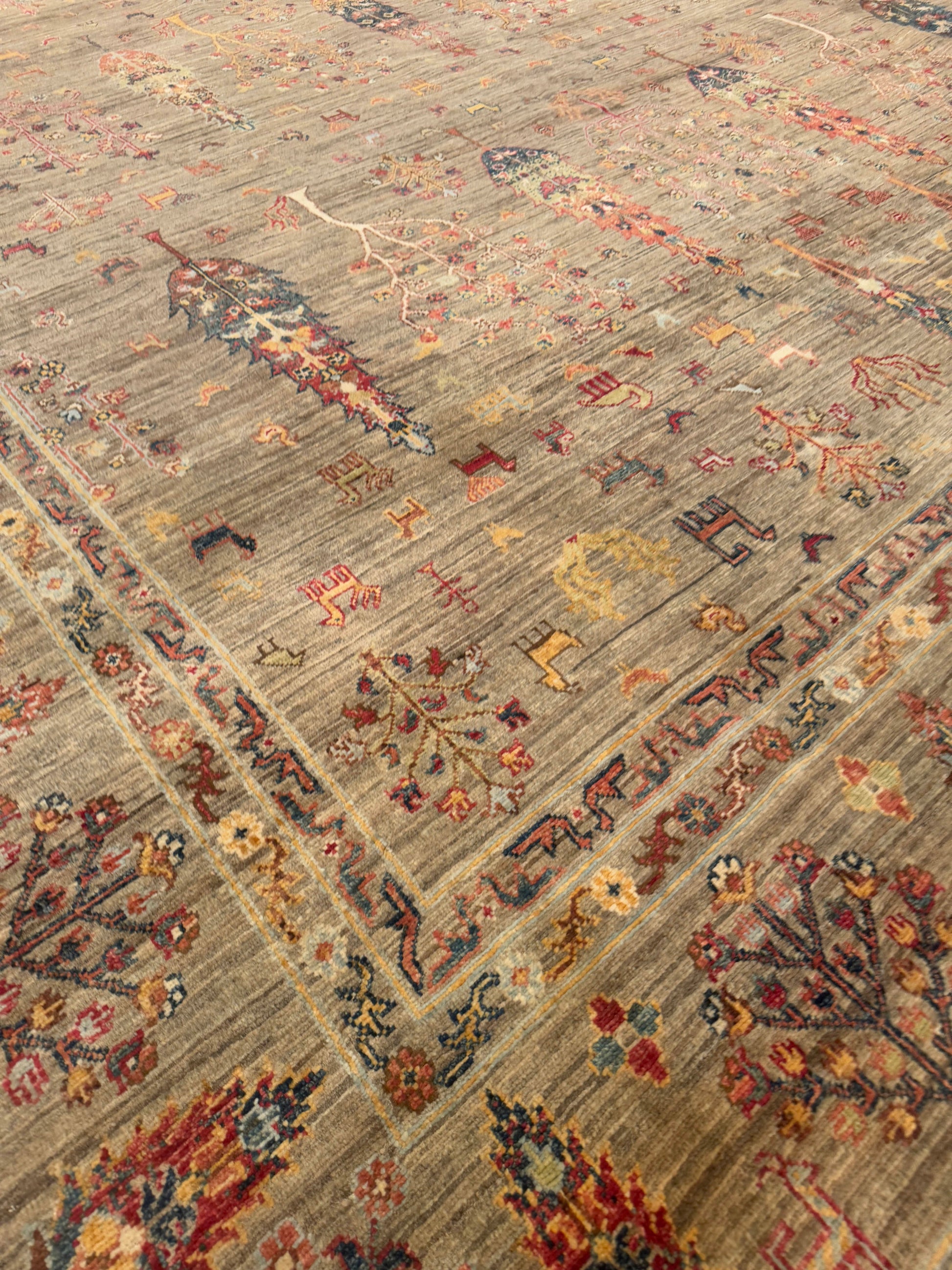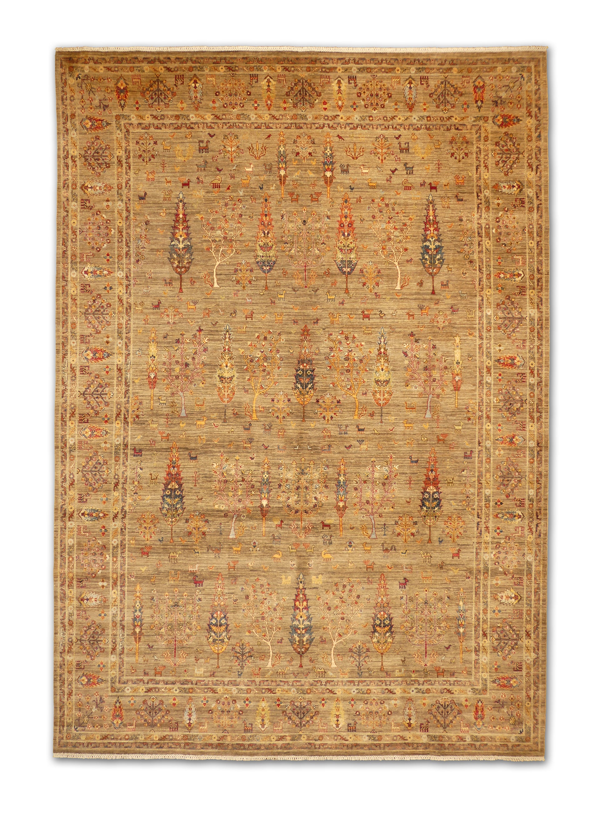 This handmade rug showcases an enchanting tree design with intricate botanical and animal motifs woven across a soft taupe field. Delicate shades of coral, gold, blue, and ivory bring the detailed foliage and figures to life, creating a scene that feels both organic and symbolic. Meticulously crafted from fine wool, this rug blends traditional storytelling with elegant artistry, making it a serene statement piece for refined interiors.