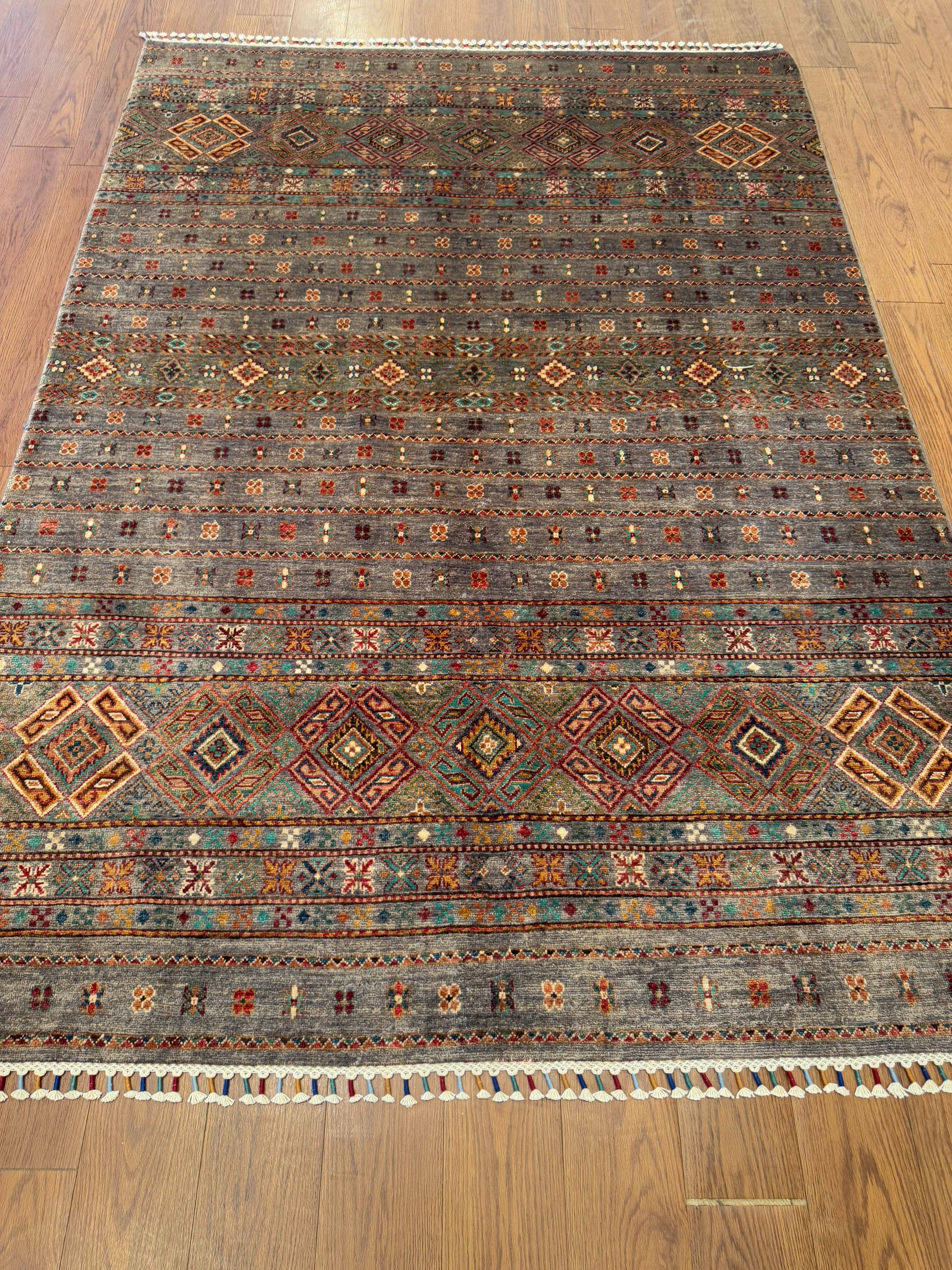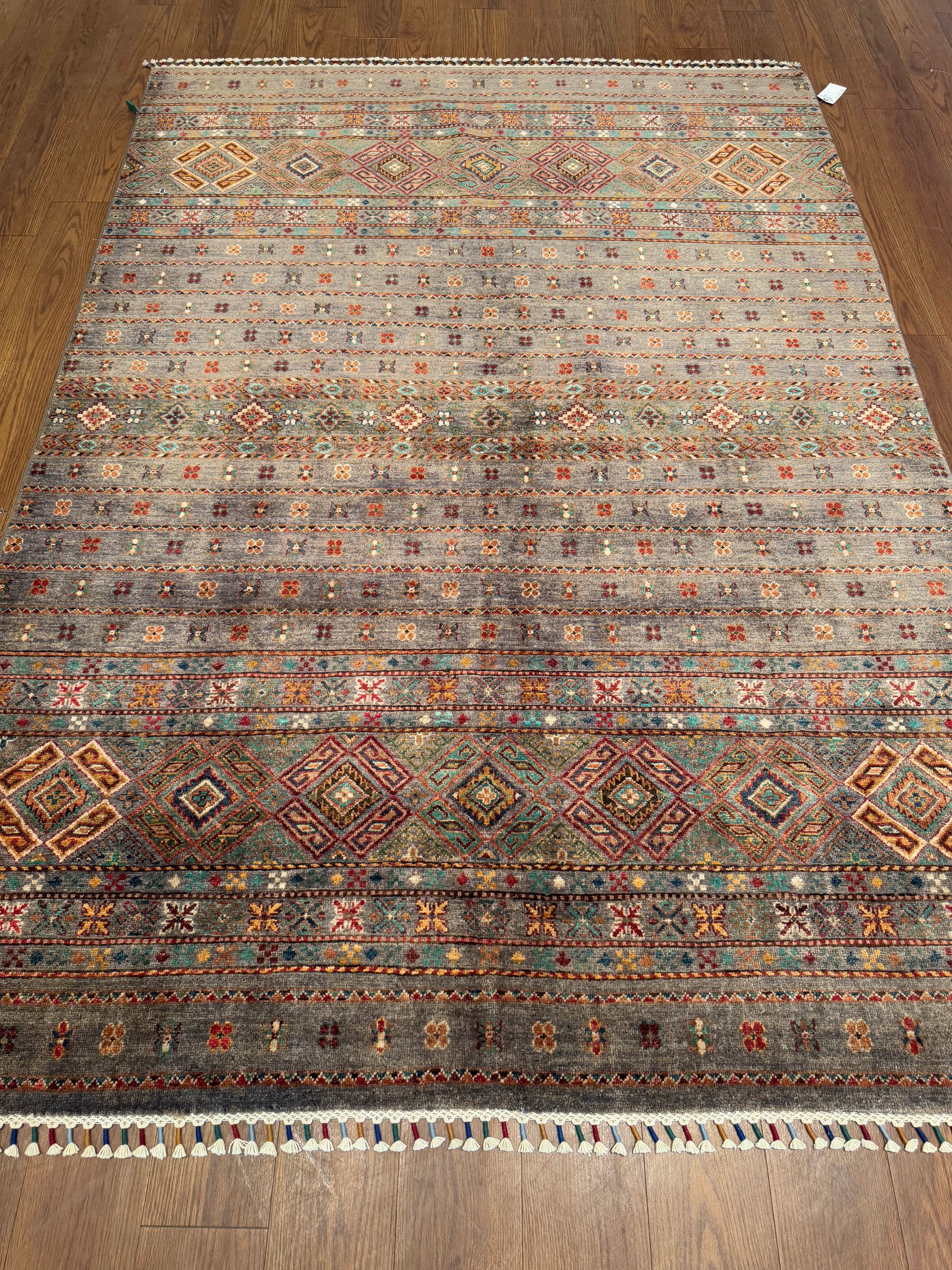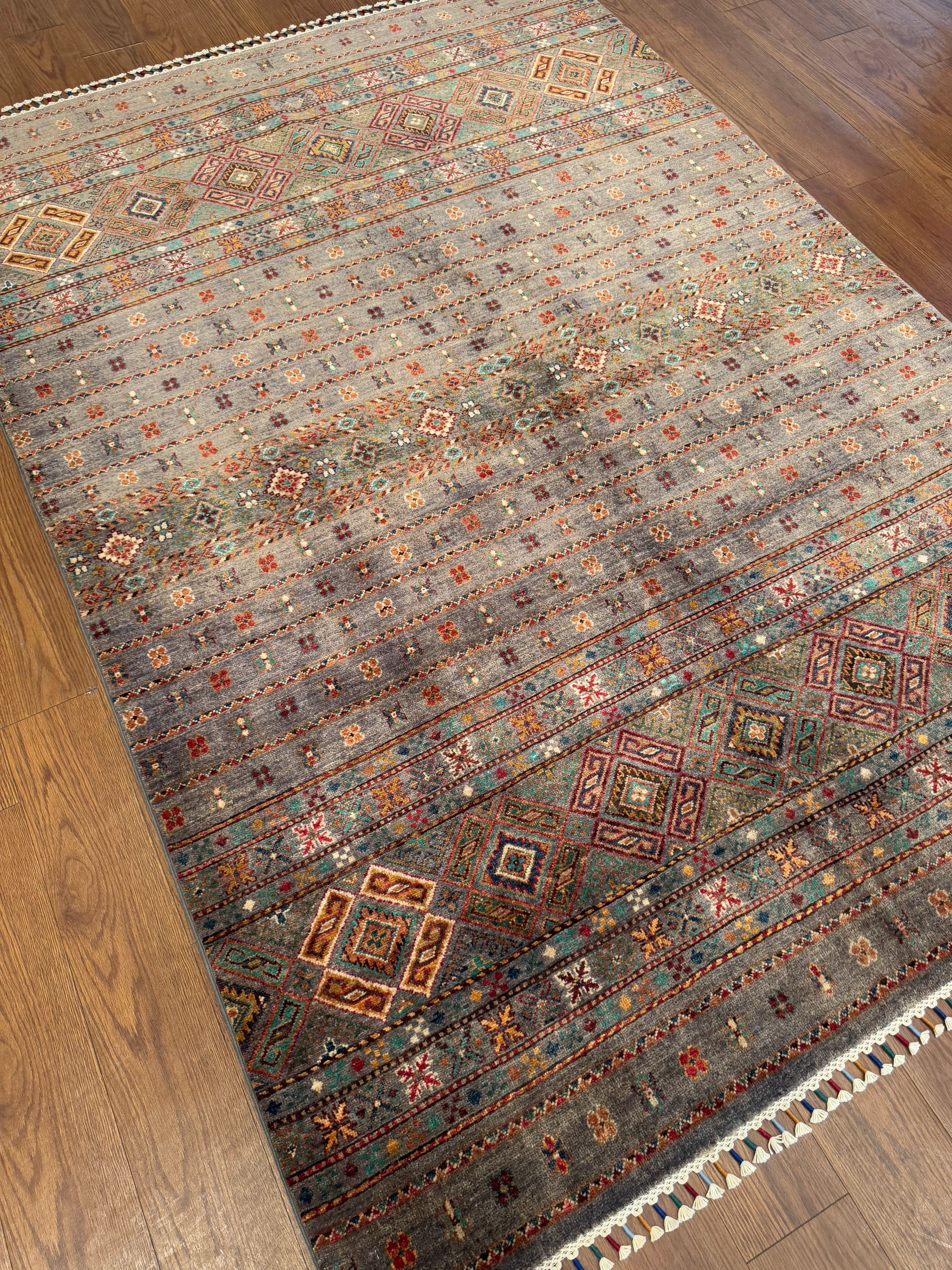 This rug presents a beautifully weathered, earthy elegance with its muted taupe-gray field enriched by rows of tribal diamond medallions and petite floral motifs. Subtle accents of rust, teal, gold, and deep red add warmth and depth, while the intricate border design showcases the artistry of traditional weaving. Finished with tasseled edges, this piece blends rustic authenticity with refined craftsmanship—perfect for grounding modern or eclectic interiors.